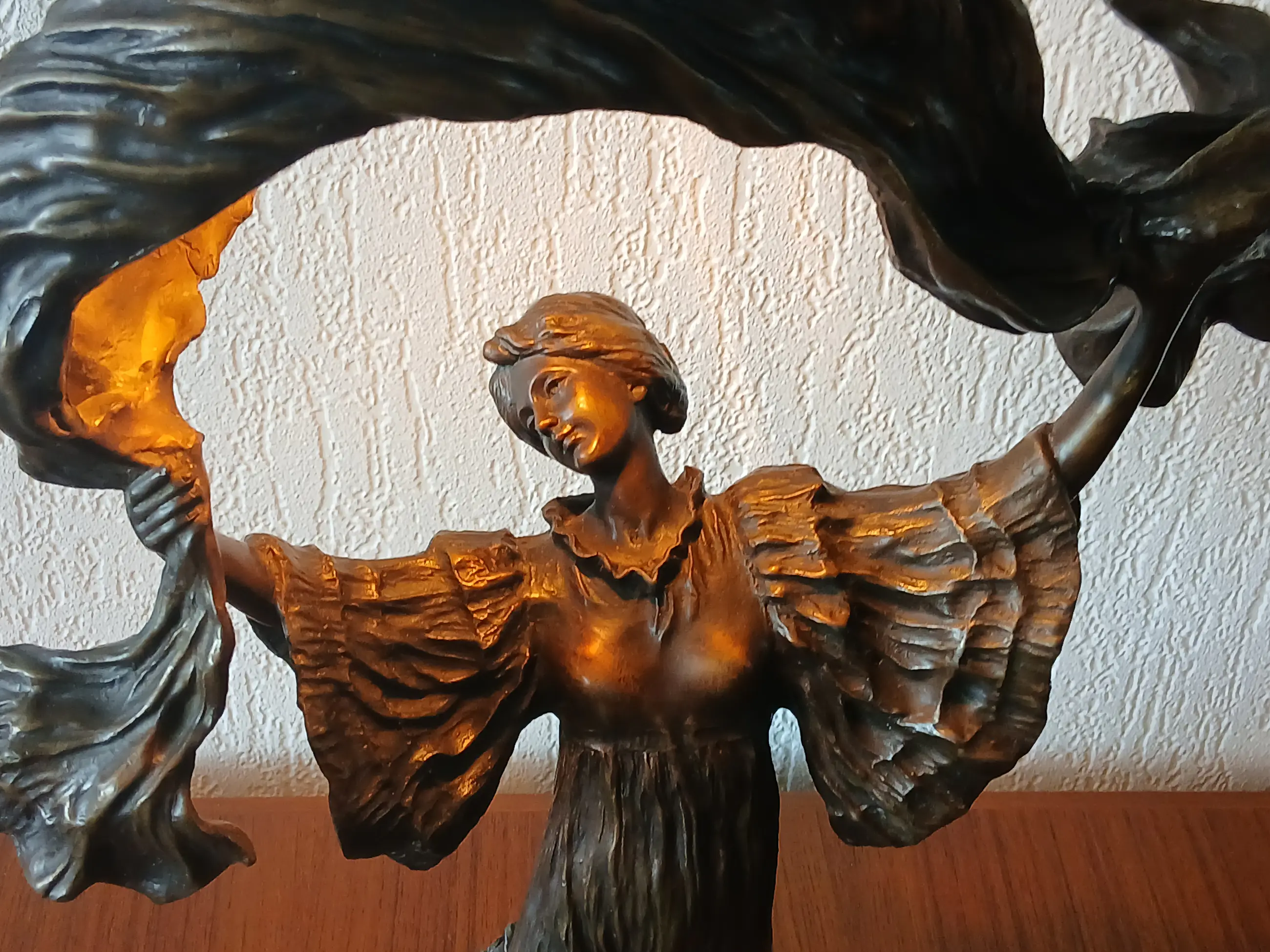 Deze bronzen lamp weegt 6,5 kg. De lamp is 48 cm hoog en 35 cm breed en in nette staat zonder beschadigingen .