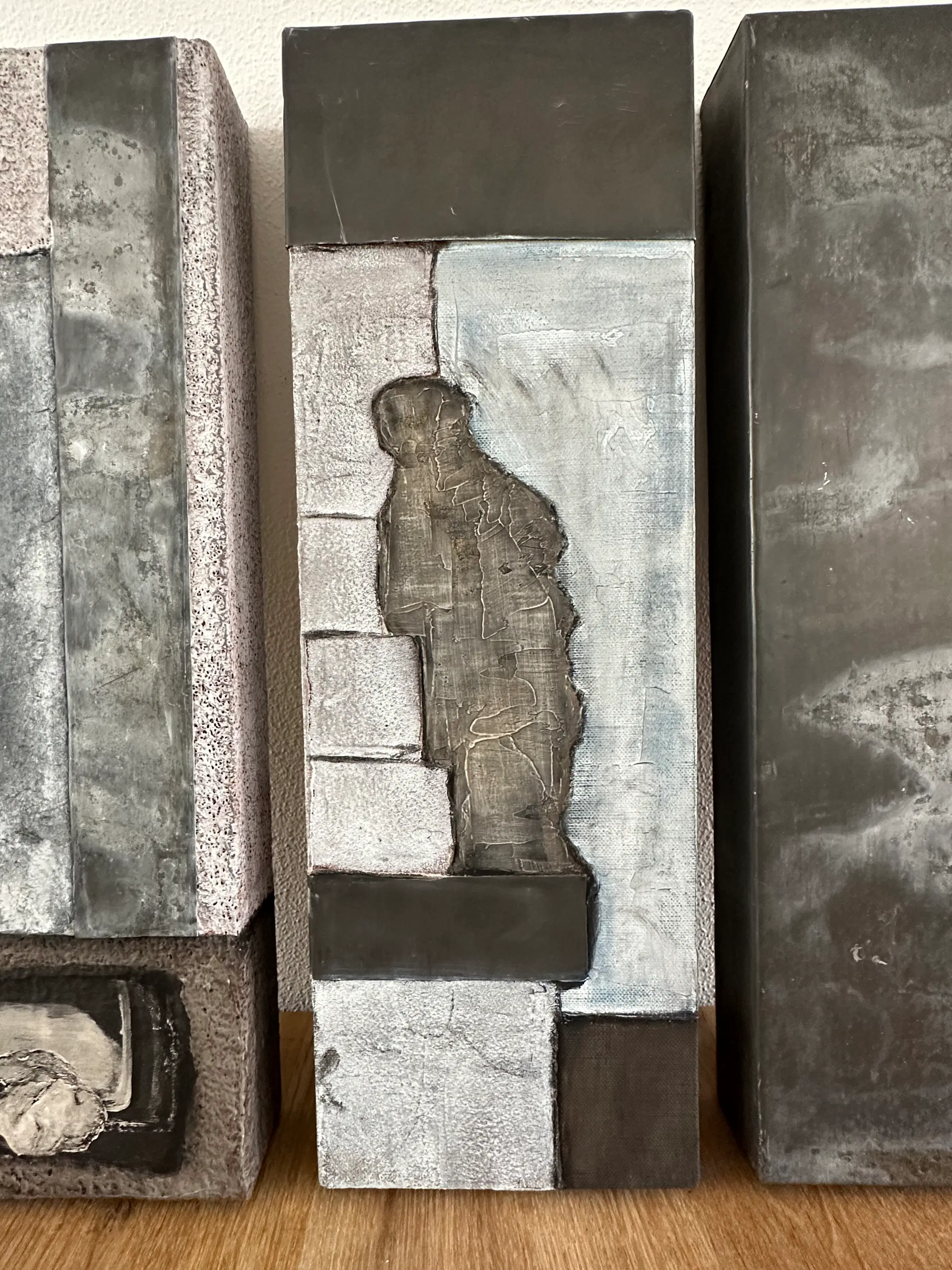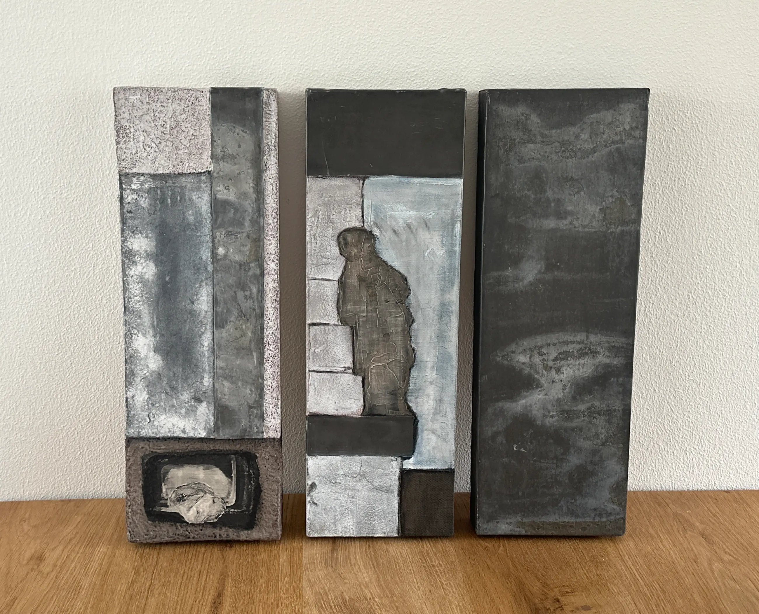 Dit werk is uitgevoerd in gemengde techniek en kenmerkt zich door een gelaagde opbouw met subtiele structuren en rustige grijstinten. Het middelste paneel bevat een ingetogen figuratieve vorm, wat het geheel extra diepte en spanning geeft binnen de abstracte compositie.
