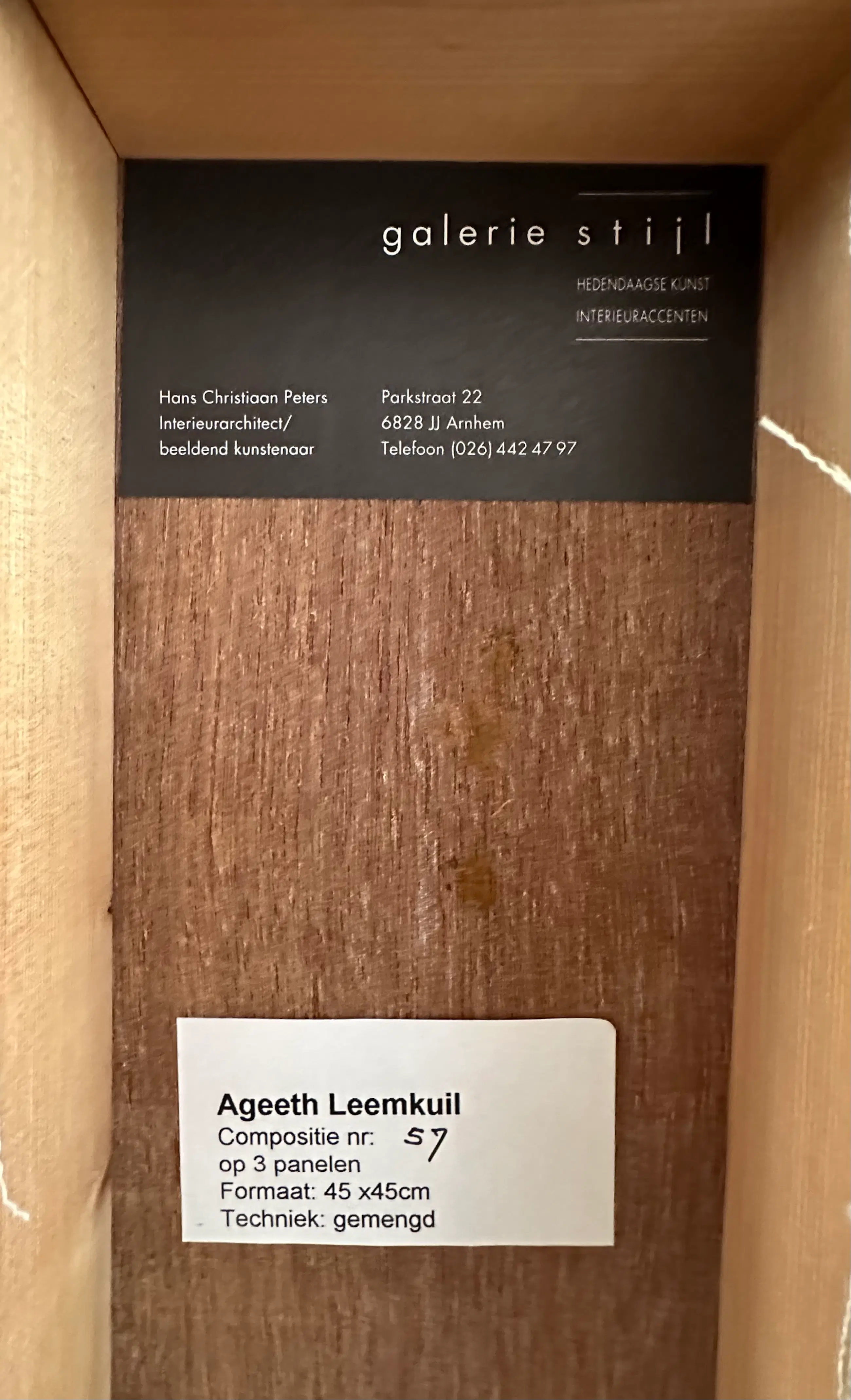 * Kunstenaar: Ageeth Leemkuil * Titel: Compositie nr. 57 * Techniek: gemengde techniek * Aantal: 3 panelen (3-luik) * Afmetingen: ca. 15 x 45 cm per paneel, samen 45 x45 cm * Herkomst: Galerie Stijl (Arnhem) * Gesigneerd: ja (achterzijde) * Conditie: goede staat, met lichte gebruikssporen/krasjes passend bij het materiaal en de techniek (zie laatste foto)