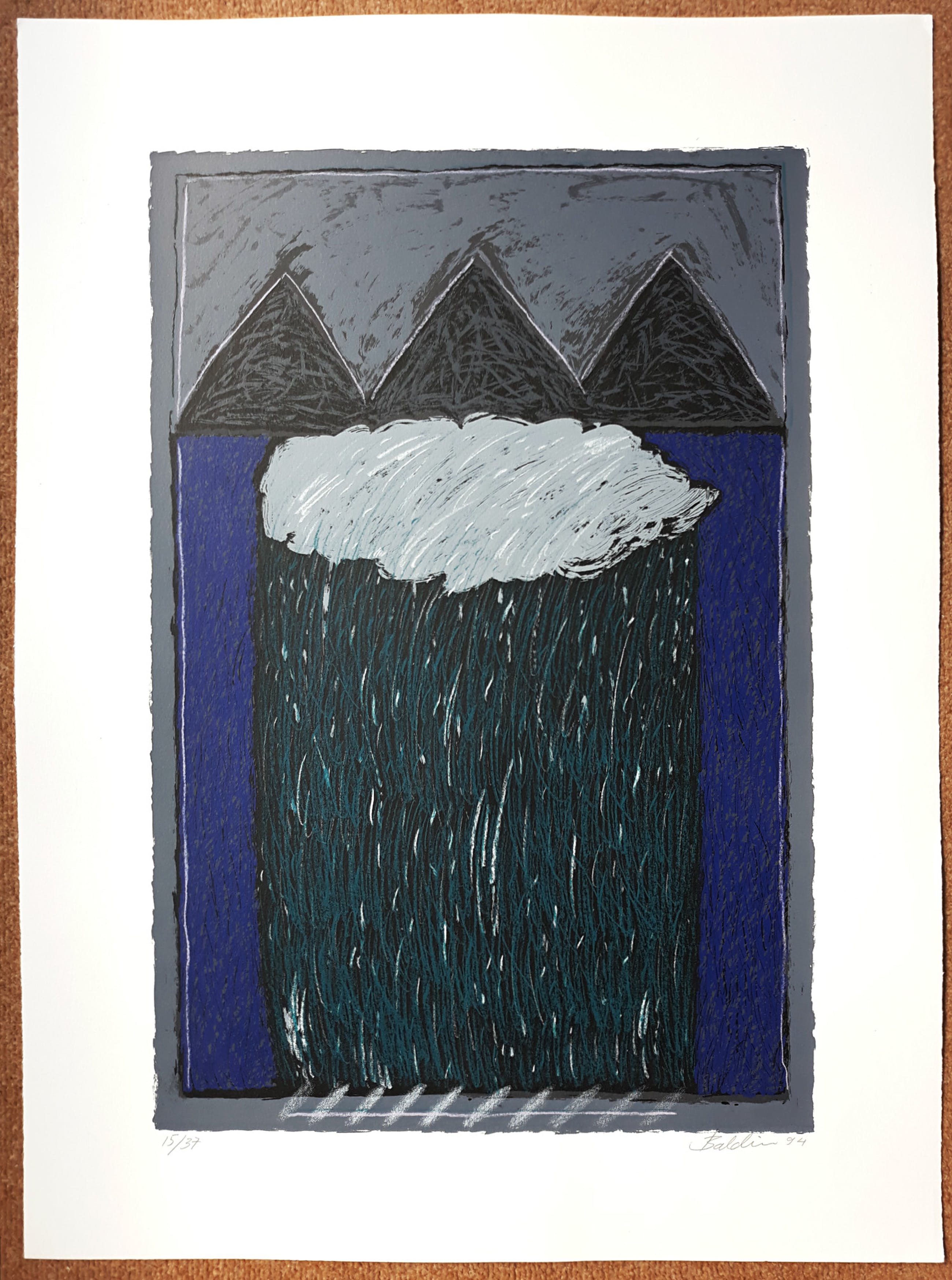 Strakke compositie van Ahmad Baldin. Zeefdruk op geschept papier, met potlood gesigneerd, gedateerd (‘94) en genummerd (15/37). In uitstekende conditie, nooit ingelijst geweest.
