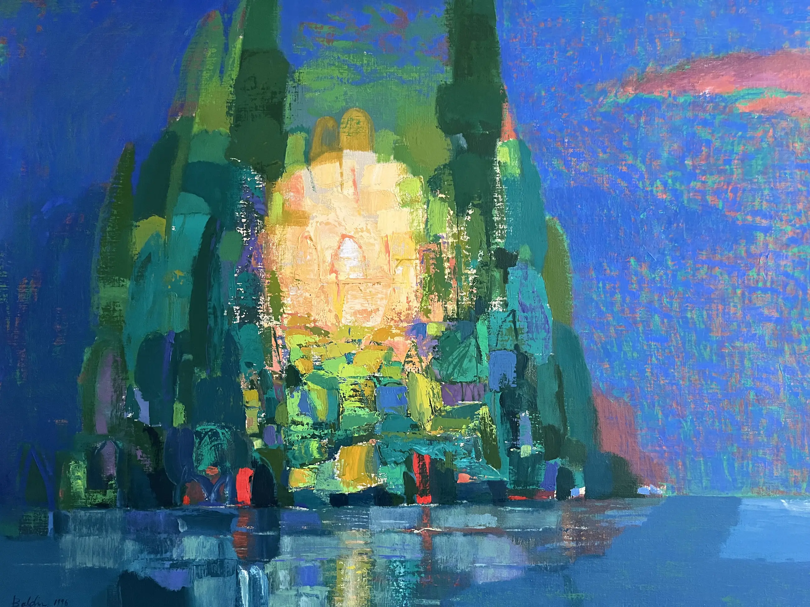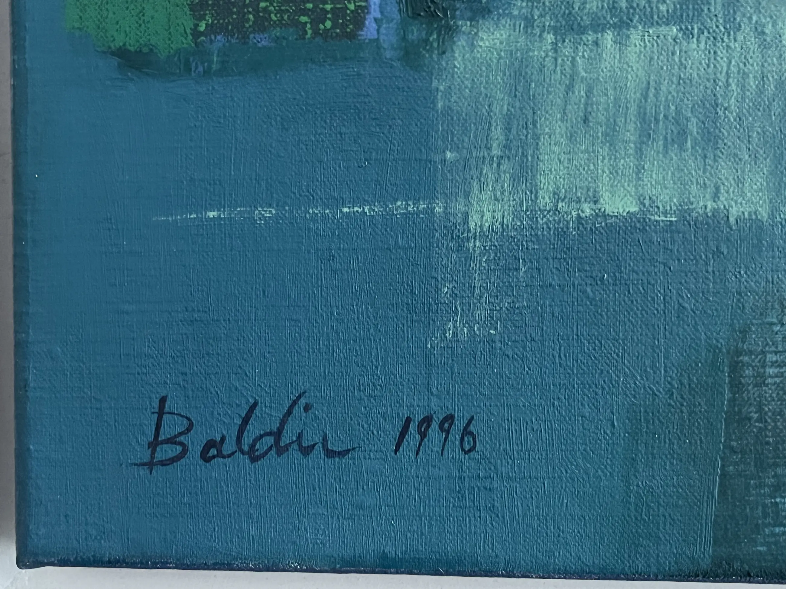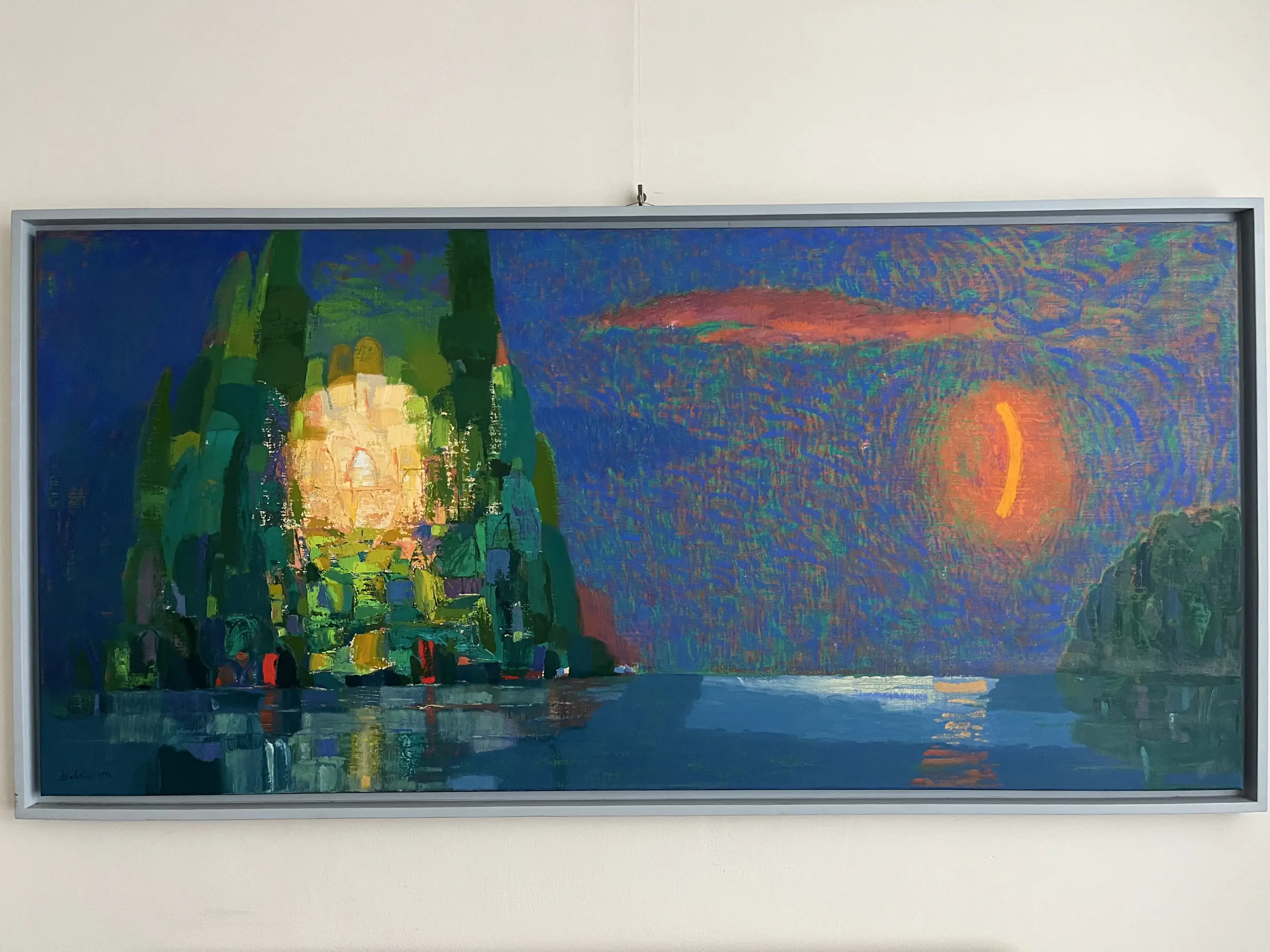 Fraai, sfeervol schilderij uit 1996. Doek is gelijst in bijpassende blauwgrijze houten baklijst. (lijst heeft op enkele plaatsen een likje verf nodig) Afmeting werk 80 x 170 cm. Inclusief lijst 86 x 176 cm. Bij de koop zitten twee boeken over de kunstenaar inbegrepen. Een boek is gesigneerd.