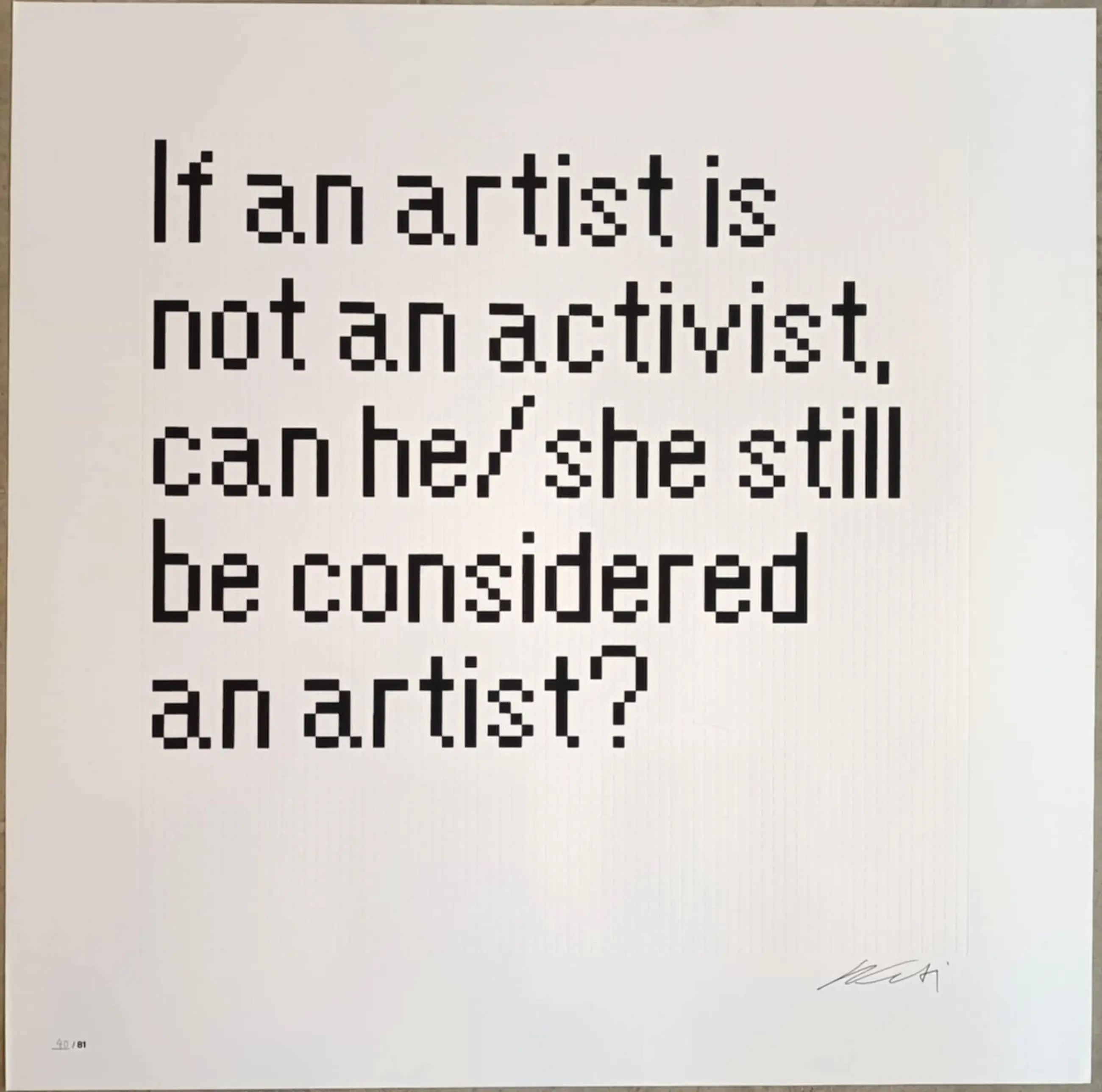 Ai Weiwei werd 81 dagen lang gevangen gehouden en ondervraagd door de Chinese overheid, een Kafkaëske ervaring. In deze serie laat hij AI hem 81 vragen stellen. AI symboliseert de onpersoonlijke, abstracte macht waaraan een individu in a autocratisch regime onderworpen is. De zeefdruk is opgebouwd uit een reliëf van pixels. De pixels symboliseren de vele politieke gevangenen in de wereld.