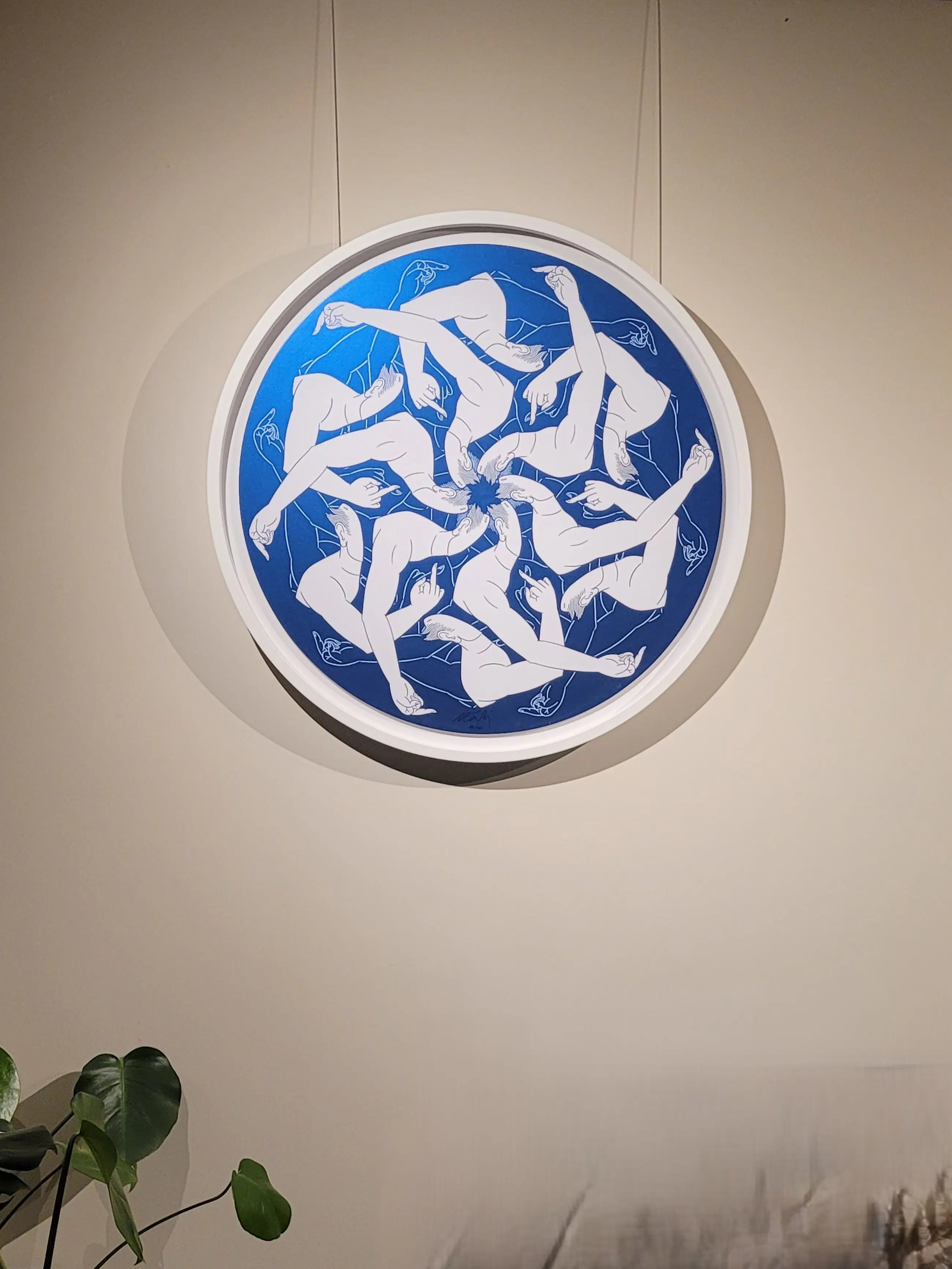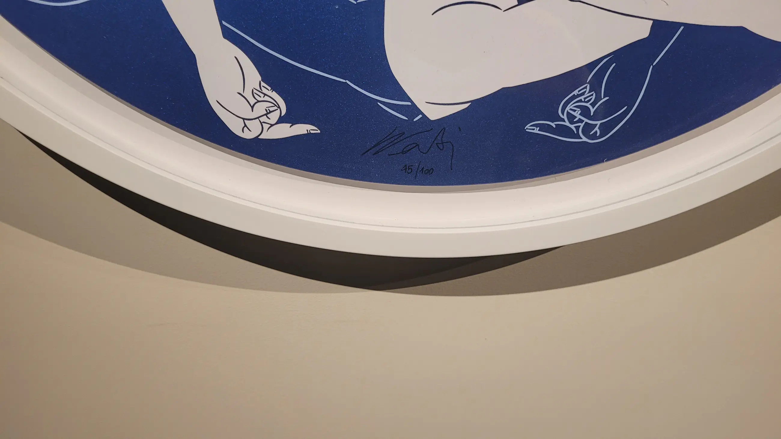 Ai Weiwei steekt opnieuw zijn middelvinger op in een zeefdruk-‘tondo’.In Circle in Blue straalt Weiwei’s iconische gebaar naar buiten in een doorlopende compositie. Weiwei begon het motief van de middelvinger te gebruiken in 1995, toen hij foto's maakte voor zijn serie Study of Perspective. In die serie stak Weiwei zijn middelvinger op naar historische monumenten, als een daad van verzet die het collectieve recht benadrukt om individuele overtuigingen te vormen, te behouden en te uiten. Voor de kunstenaar schuilt de kracht van zo’n eenvoudig gebaar in het feit dat iedereen het kan maken.