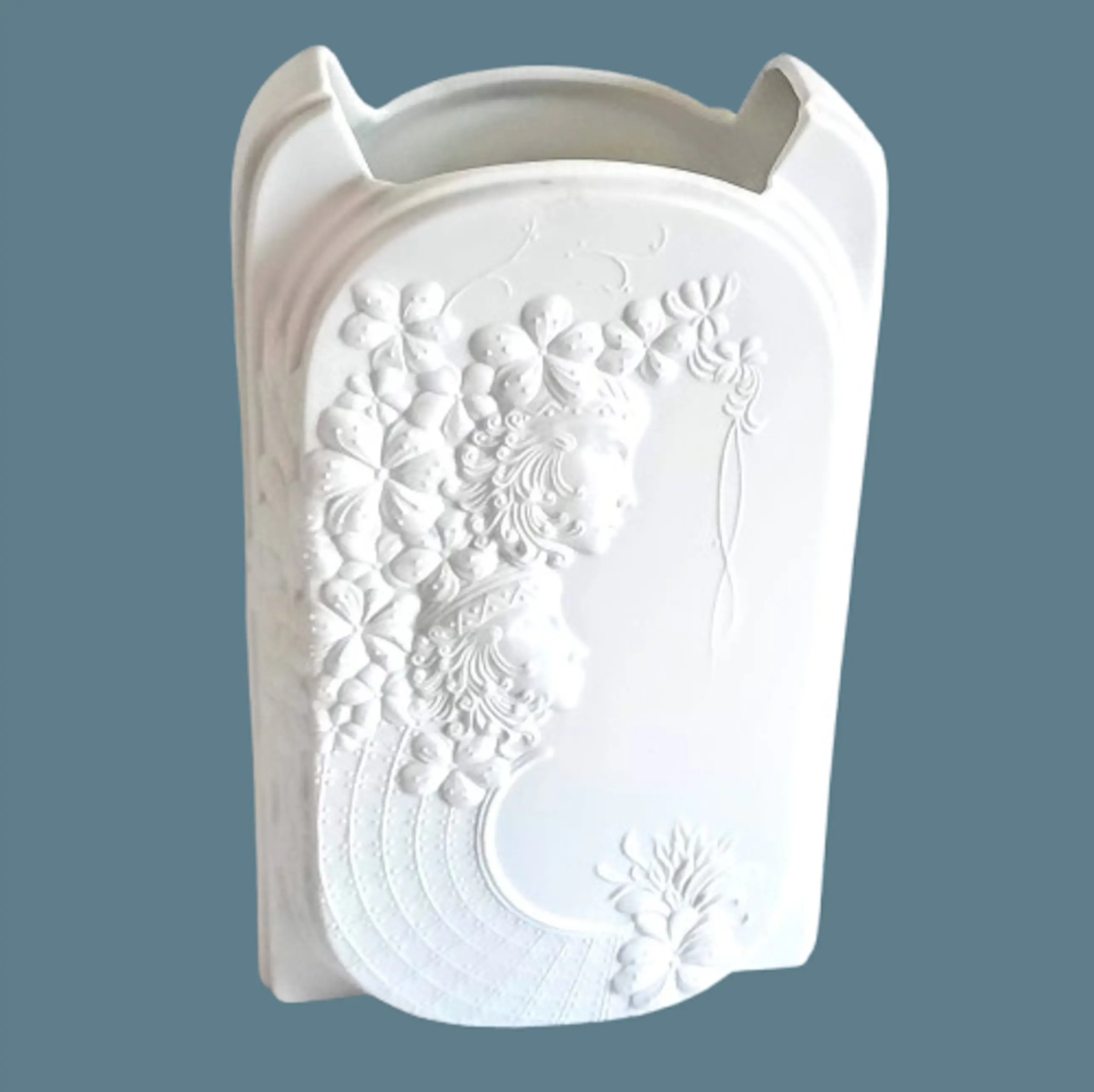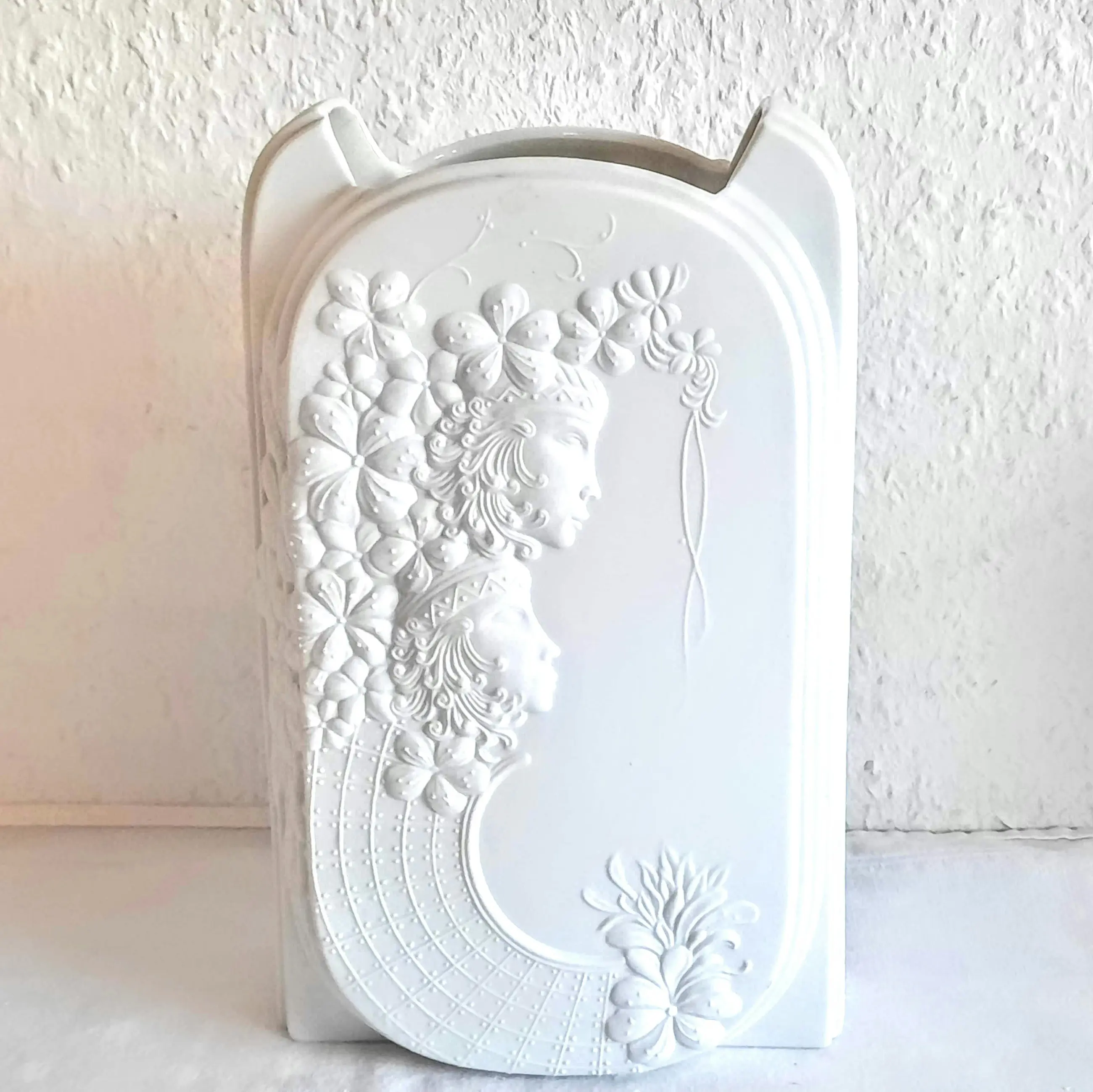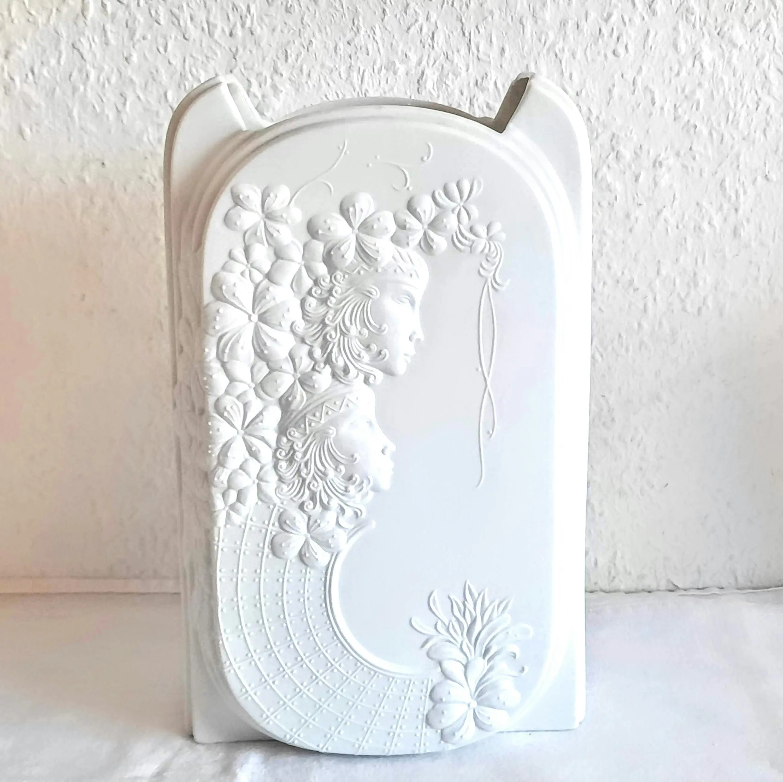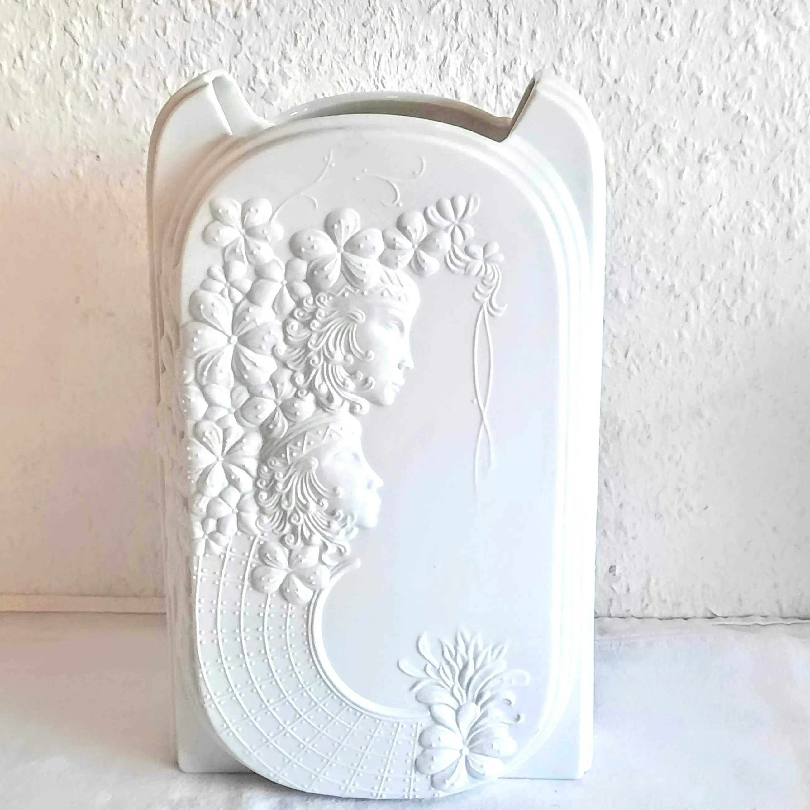 De vaas, gemaakt van wit biscuitporselein, onderscheidt zich door het gestructureerde oppervlak, dat is ontworpen om optische illusies te creëren. Hier is een uitgebreide reliëfversiering te zien met bloemmotieven en gestileerde vrouwelijke figuren (hetzelfde motief aan de voor- en achterkant).