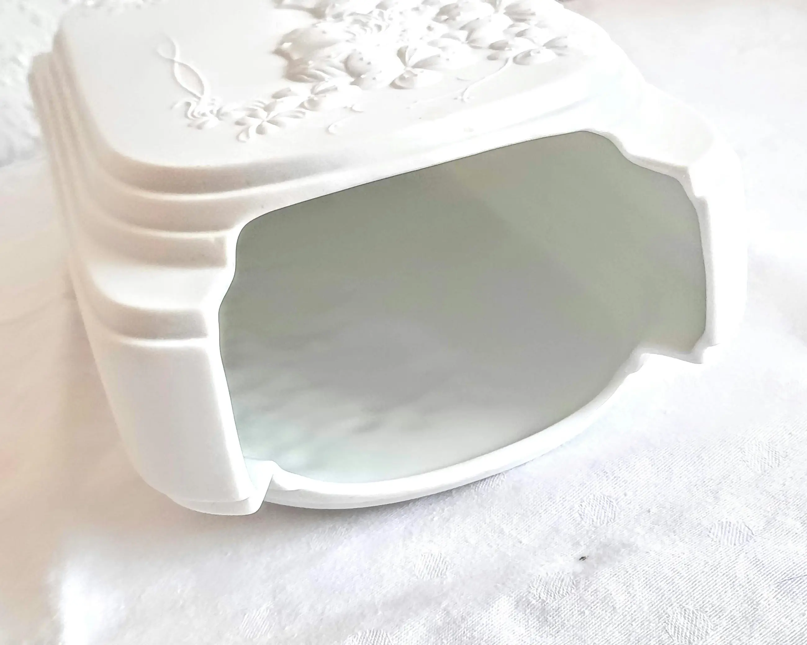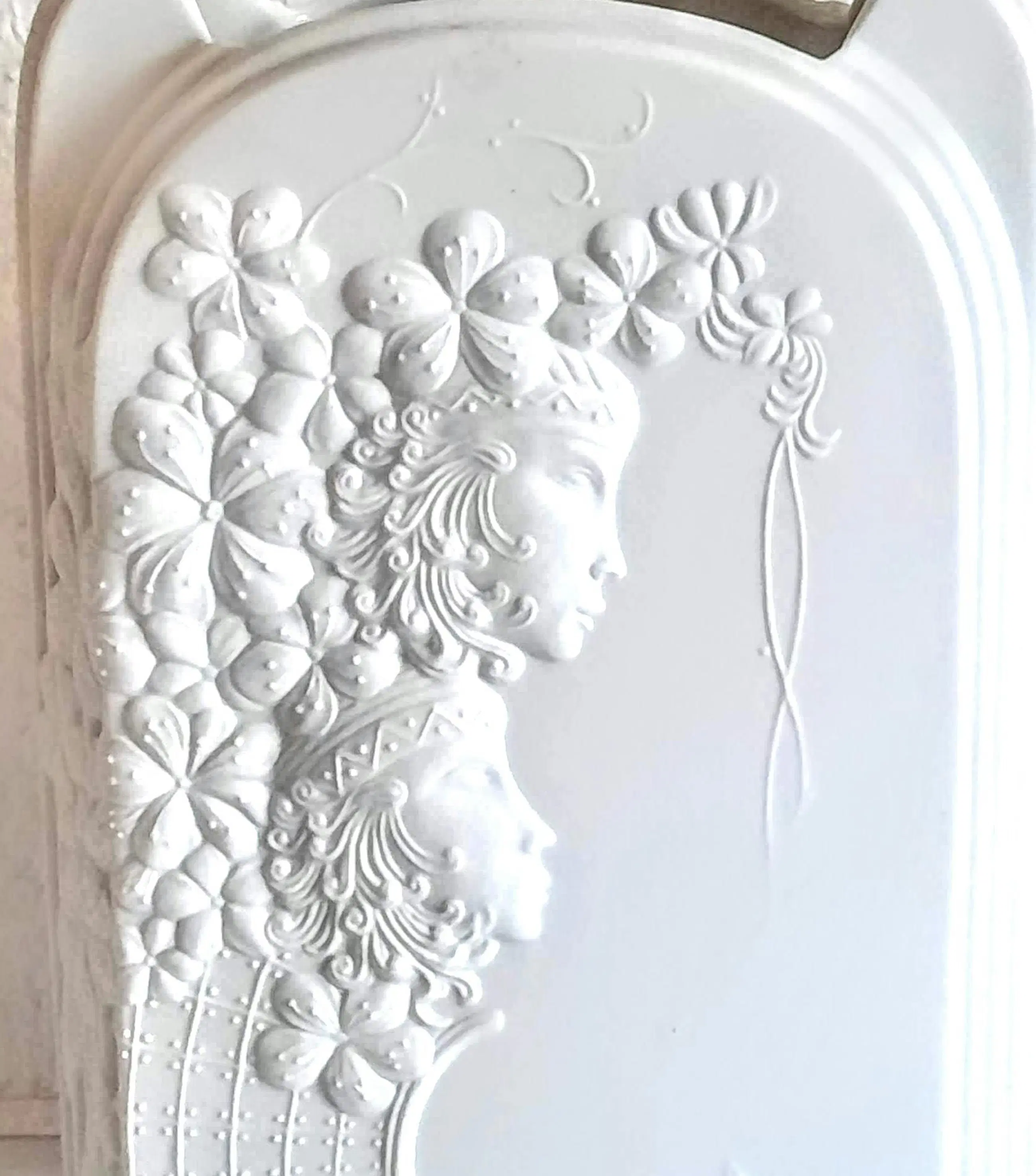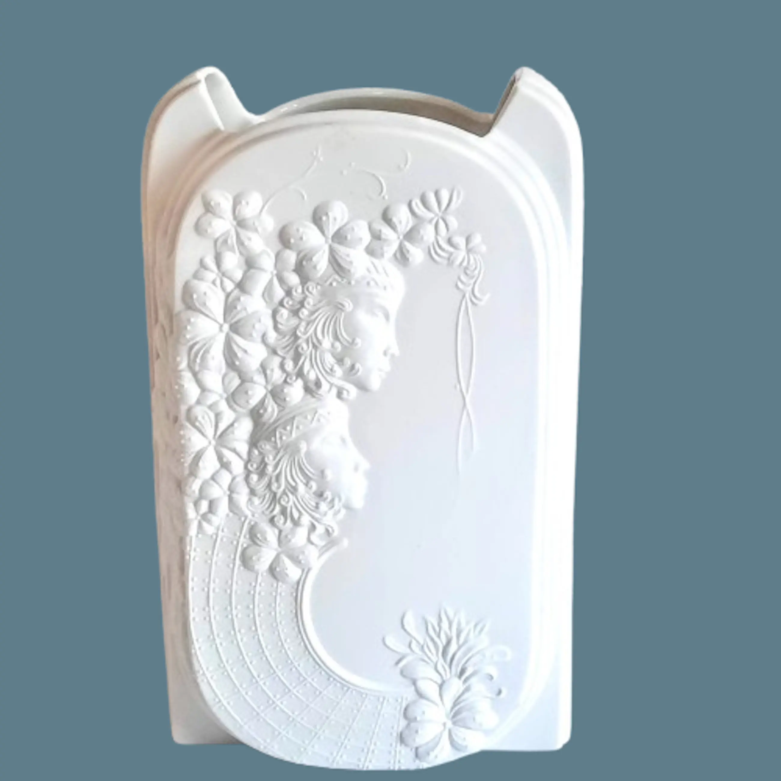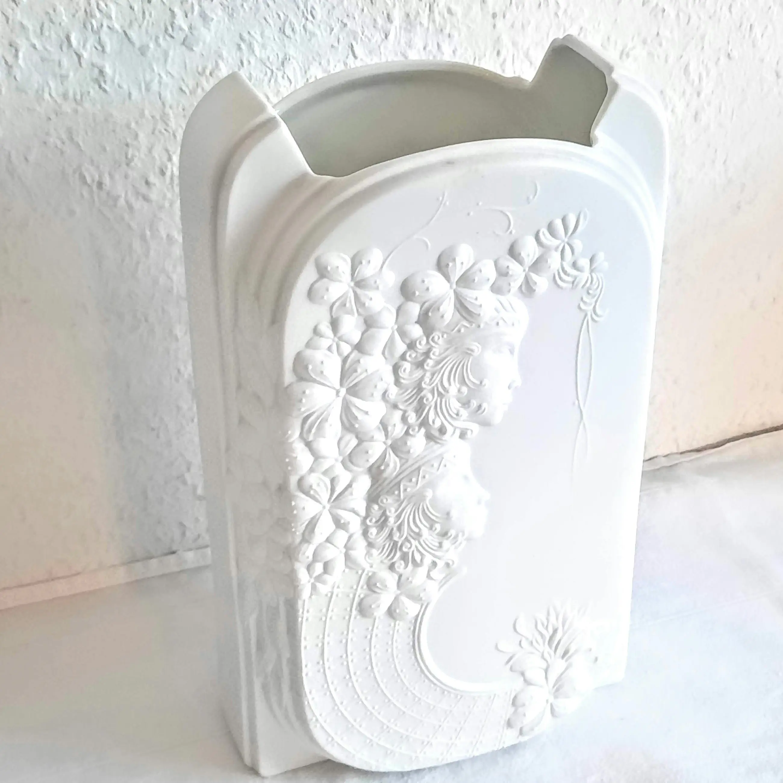 De vaas, gemaakt van wit biscuitporselein, onderscheidt zich door het gestructureerde oppervlak, dat is ontworpen om optische illusies te creëren. Hier is een uitgebreide reliëfversiering te zien met bloemmotieven en gestileerde vrouwelijke figuren (hetzelfde motief aan de voor- en achterkant).