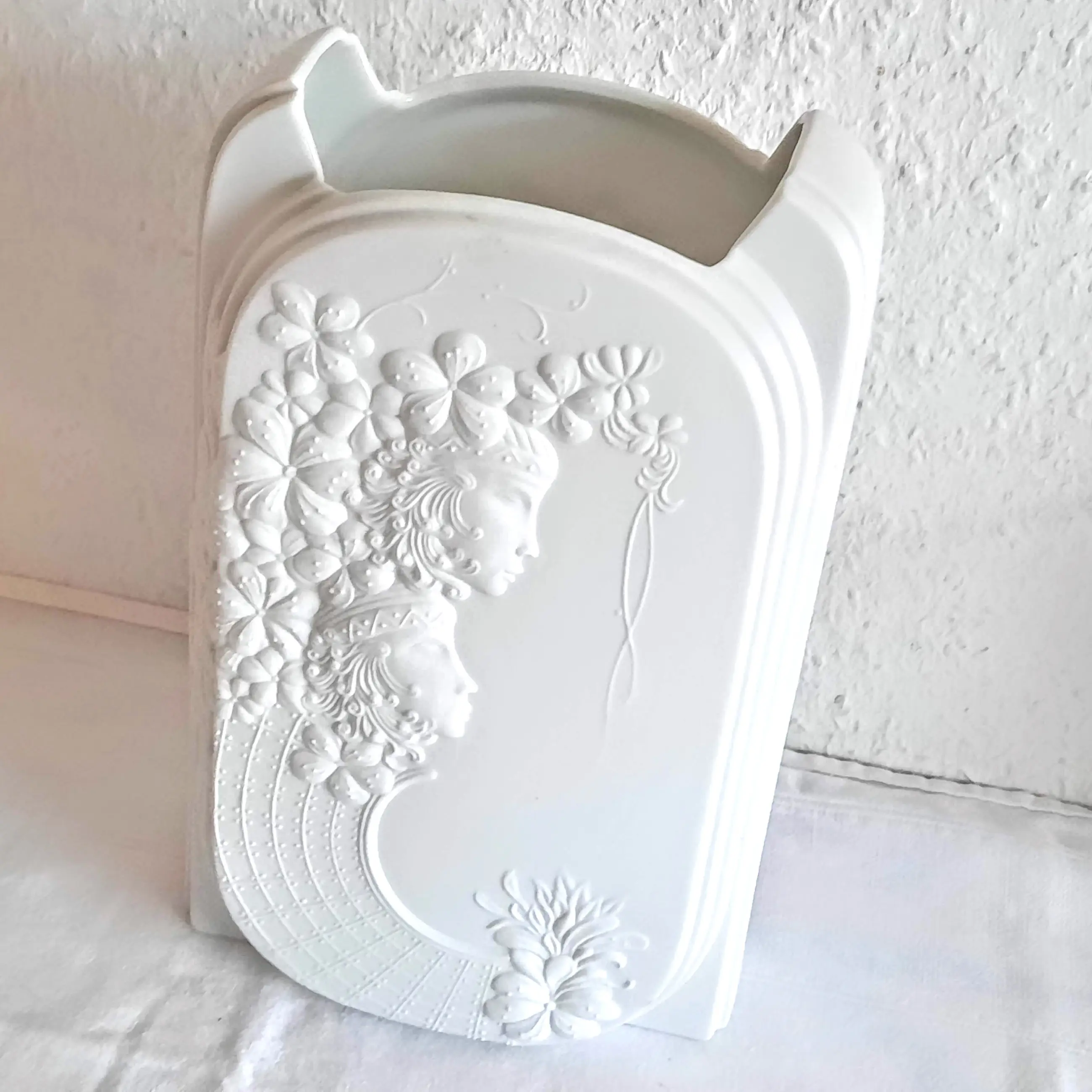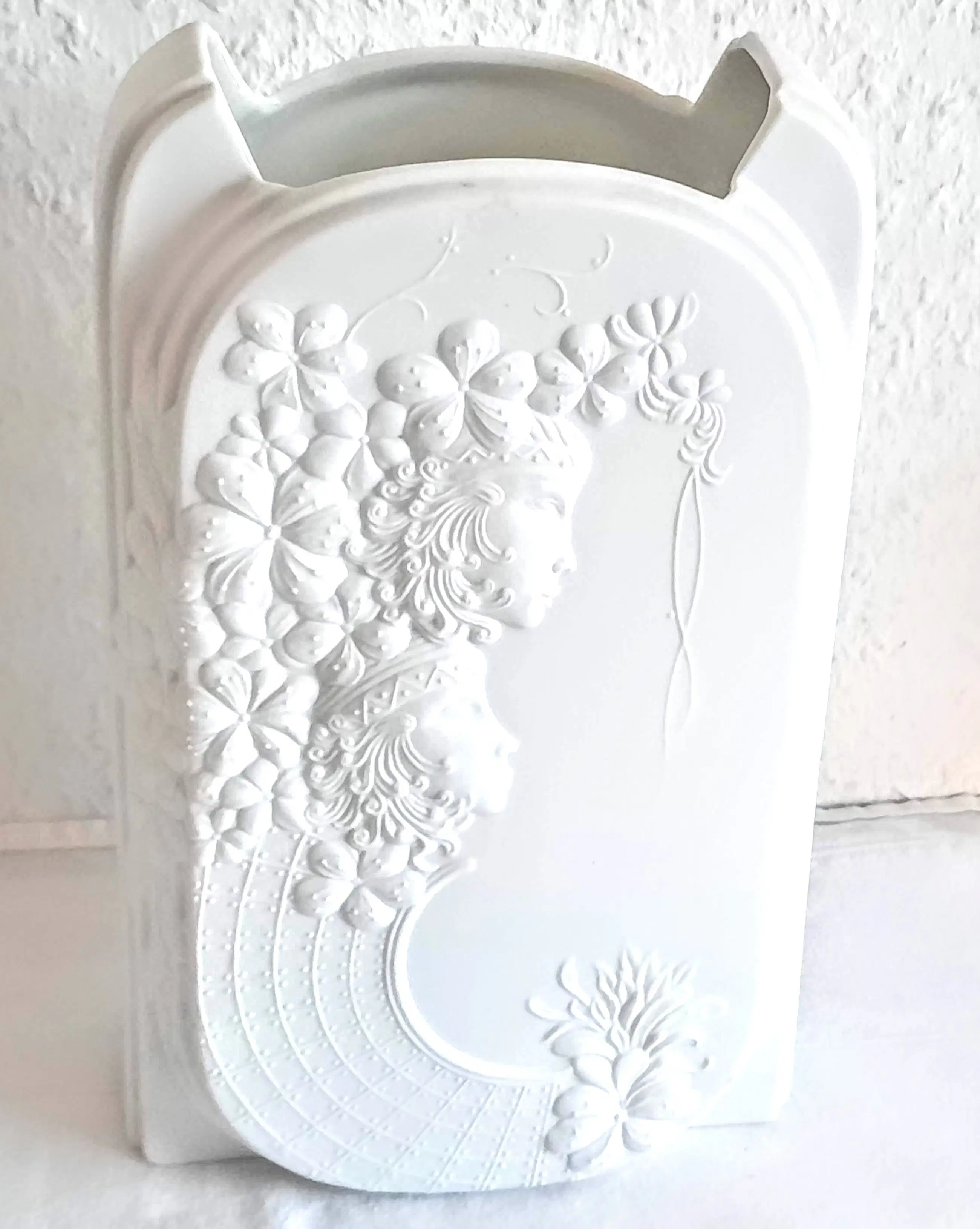 De vaas, gemaakt van wit biscuitporselein, onderscheidt zich door het gestructureerde oppervlak, dat is ontworpen om optische illusies te creëren. Hier is een uitgebreide reliëfversiering te zien met bloemmotieven en gestileerde vrouwelijke figuren (hetzelfde motief aan de voor- en achterkant).