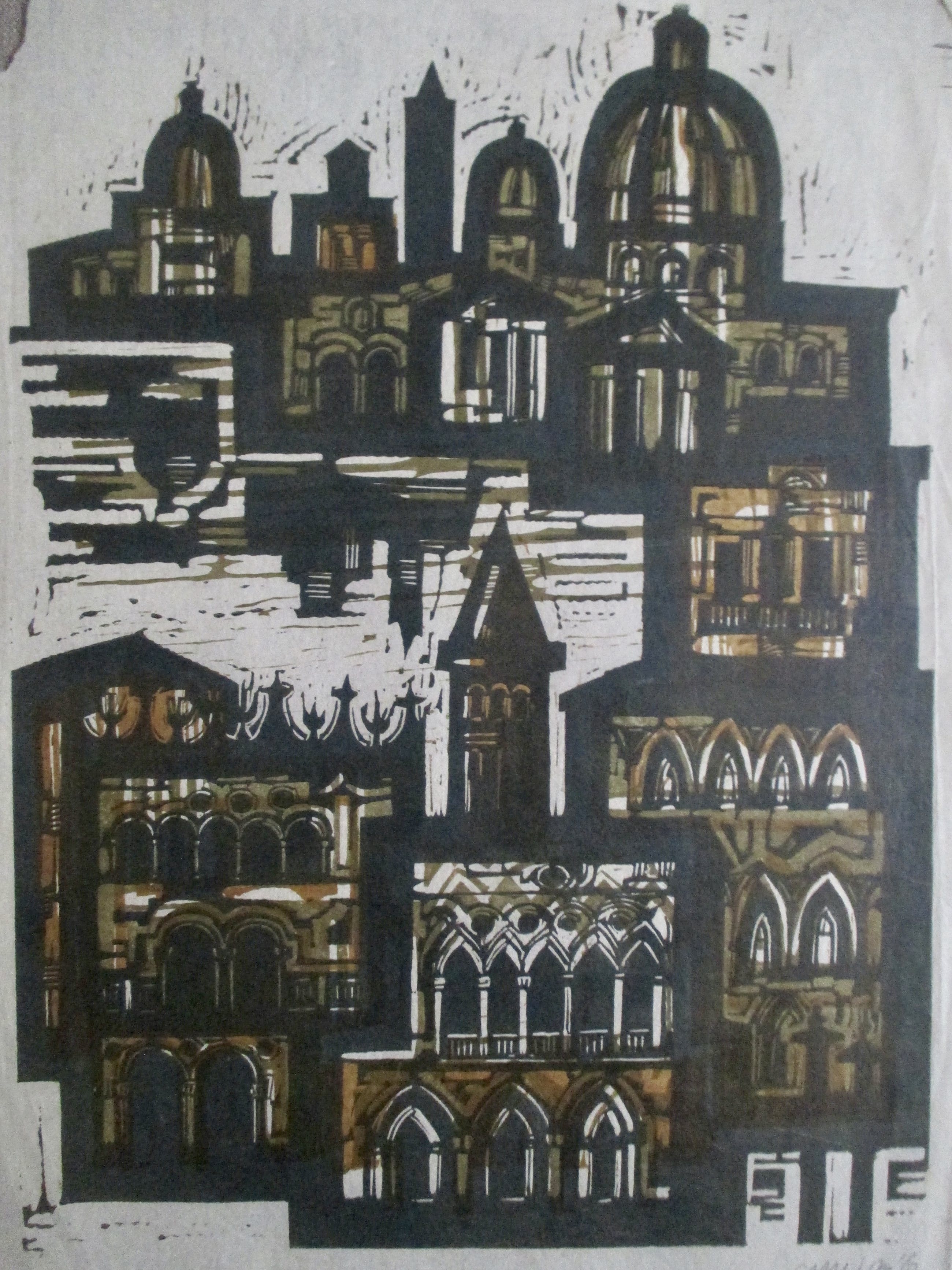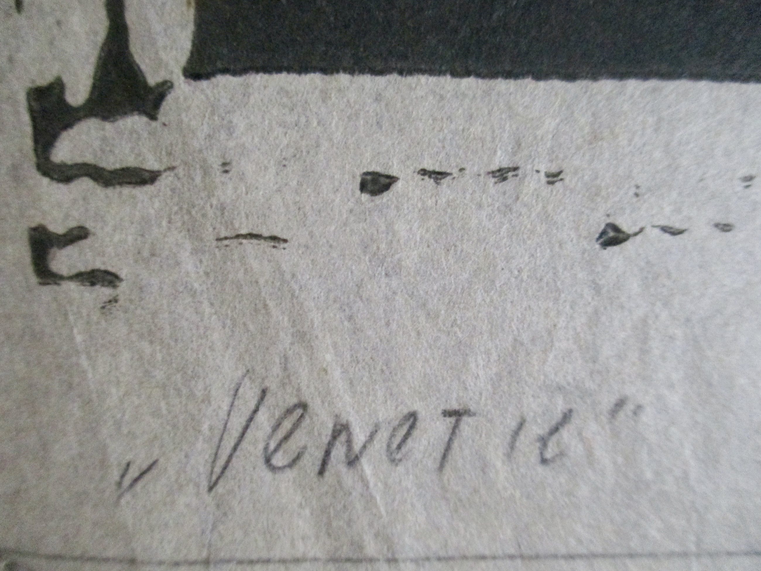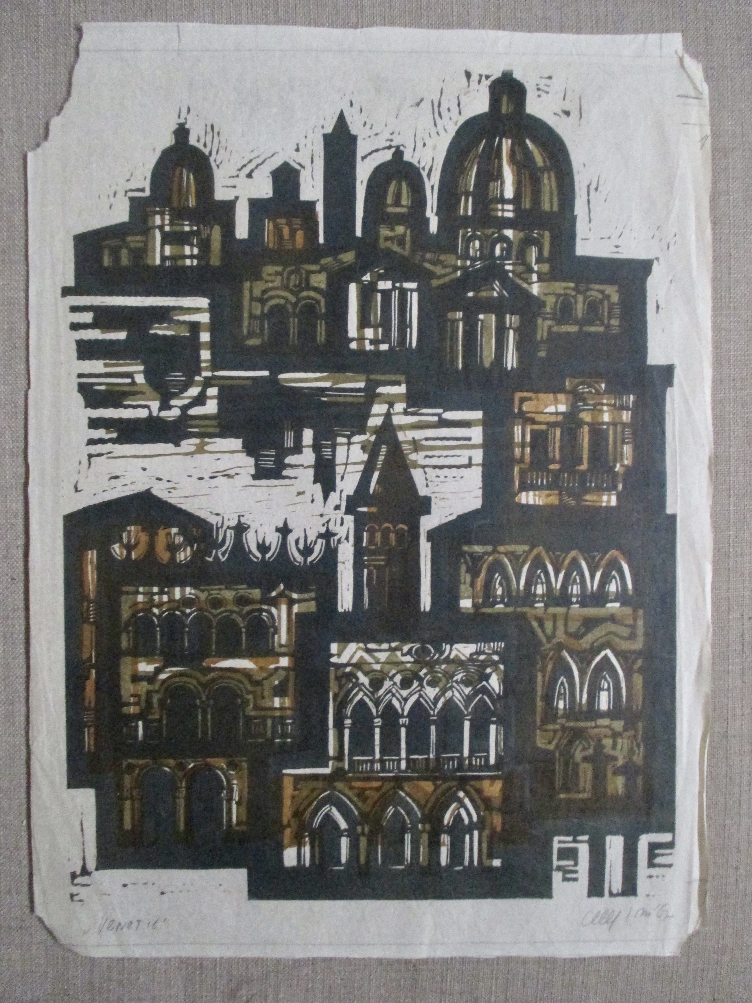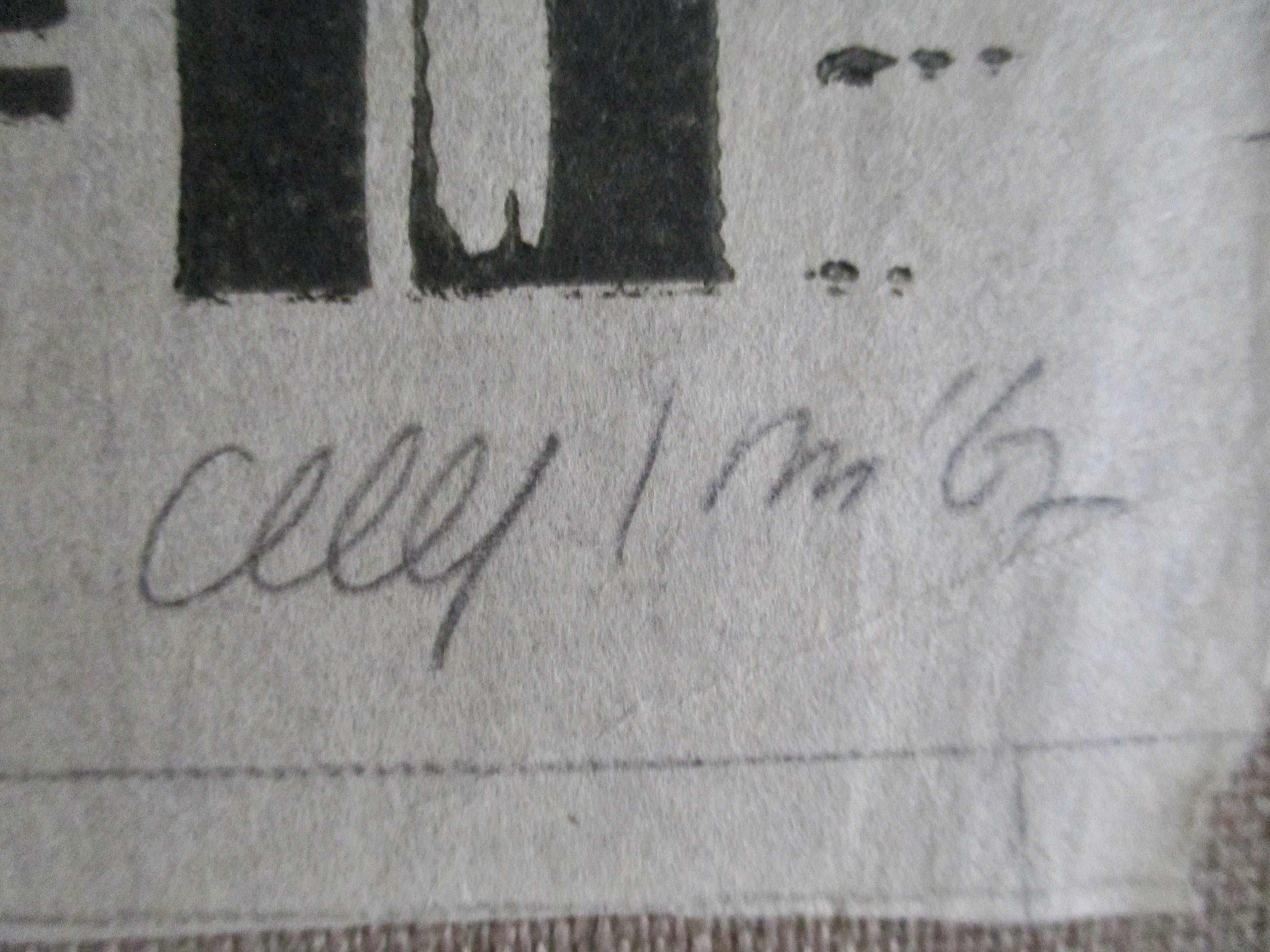 Houtsnede van Akke Sins, gesigneerd, gedateerd en getiteld in potlood. verzending tussen twee platen, 8,25, aangetekend 10,20