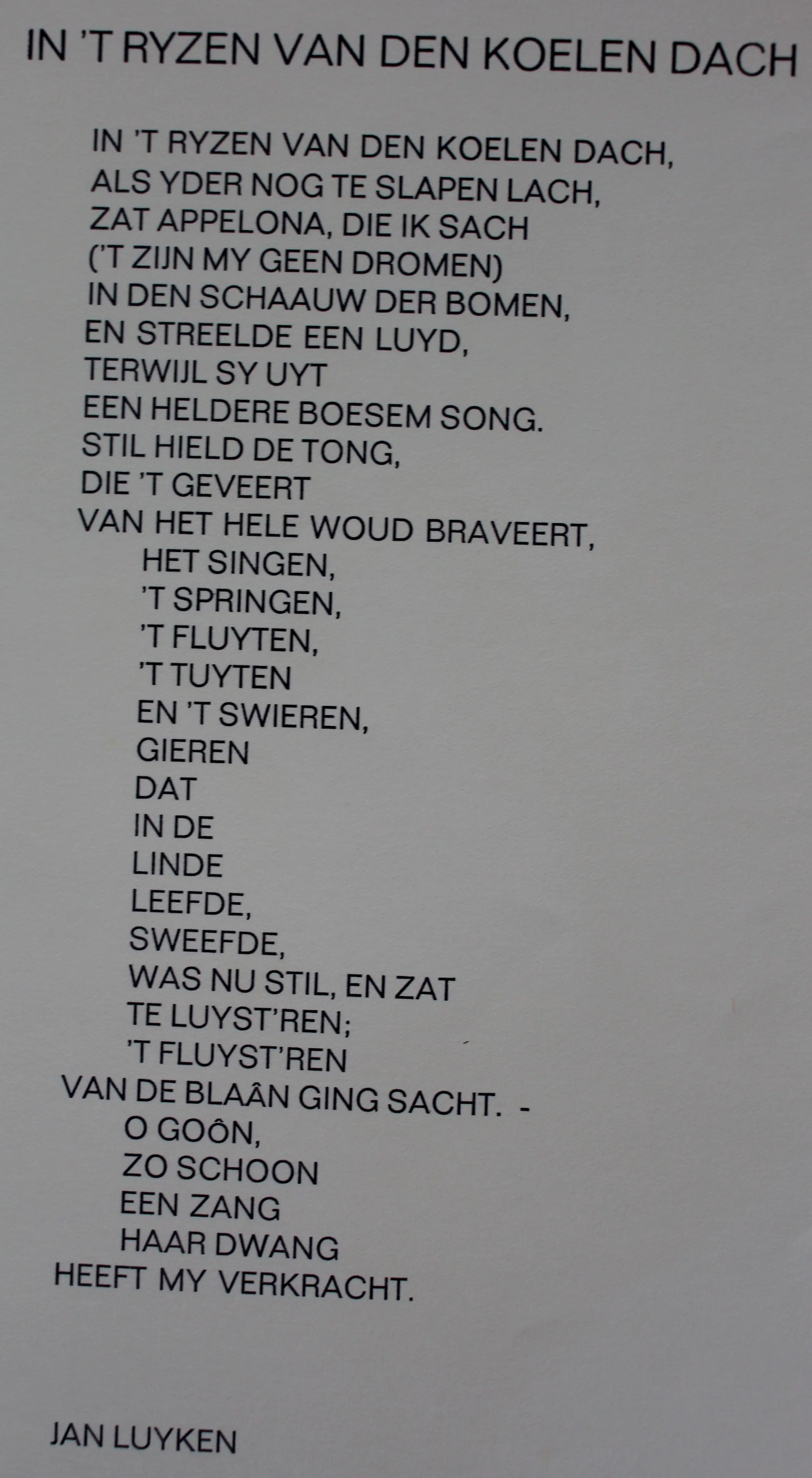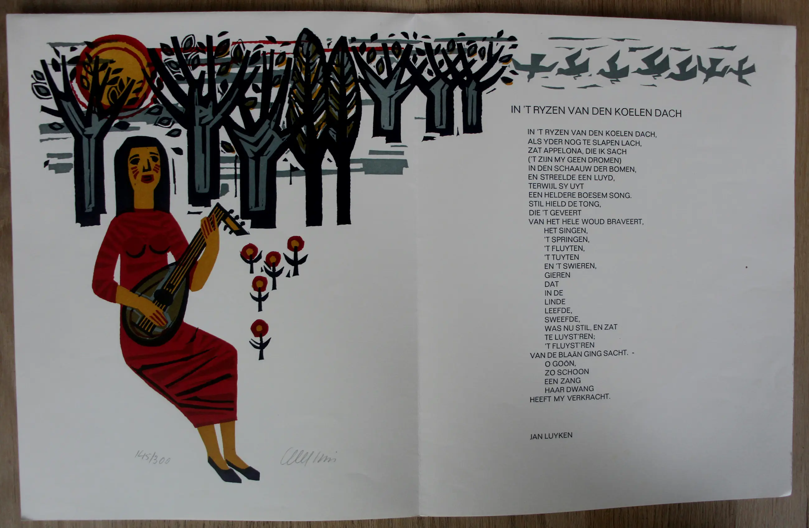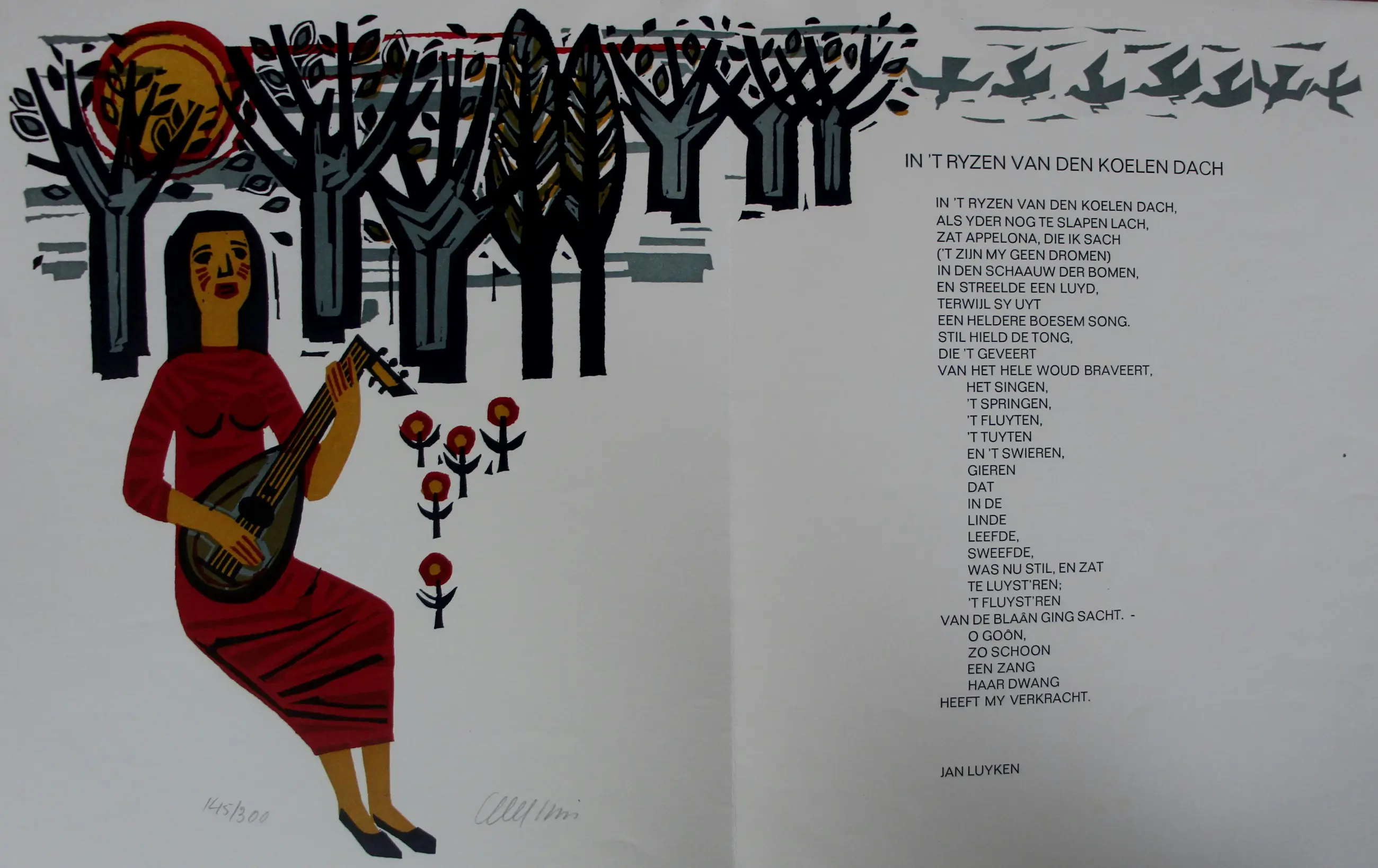 Linosnede van Akke Sins, met gedicht van Jan Luyken. Jaar: 1969. Oplage: 145/300. Afmetingen blad(uitgevouwen): H30 x b48cm. Het werk is links onderaan gesigneerd door de kunstenaar. De authenticiteit van het, aangeboden, werk wordt volledig gegarandeerd. Een certificaat van echtheid kan, op aanvraag, worden gemaild.