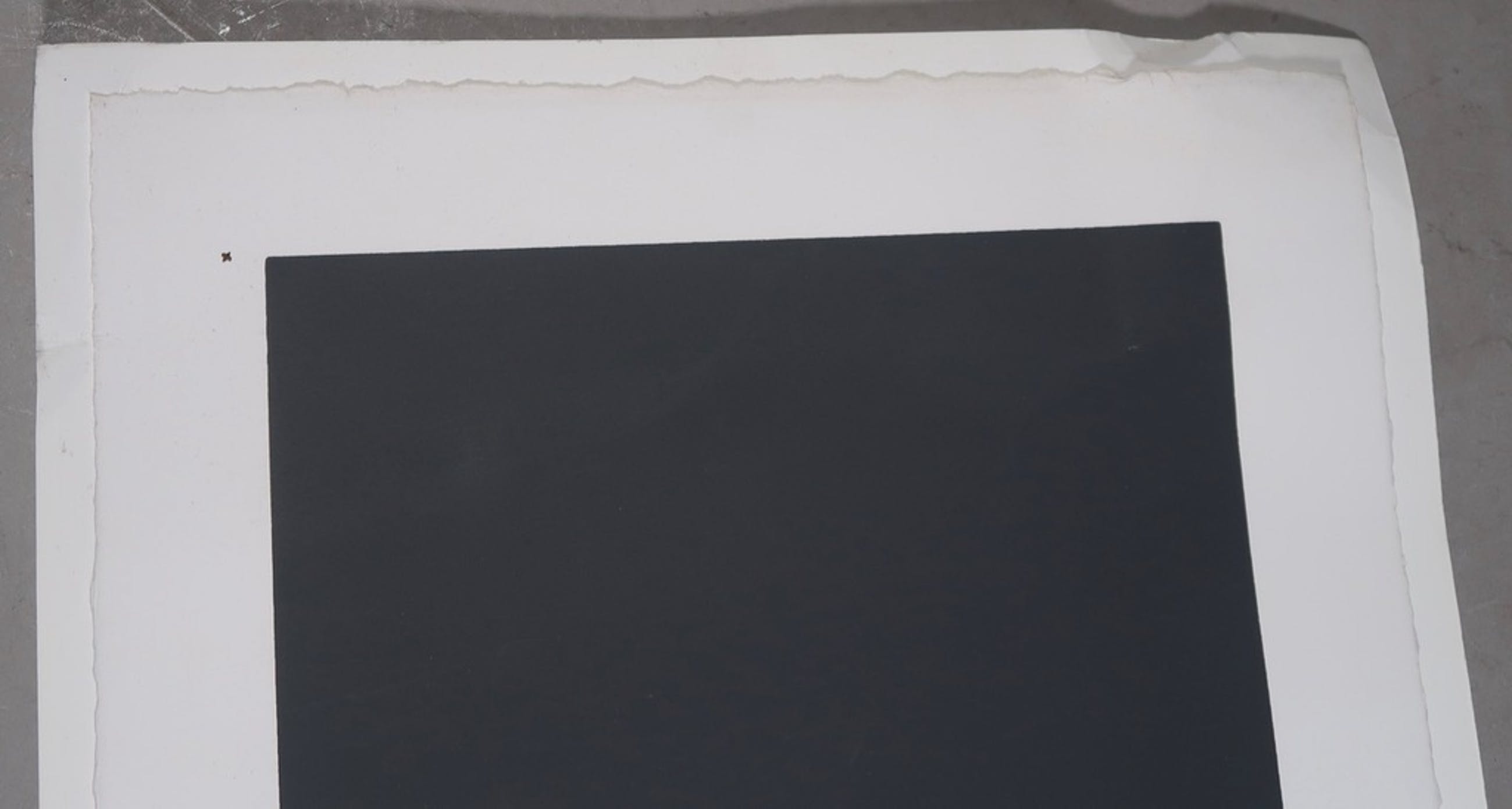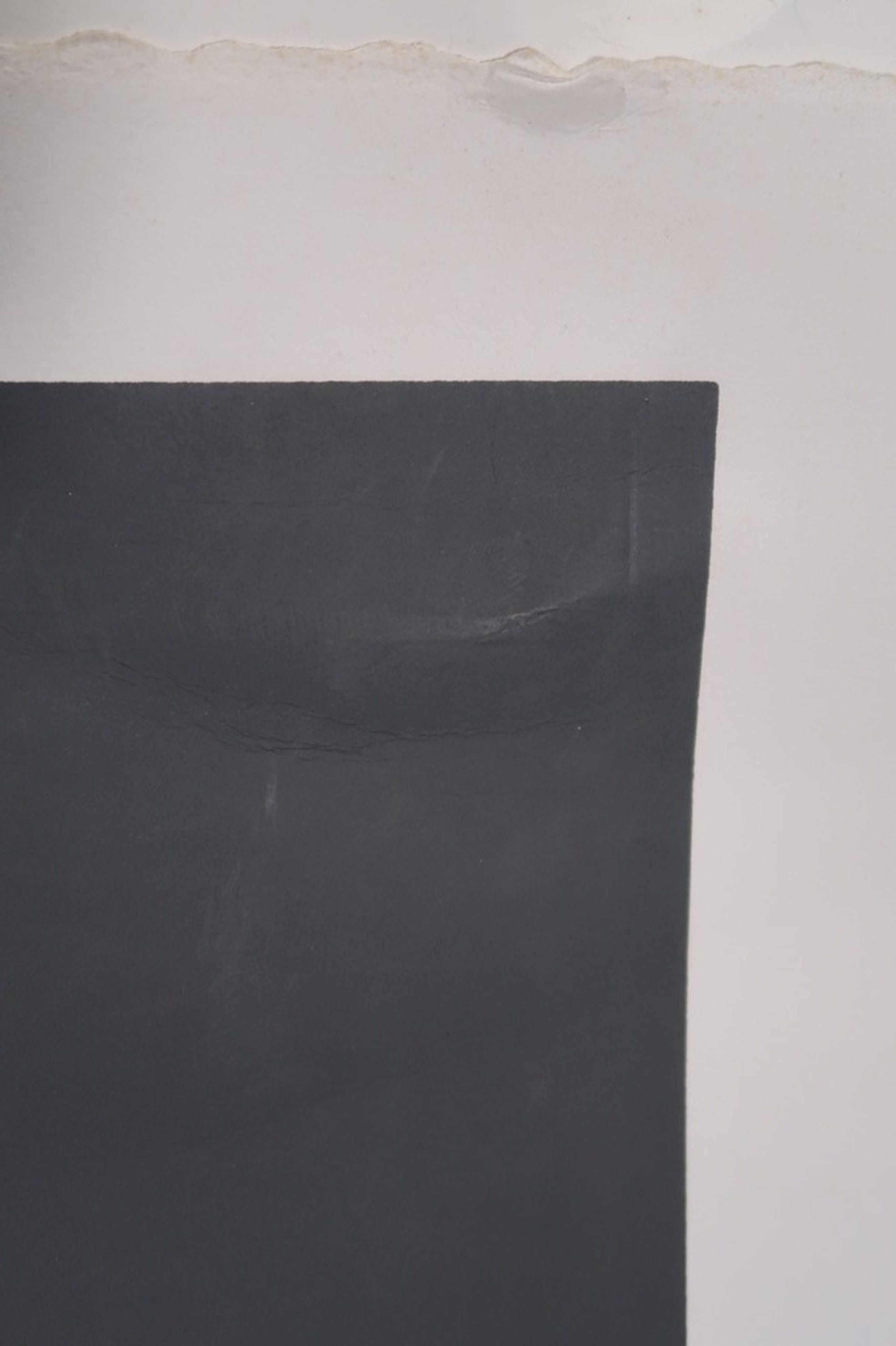 Materiaal: Zeefdruk op papier, op onderblad gelijmd en met lijmresten achterop het onderblad.