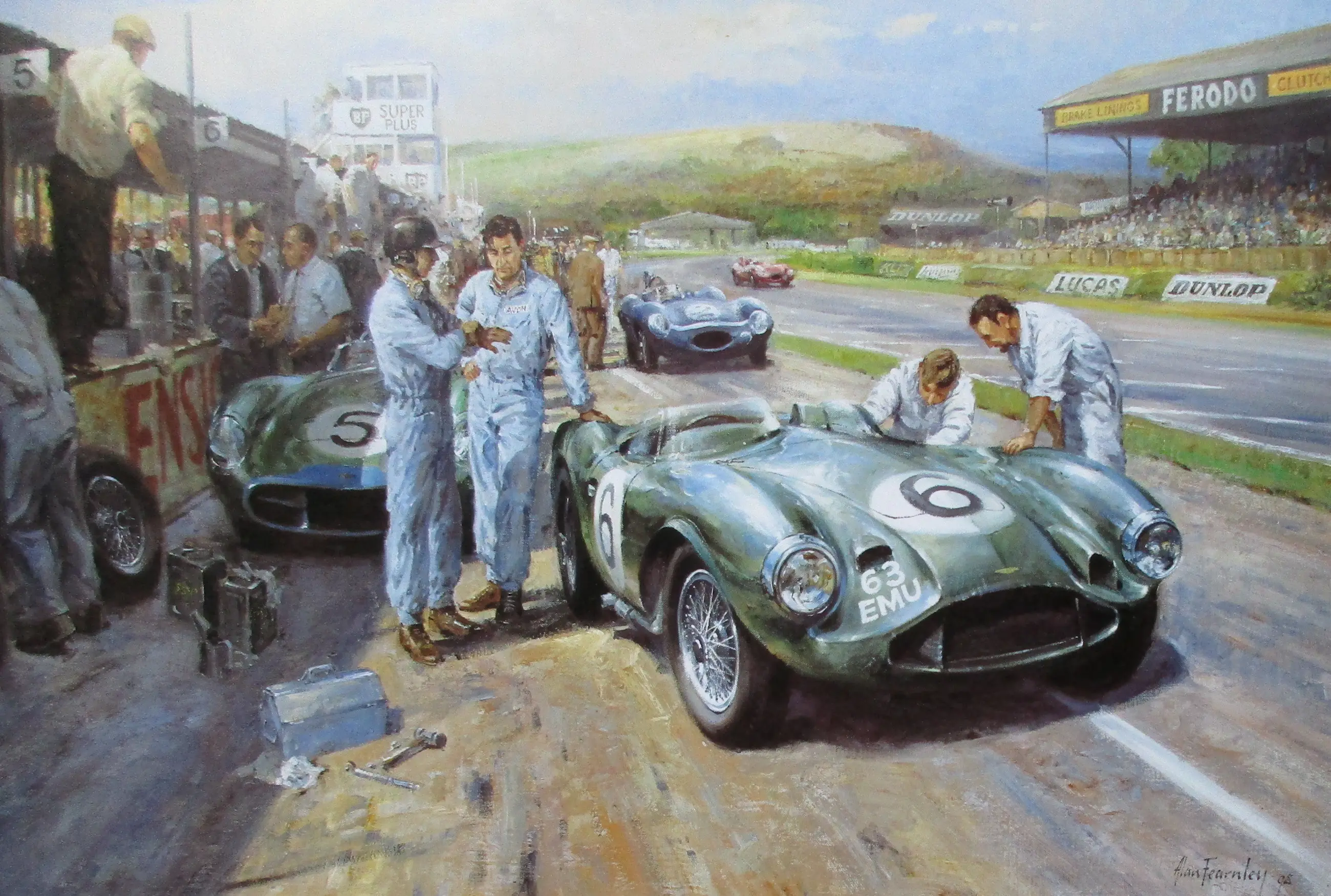A limited edition of 850 prints worldwide. Prior to their final race as Aston Martin Team Cars, the 2 DB3S cars of Tony Brooks (63 EMU no. 6) and Roy Salvadori (62EMU no. 5) receive their final check-up before the Sports Car Race, at Goodwood in September 1956, which was won by Brooks with Salvadori a close second.