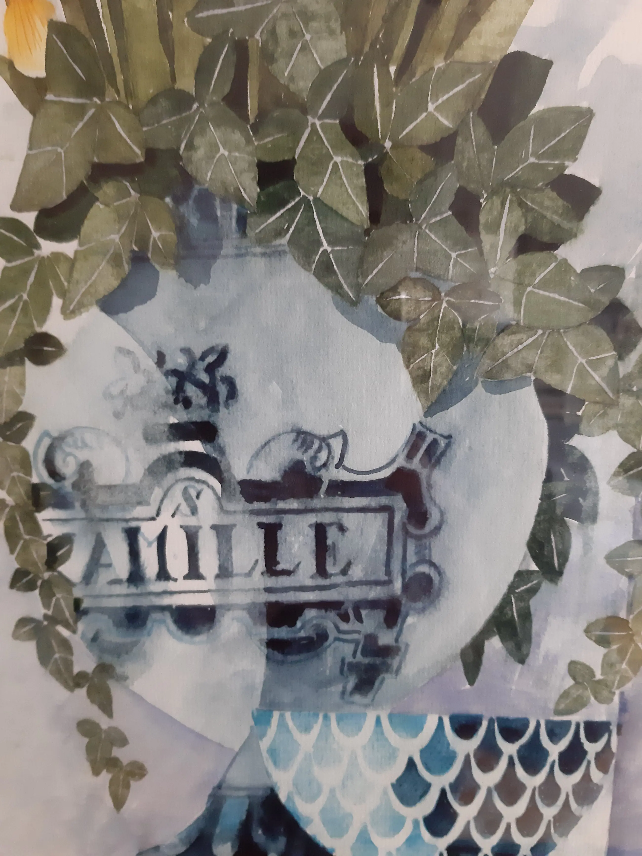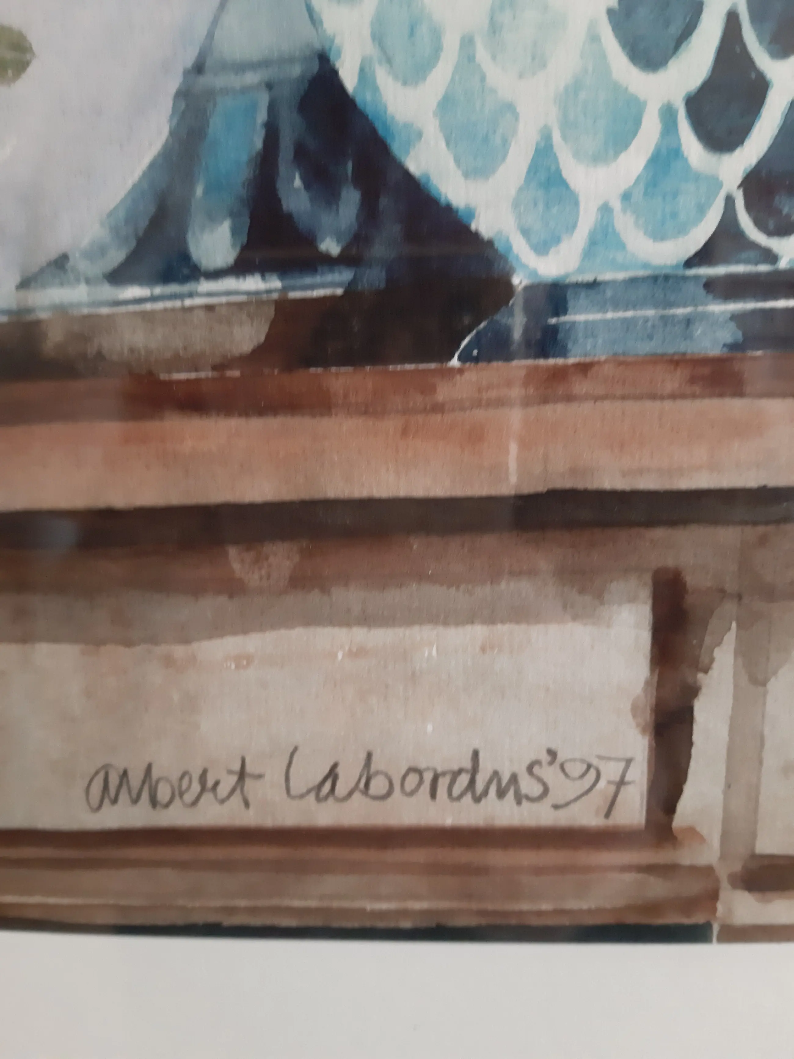 Albert Labordus, geboren 20-09-1935 te Leiden en overleden 05-09-2017 leefde en werkte in Oegstgeest. Dit florissante werk vormt een harmonieus geheel met de lijst, mede door de passe-partout. Het werk is ruim twintig jaar geleden aangekocht in een galerie te Oegstgeest.