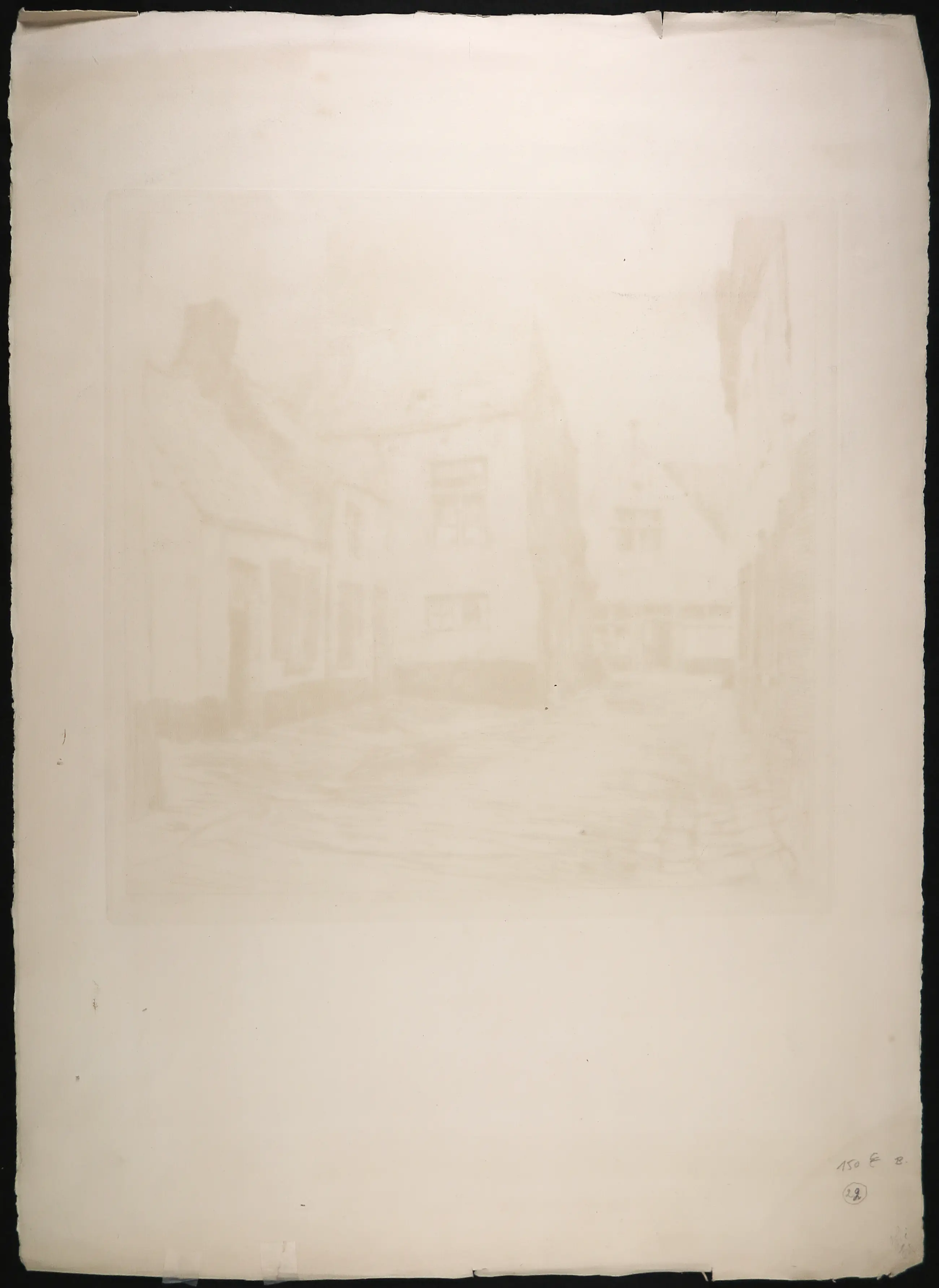 | Zeer goede staat gezien leeftijd, wel met sterke verkleuringen in de randen om het beeld. Ook het werk is egaal vergeeld. Beschadigingen langs de randen van het blad. | |