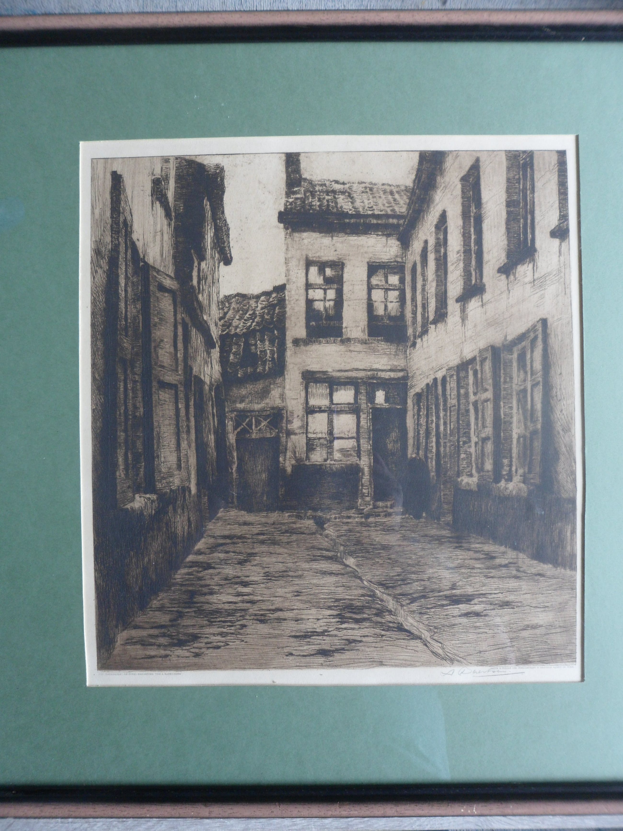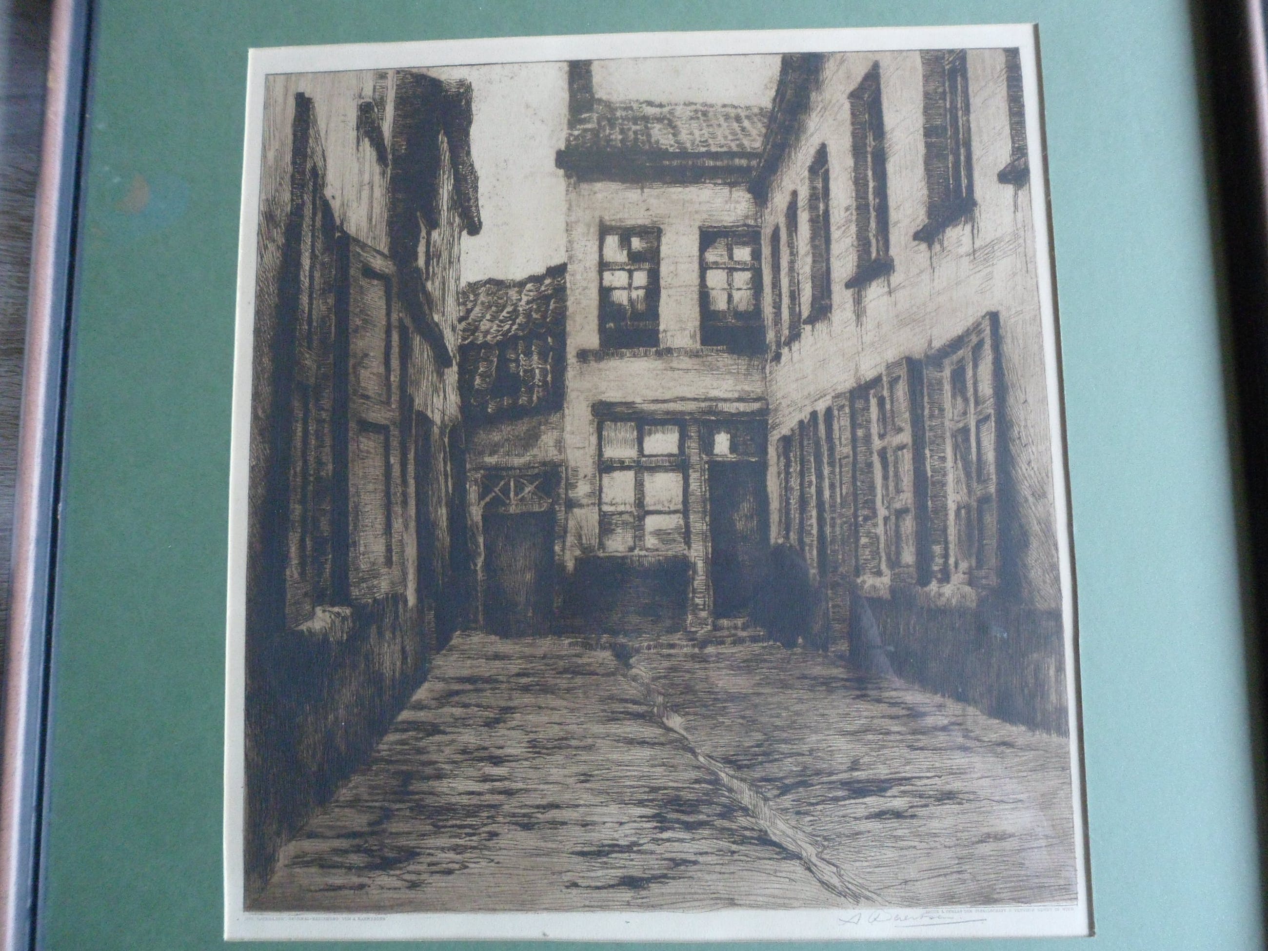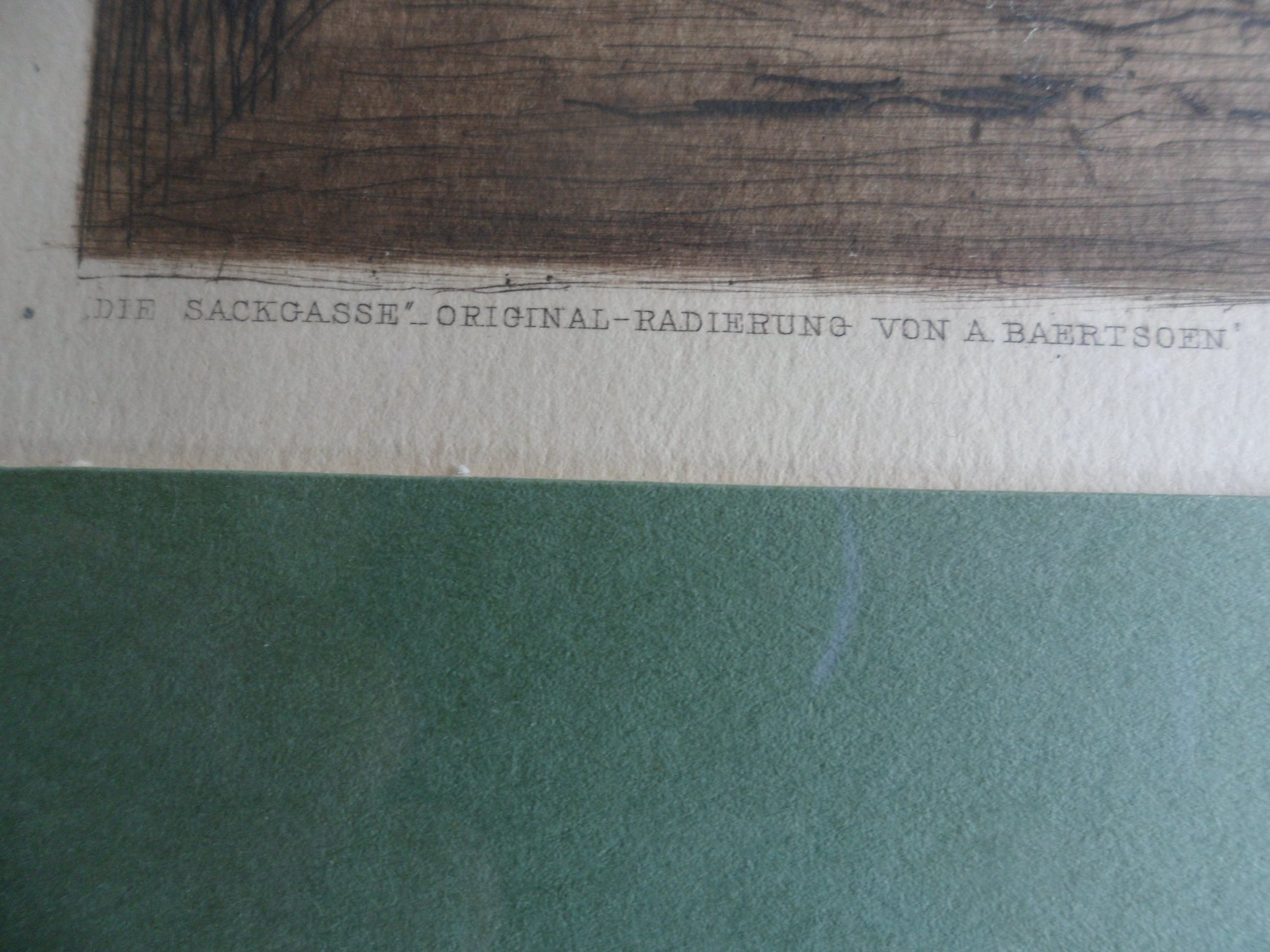 Ets in zwartbruin. Typografisch ingeschreven "Die Sackgasse - originele ets door A. Baertsoen" linksonder, "Druck & Verlag der Gesellschaft F. vervielf. Kunst in Wien" rechtsonder. Stempel links van de velmarge.