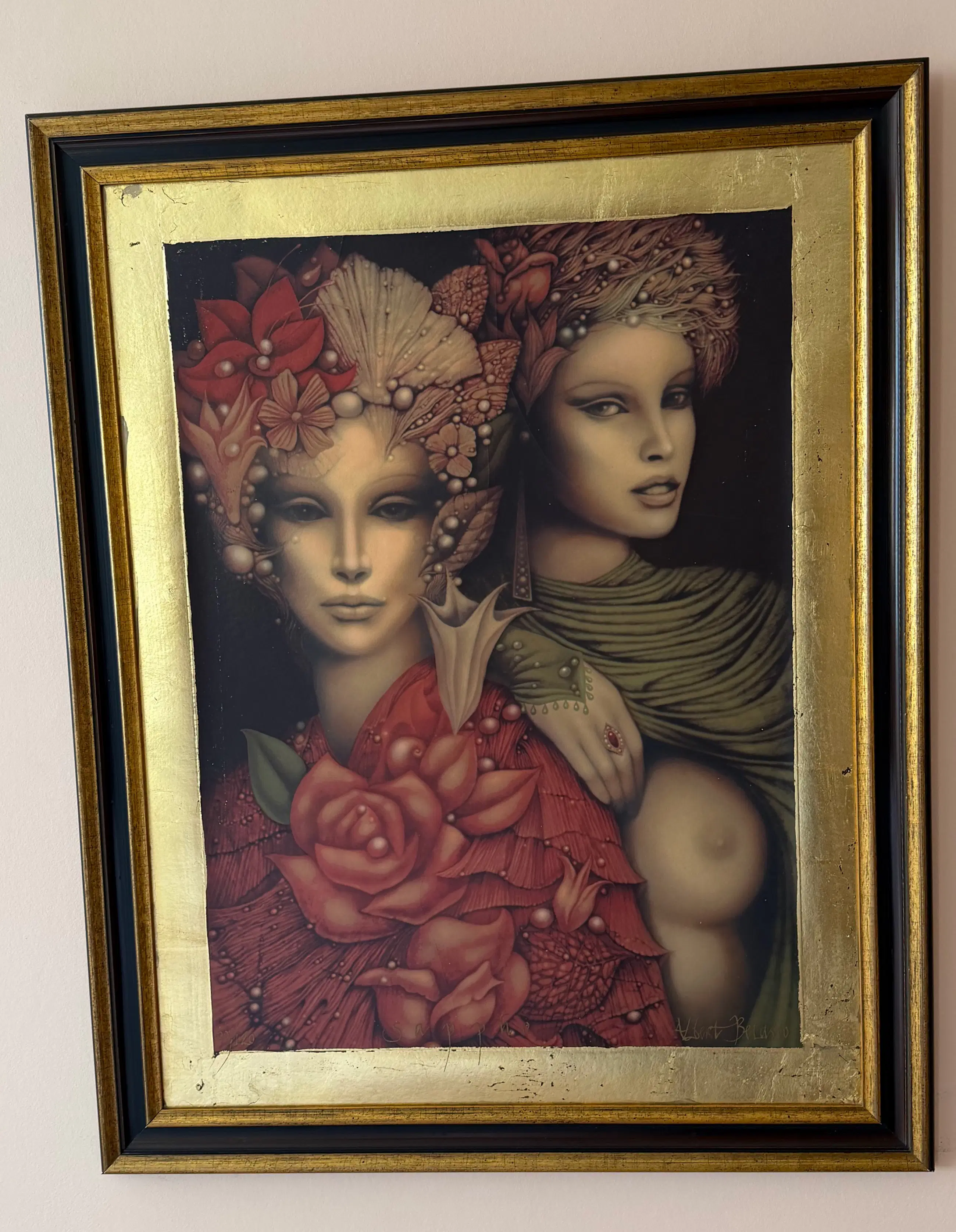 Dit is een kleurenserigrafie van de kunstenaar Albert Belasco (geboren in 1938). Het kunstwerk toont twee vrouwelijke figuren in een weelderige, decoratieve stijl.