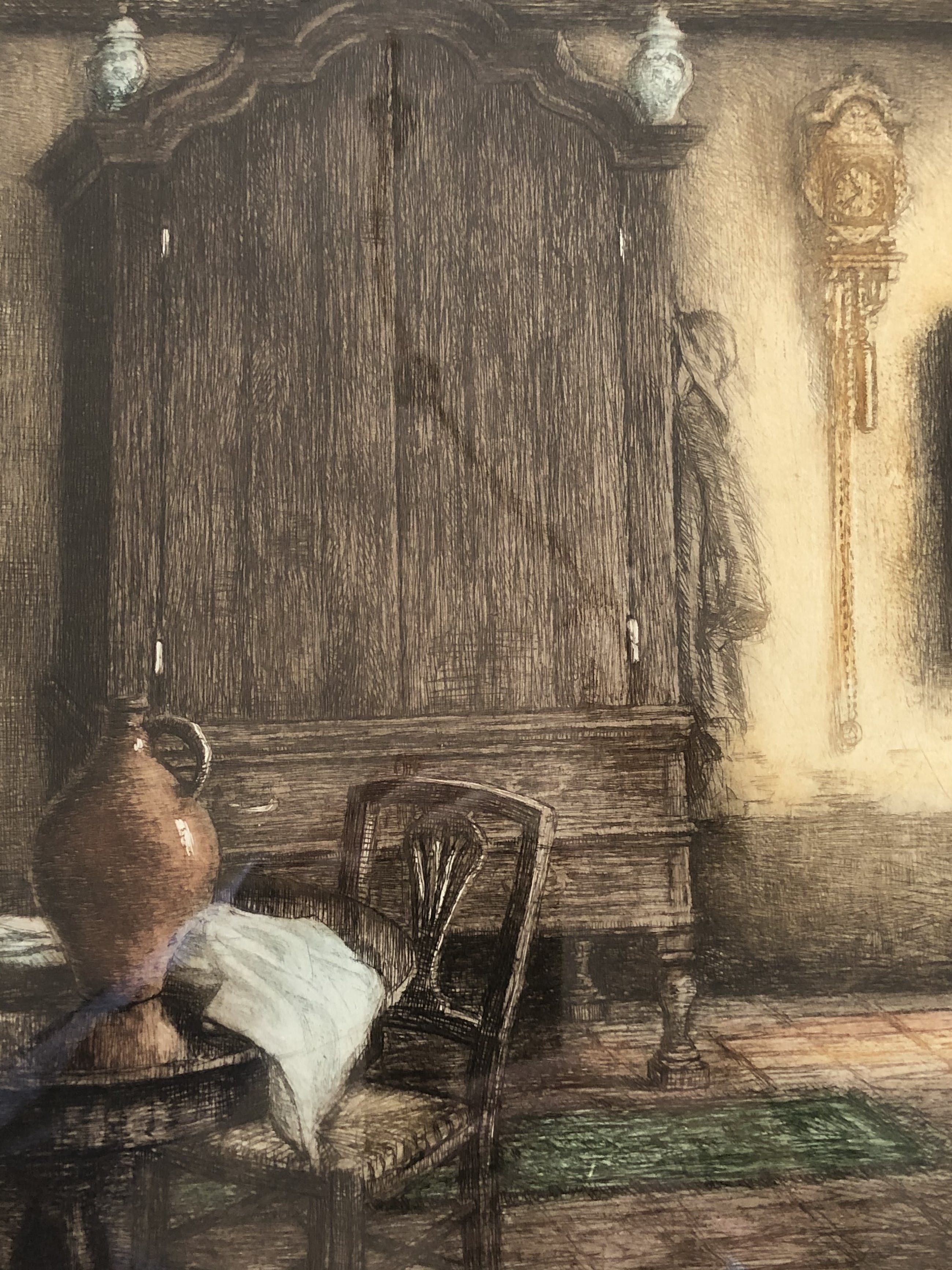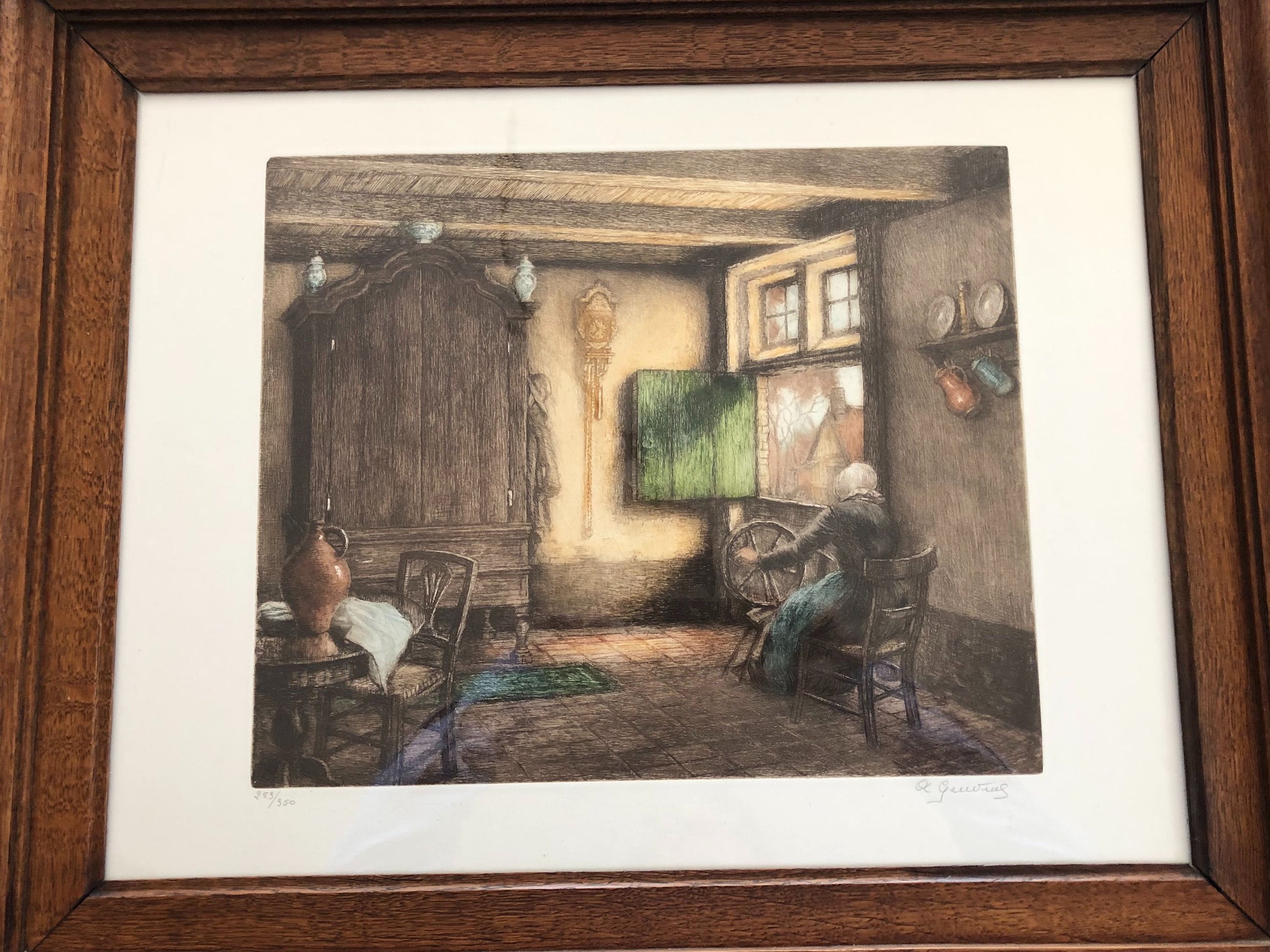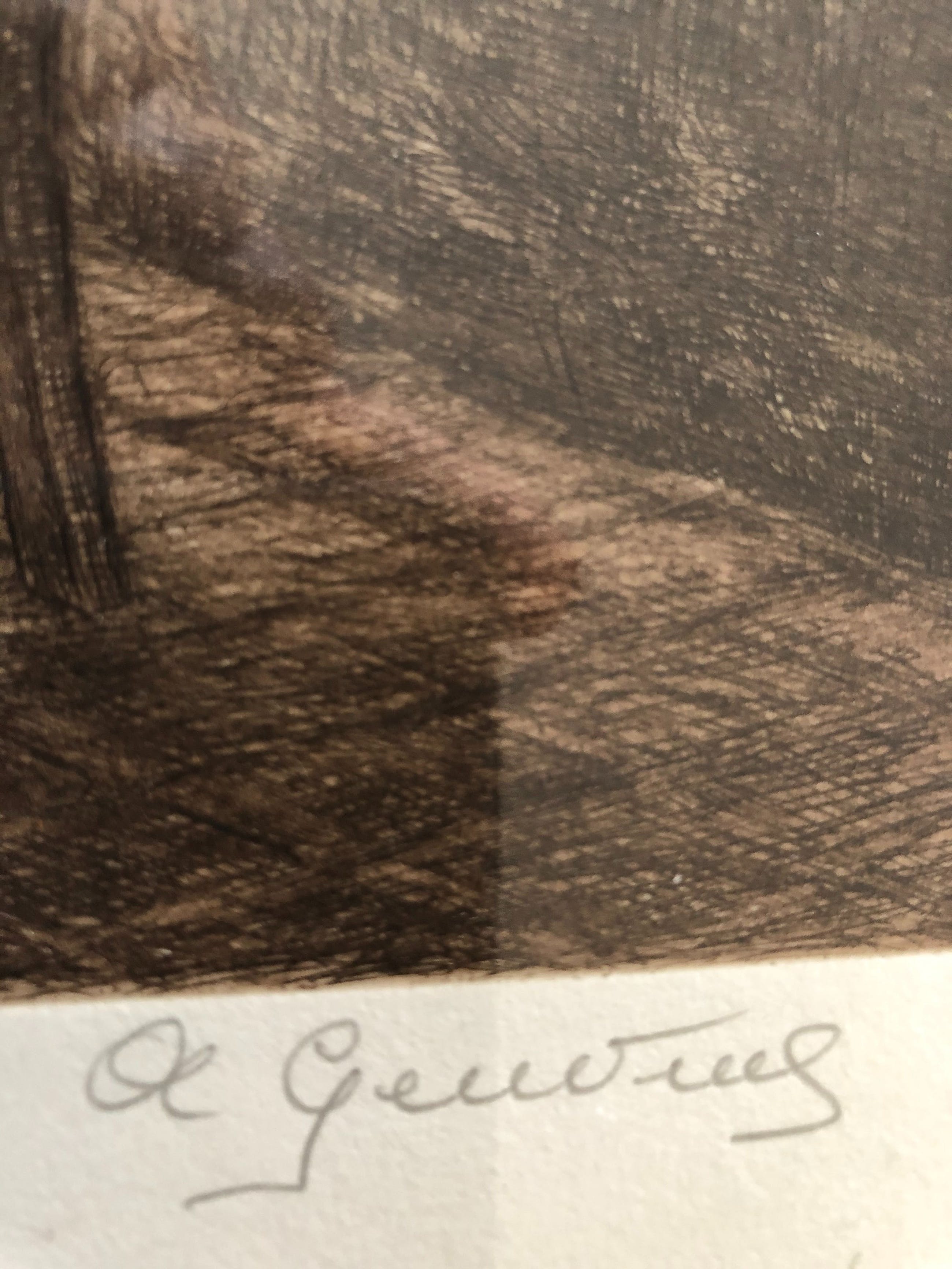 Ets is genummerd : 253/350- getekend buiten tekening met potlood.Albert Geudens was een Belgische aquarellist, etser, pastellist, schilder en tekenaar die werd geboren in 1869 te Mechelen en die stierf in 1949 te Schaarbeek. Hij volgde zijn opleiding aan de Academie van Mechelen en nadien aan de Academie te Antwerpen. Hij gaf de voorkeur aan bloemstillevens, genre-uitvoeringen, kerkinterieurs, portretten, stadsgezichten en stillevens. Hij schilderde poëtische gezichten van het oude Mechelen: typische hoekjes in het begijnhof, interieurs aldaar, oude gebouwen en woningen. Door het spel van licht en schaduw en door de zachte kleurschakeringen legde hij het accent op het sfeervolle en enigzins melancholische van deze huizen en buurten en van hun bewoners.(RKD, PIRON)