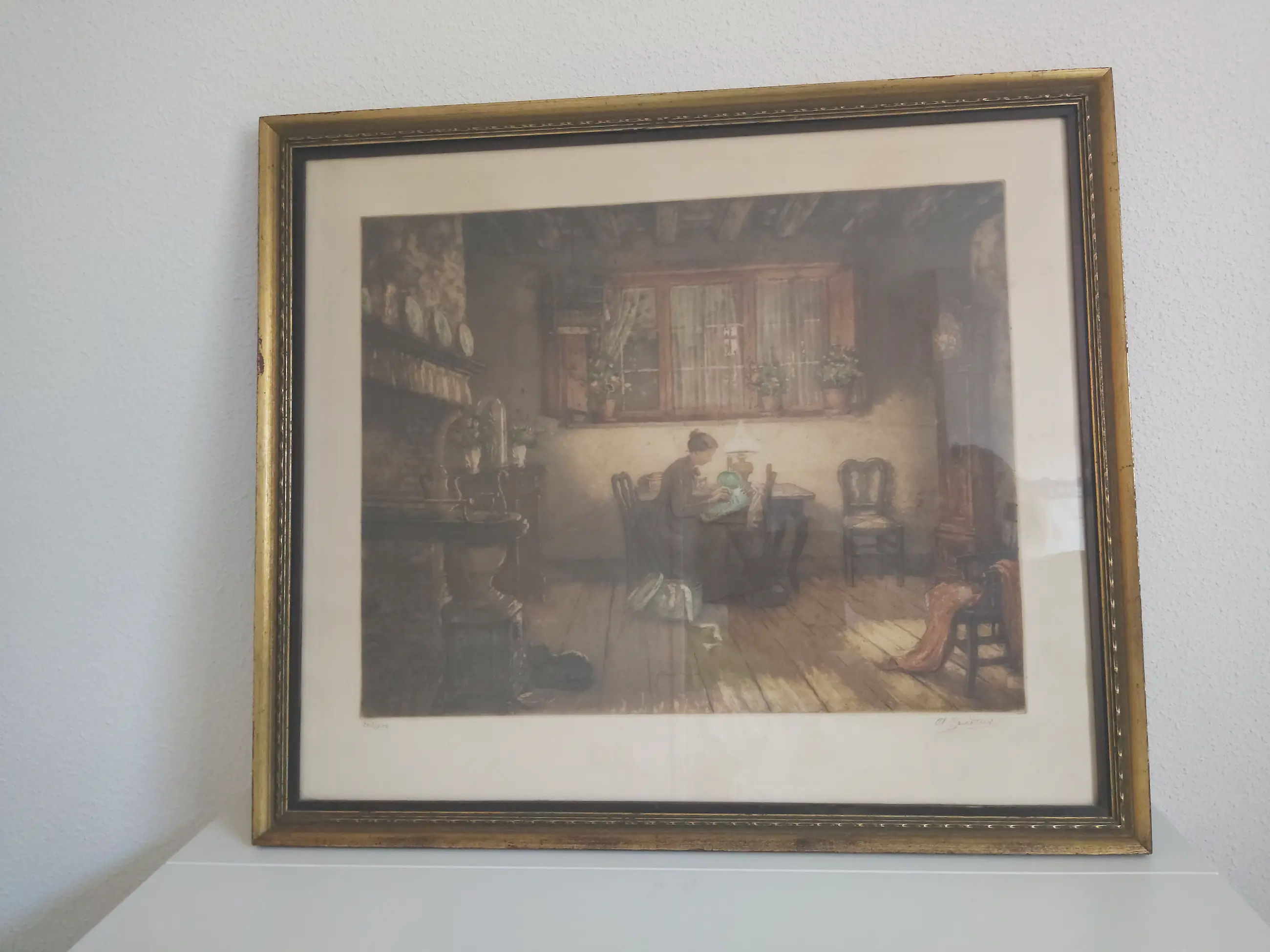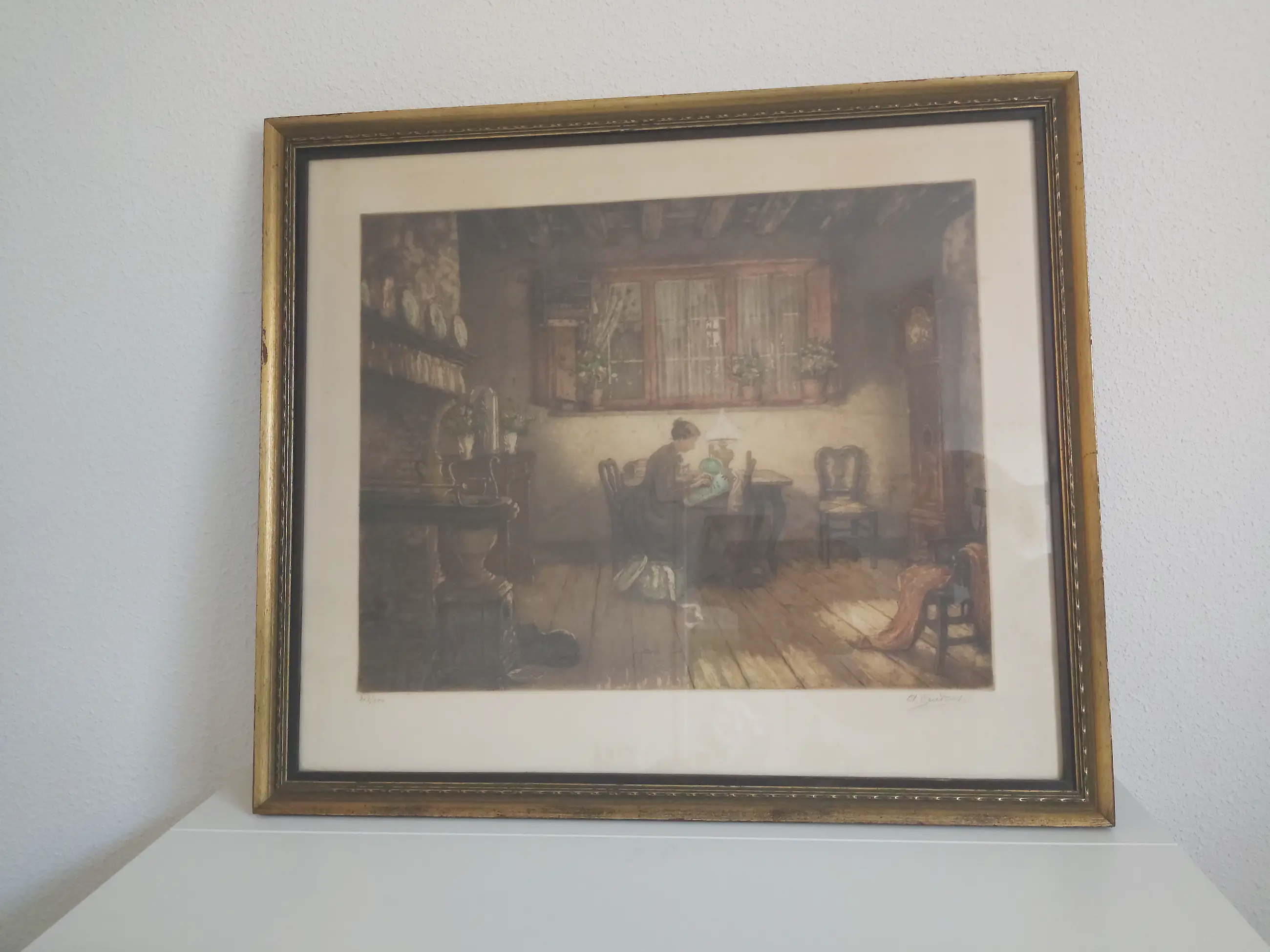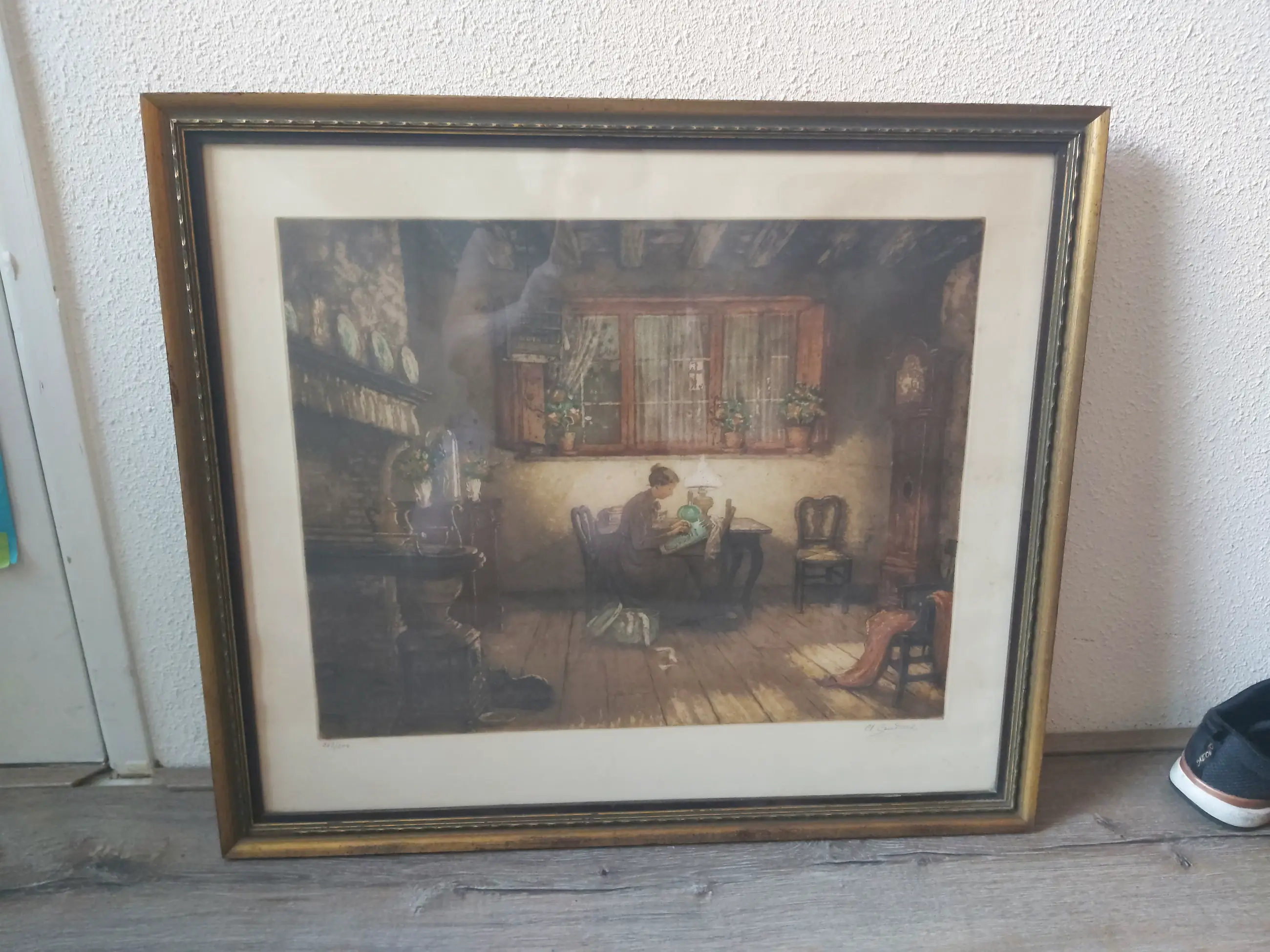 Ets van 40x50 cm met een mooie goudkleurige lijst van 56x65 cm. Lijst heeft aan de linkerkant een kleine beschadiging.