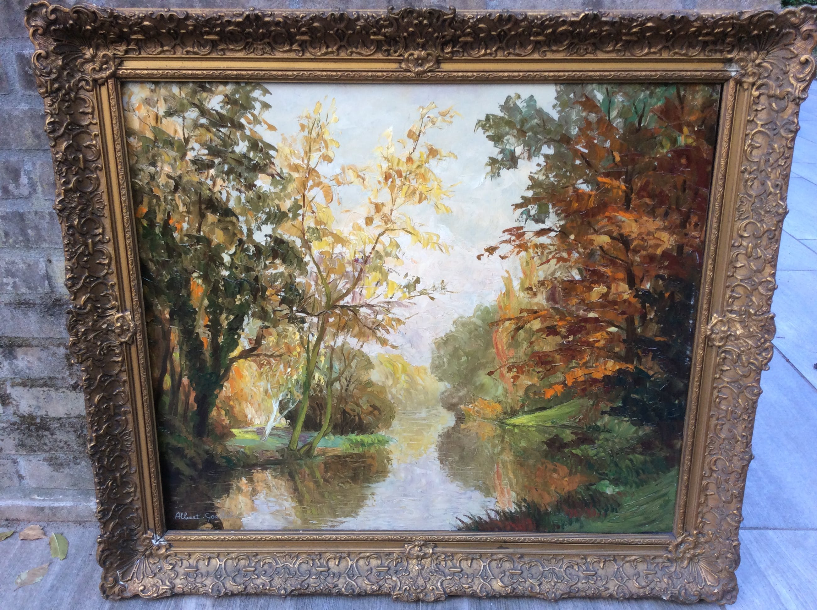 Dit schilderij is een schitterend impressionistisch zomers gezicht op de Singel te Brugge. Ingelijst in een indrukwekkende lijst, waardoor het schilderij nog meer tot uiting komt.Olieverfschilderijen van Goethals zijn schaars, dus...bedenk u niet en bied op dit mooie werk!