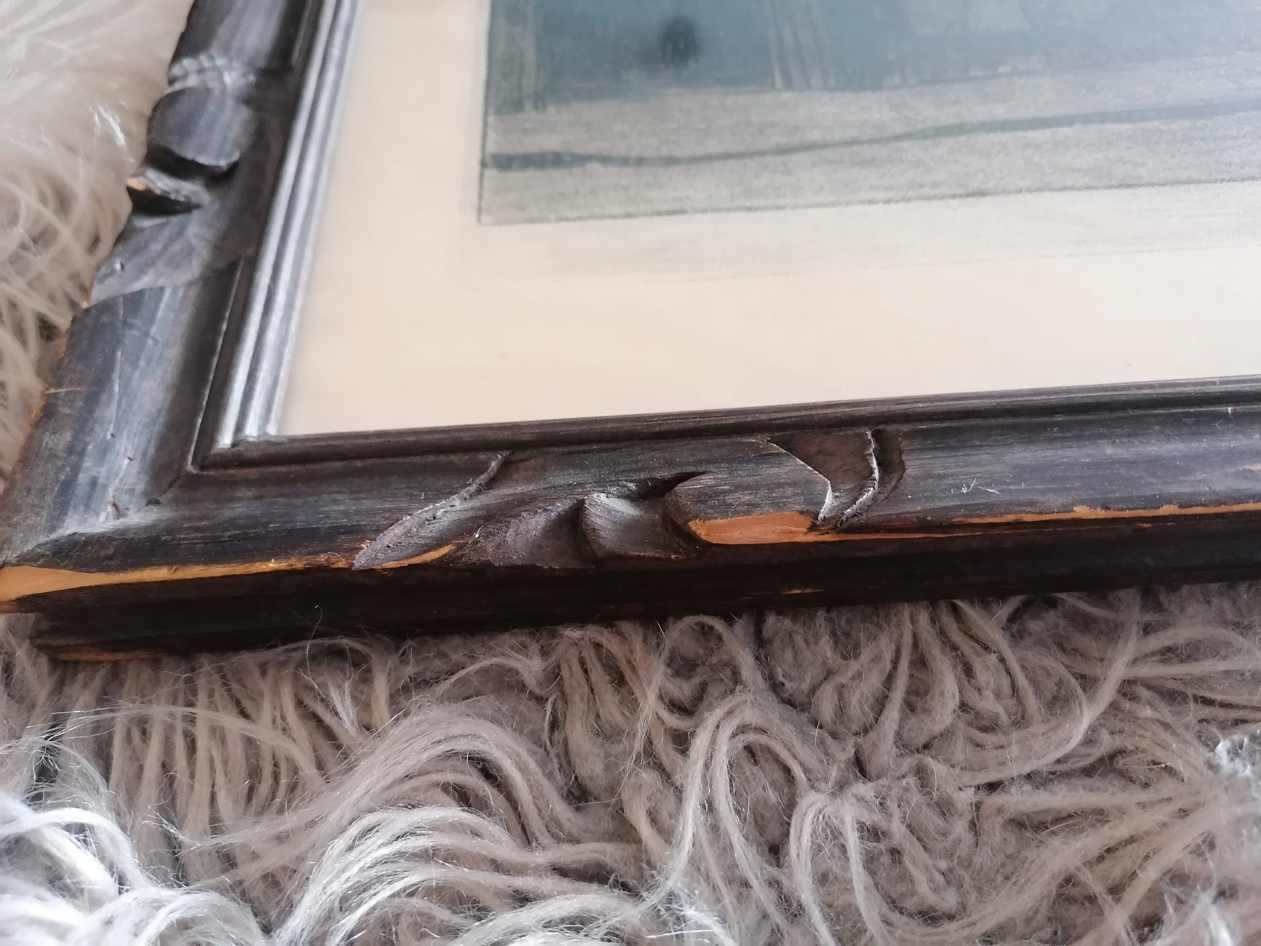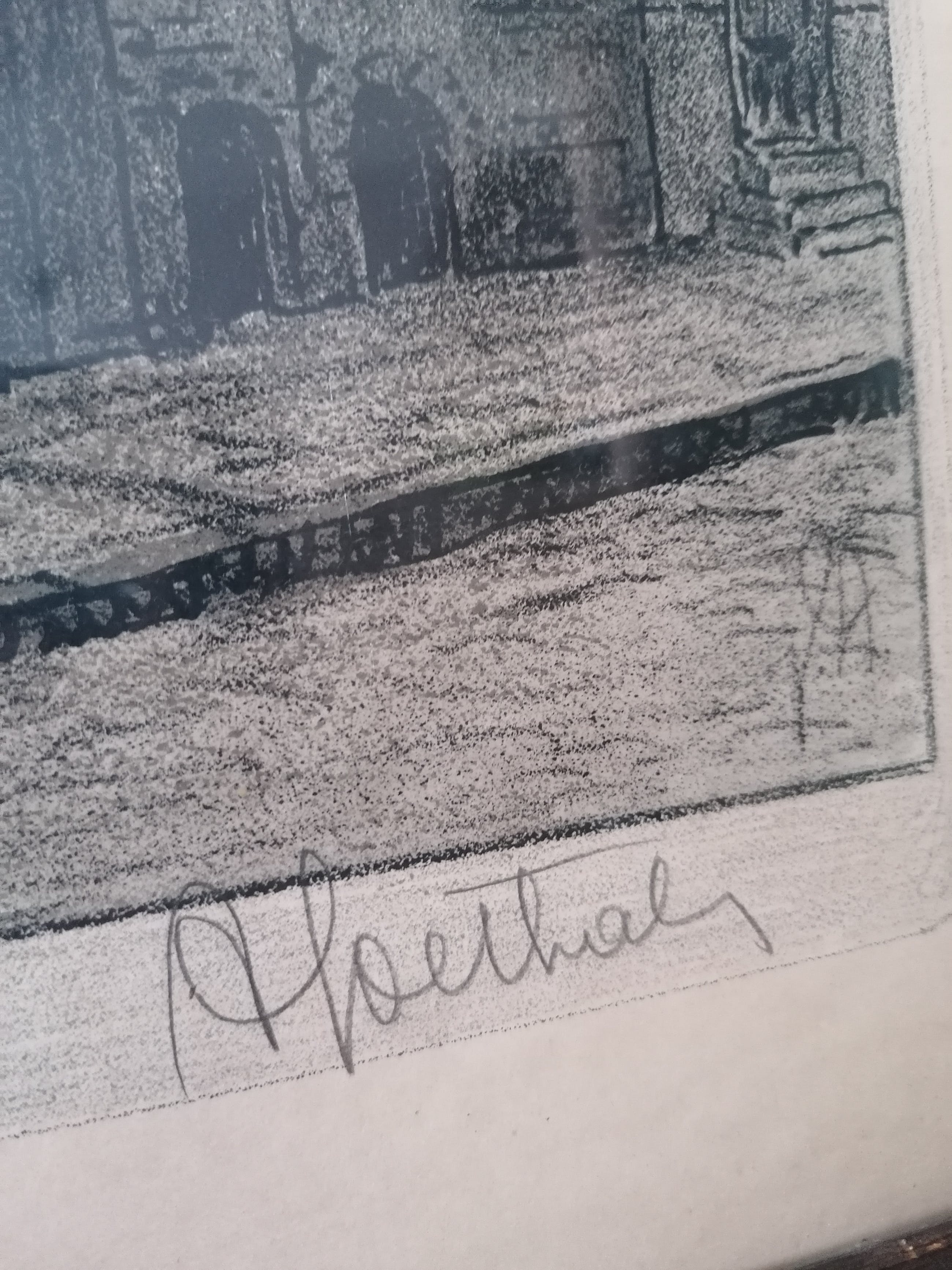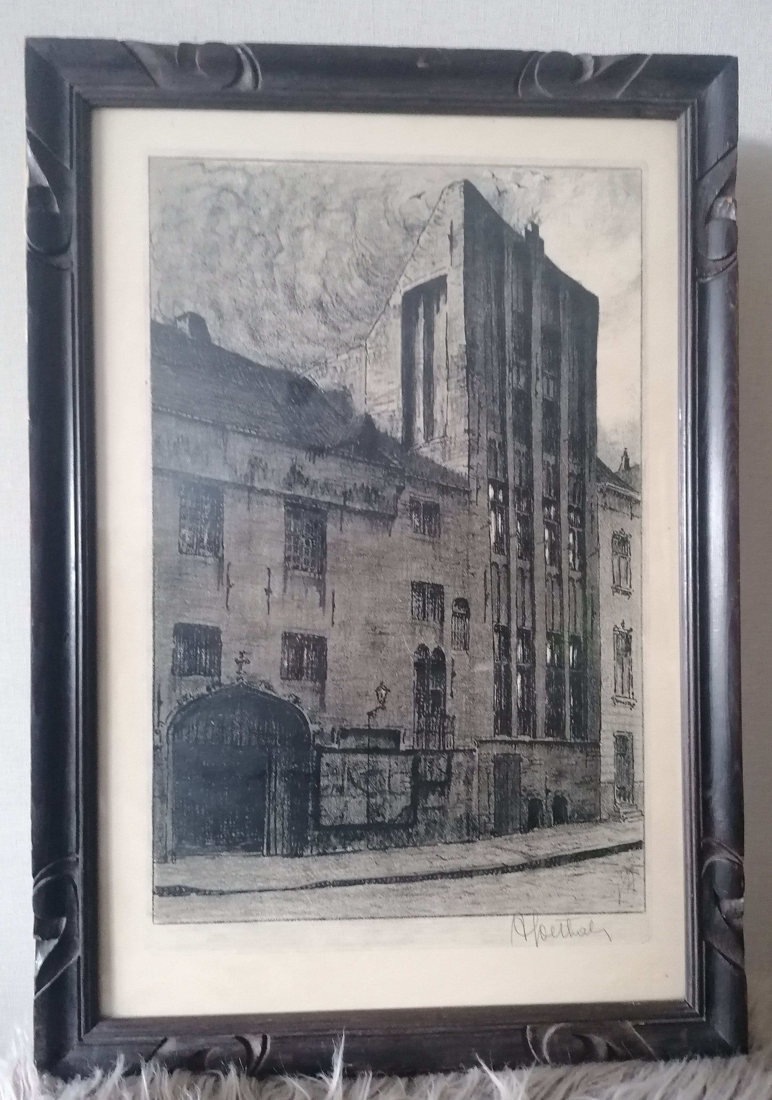 Mooie ets van kunstschilder Albert Goethals.De afbeelding is Het zwarte huis (cinema) in de Kuipersstraat in Brugge. Ets in zeer goede staat enkel het houten kader heeft onderaan wat lichte schade.