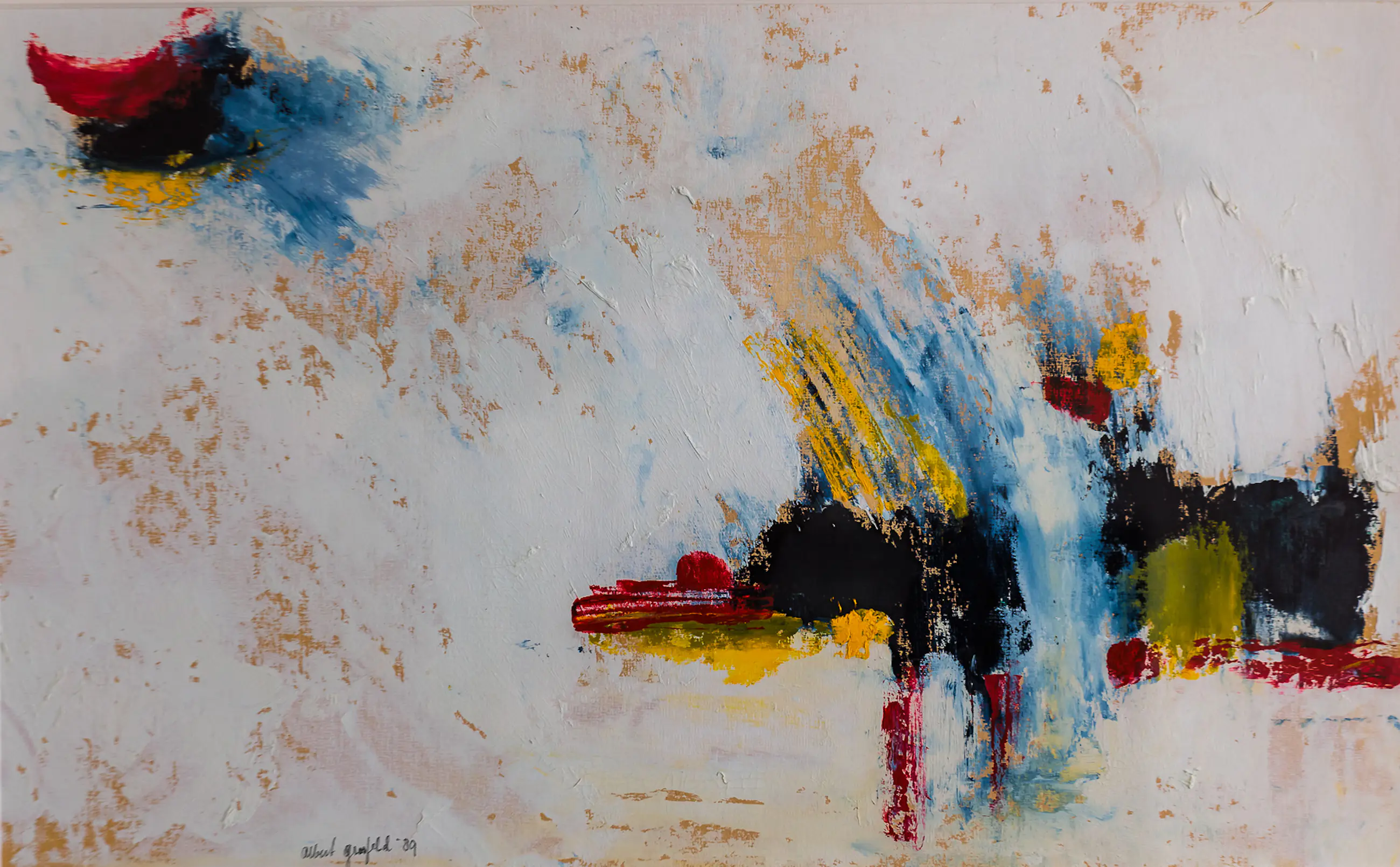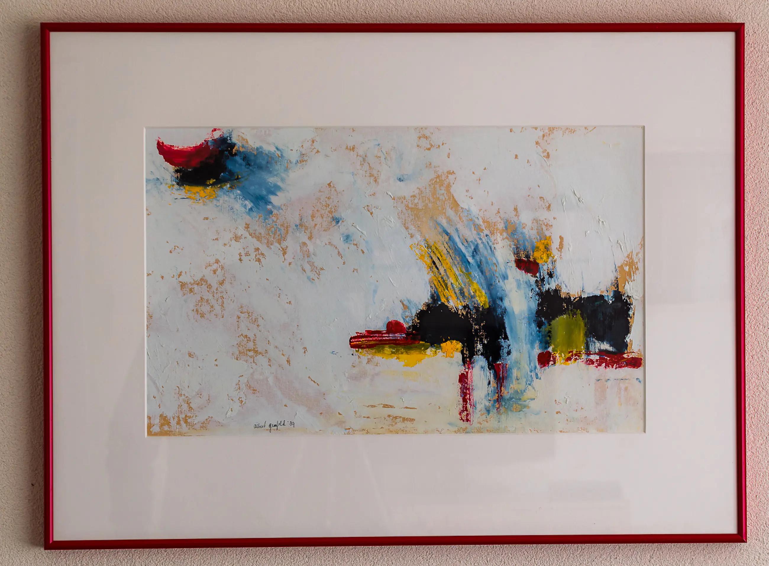 Abstracte Landschap Aquarel van in wit museum passepartout. in een rode lijst, voorzien van ontspiegeld museum glas.
