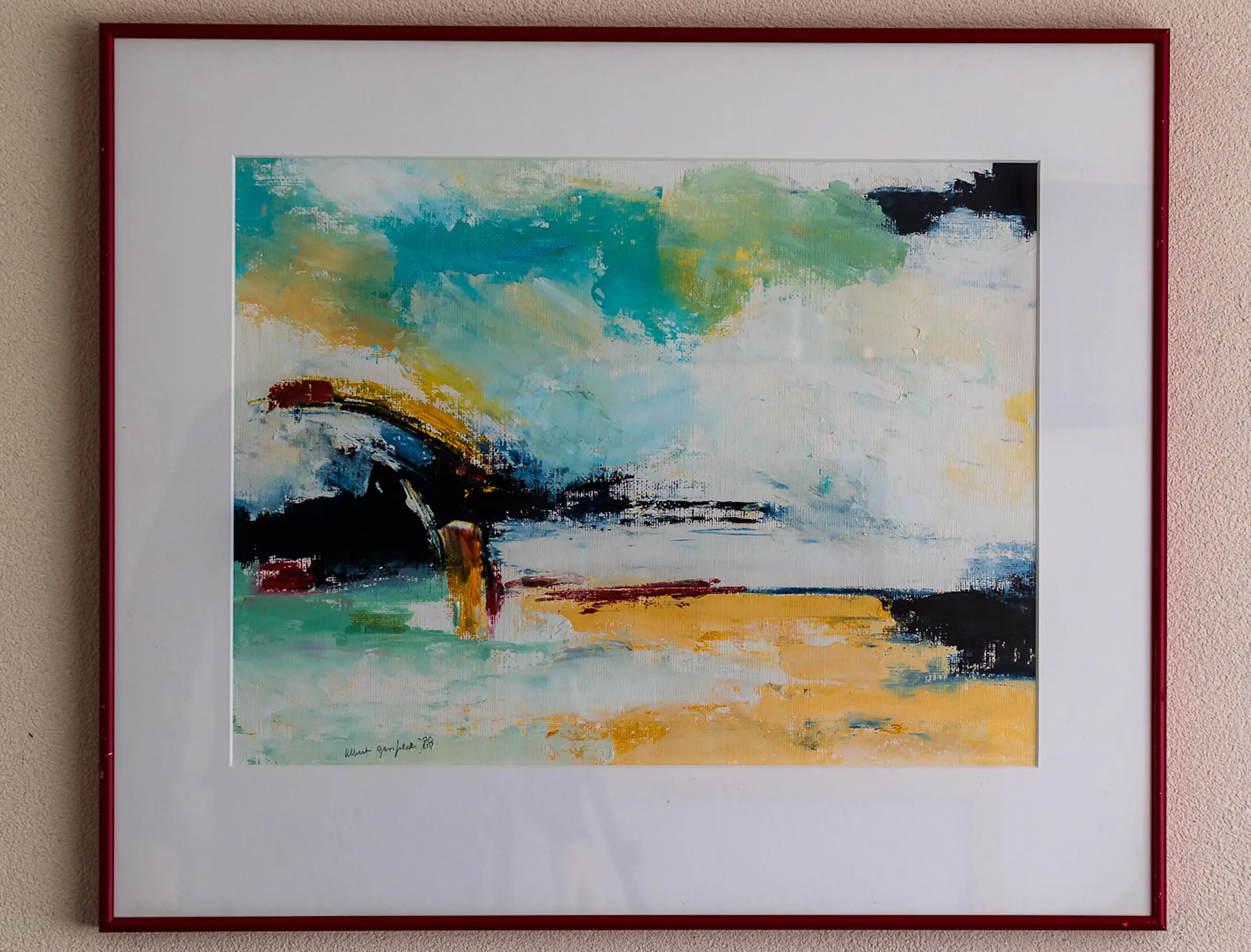 Abstracte Landschap Aquarel van in wit museum passepartout. in een rode lijst, voorzien van ontspiegeld museum glas.