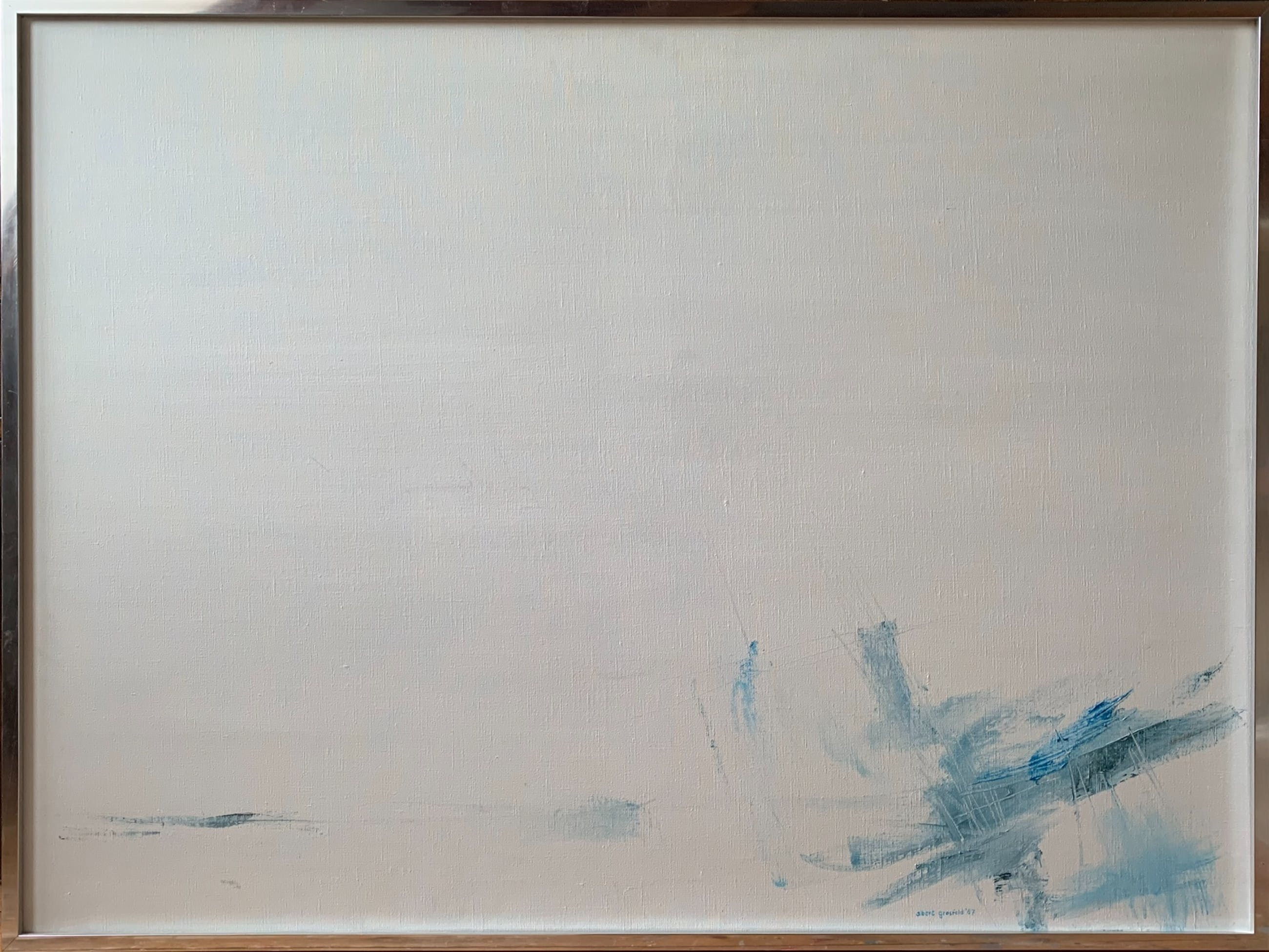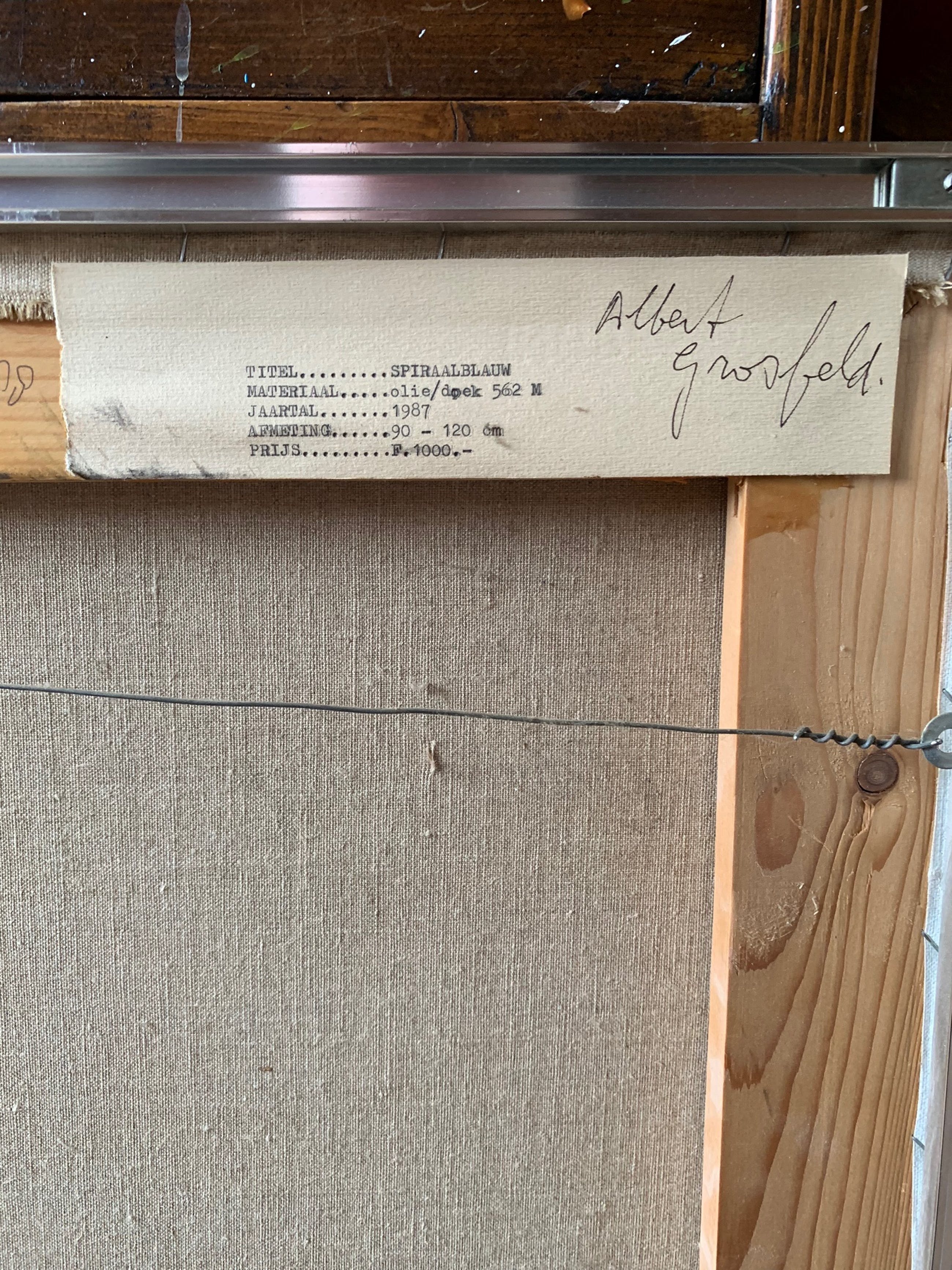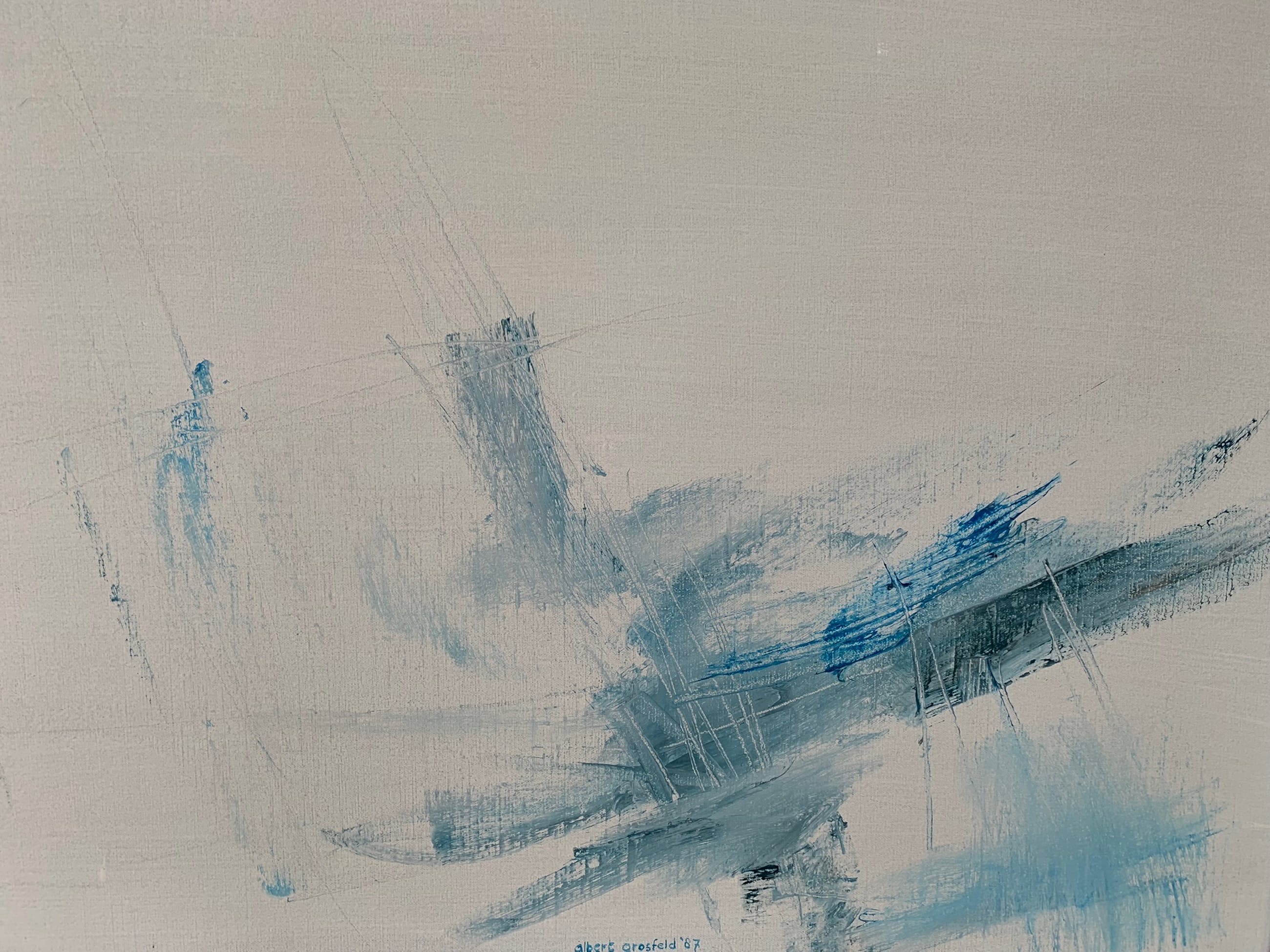 Prachtig olieverf schilderij van Albert Grosfeld, in 1987 rechtstreeks van hem gekocht tijdens een bezoek aan zijn atelier.Een gedreven kunstenaar van weinig woorden maar in zijn schilderijen een veelzeggende verteller.Albert Johannes (Albert)(1931-2014), beeldend kunstenaar, graficus, schilder. Albert Grosfeld schilderde abstracte thema's, landschappen en liet zich beïnvloeden door de natuur die hij impressionistisch weergaf in aquarellen, olieverven en pastels. Zijn opleiding genoot hij aan de Jan van Eyckacademie Maastricht met Sef Moonen als leermeester. Albert Grosfeld gaf zelf ook les aan het Nationaal Hoger Instituut voor Schone Kunsten Antwerpen. Over Albert Grosfeld is in 1967 een publicatie verschenen. Hij was lid van verschillende kunstverenigingen zoals IKP Internatonale Kunst Promotie de Maasvallei. Grosfeld heeft aan verschillende groepsexposities meegedaan, alsmede solotentoonstellingen. Een uitspraak van hem is: "In schilderijen herken ik mezelf pas geboren uit handen van anderen". Prachtige schilderijen en verstilde aquarellen kwamen van zijn hand vanuit zijn eenvoudige atelier met schildermateriaalmeubels die hij zelf getimmerd had.