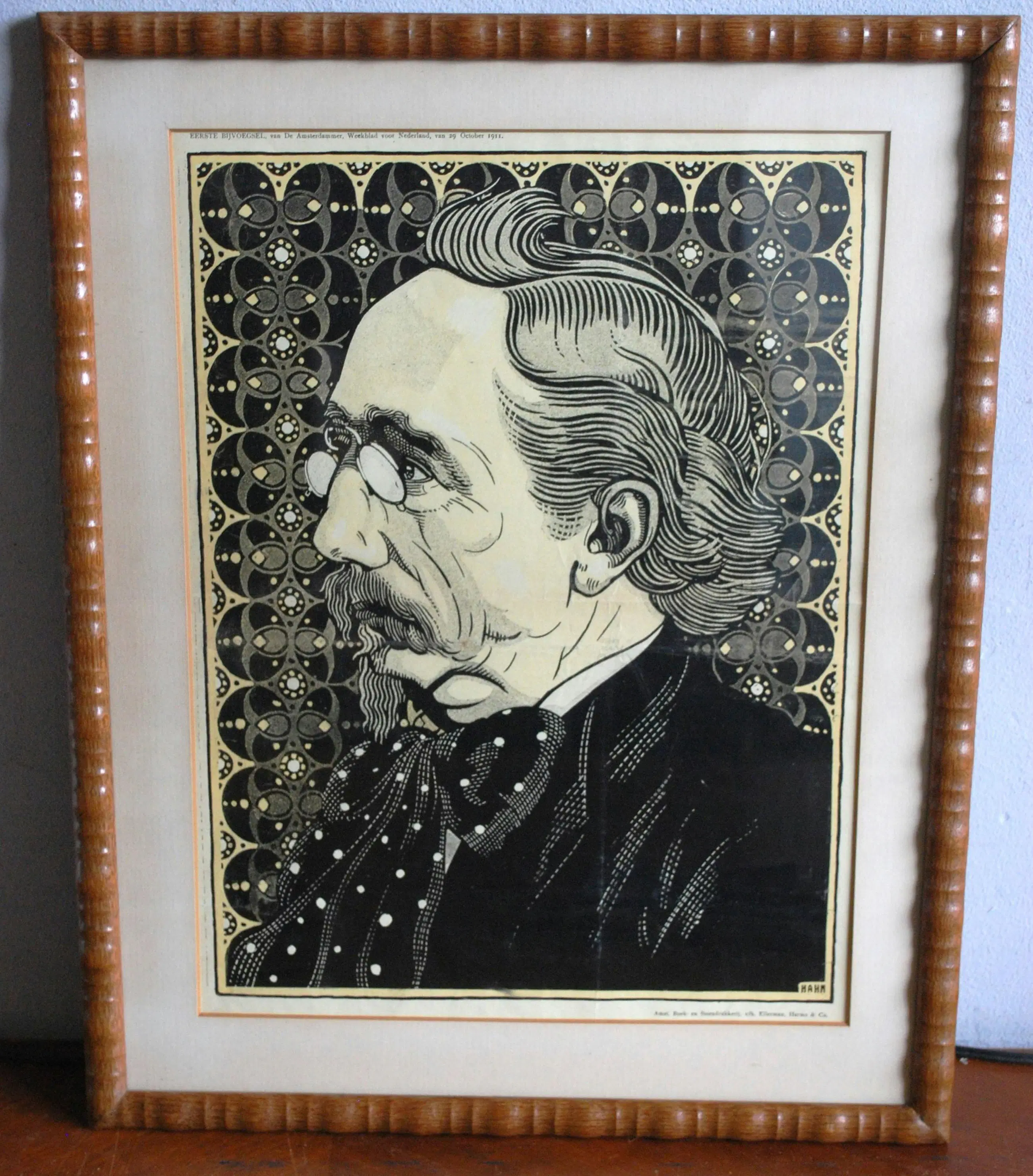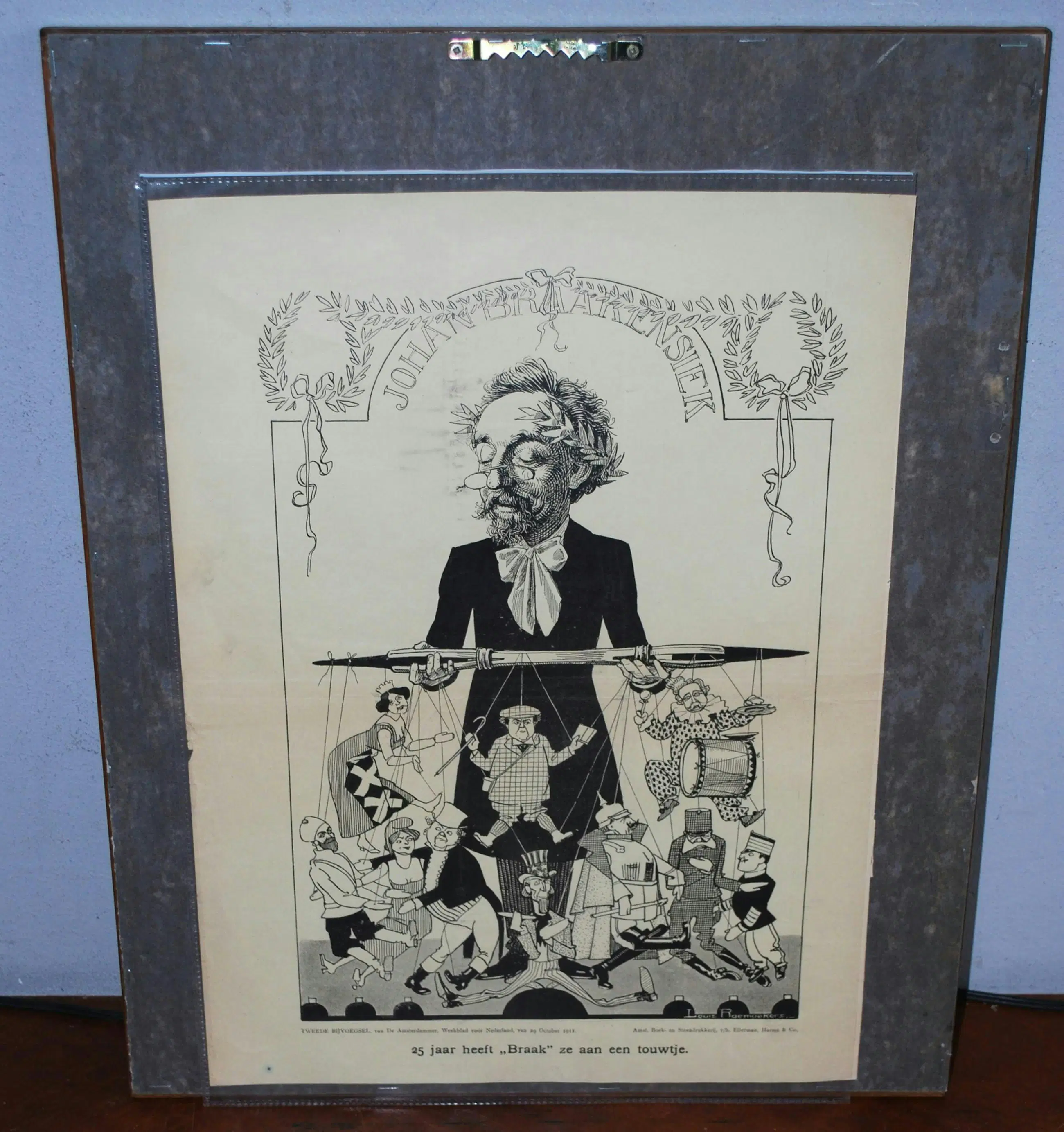 - 1e bijvoegsel door Albert Hahn: Johan Braakensiek, steendruk, achter glas en passepartout, in een periode lijst.