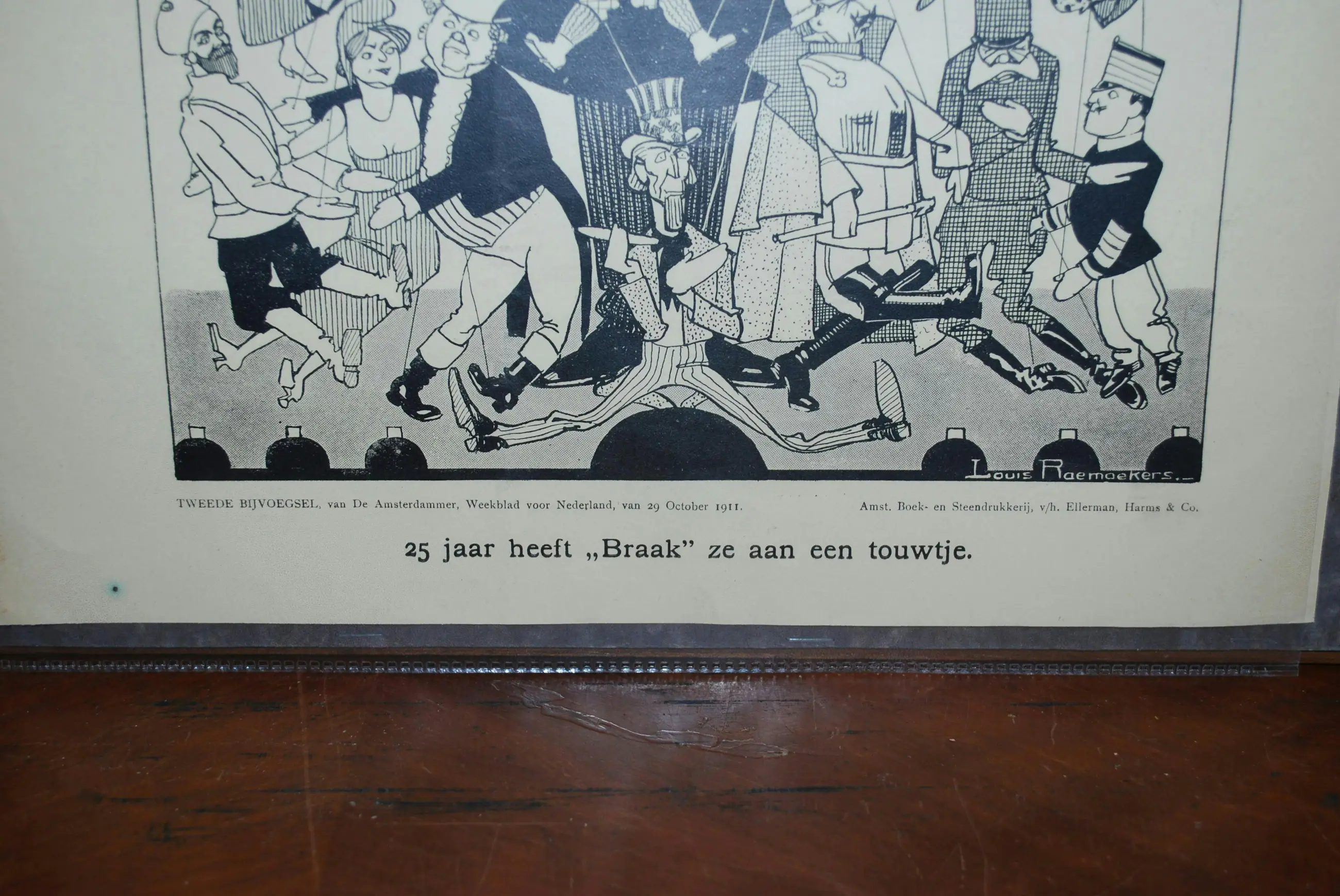 - 2e bijvoegsel door Louis Raemakers (1869-1956), ook voorstelling Johan Braakensiek, prent (boekdruk waarschijnlijk) in dezelfde maat, los in een insteekhoes.