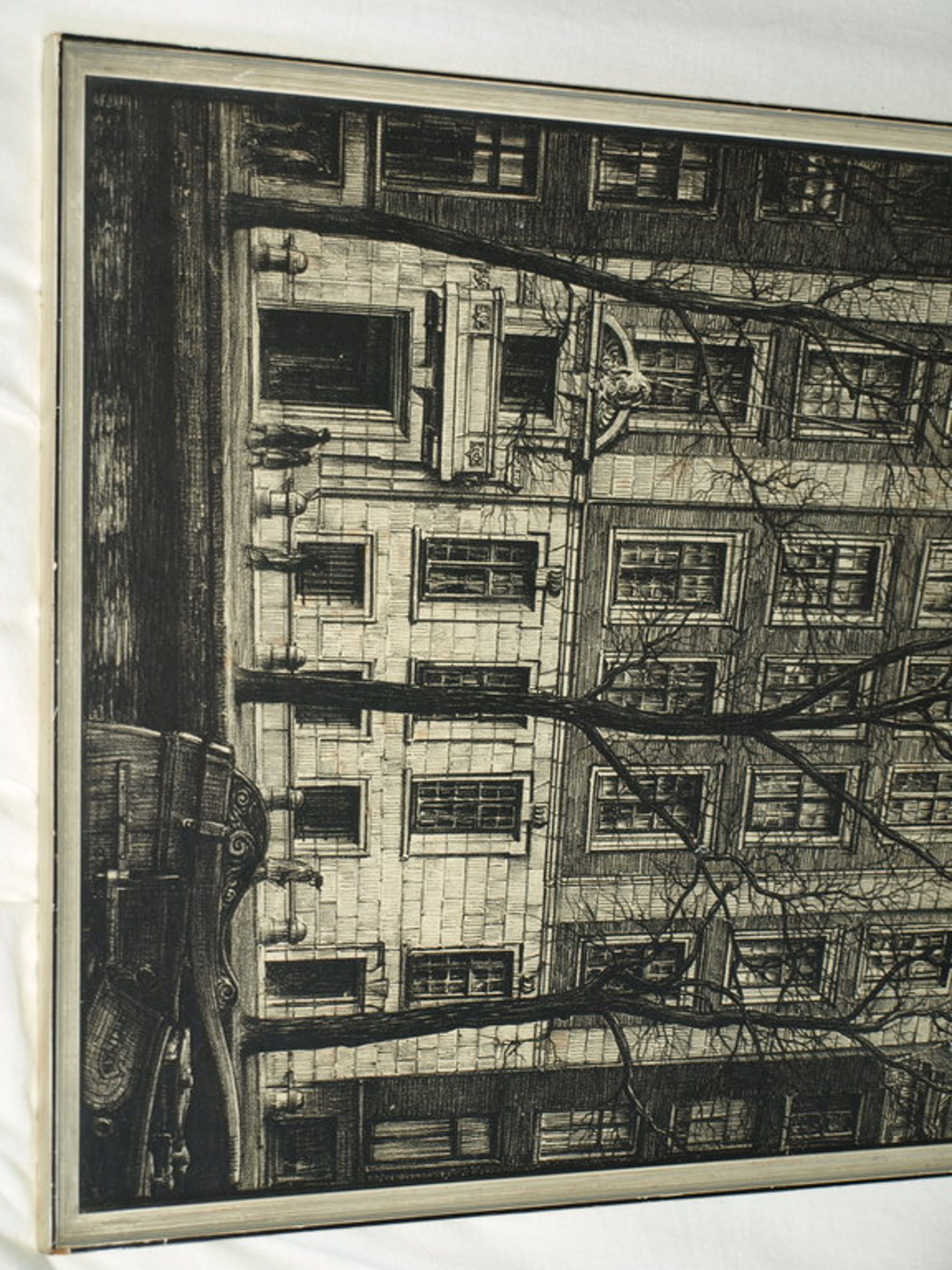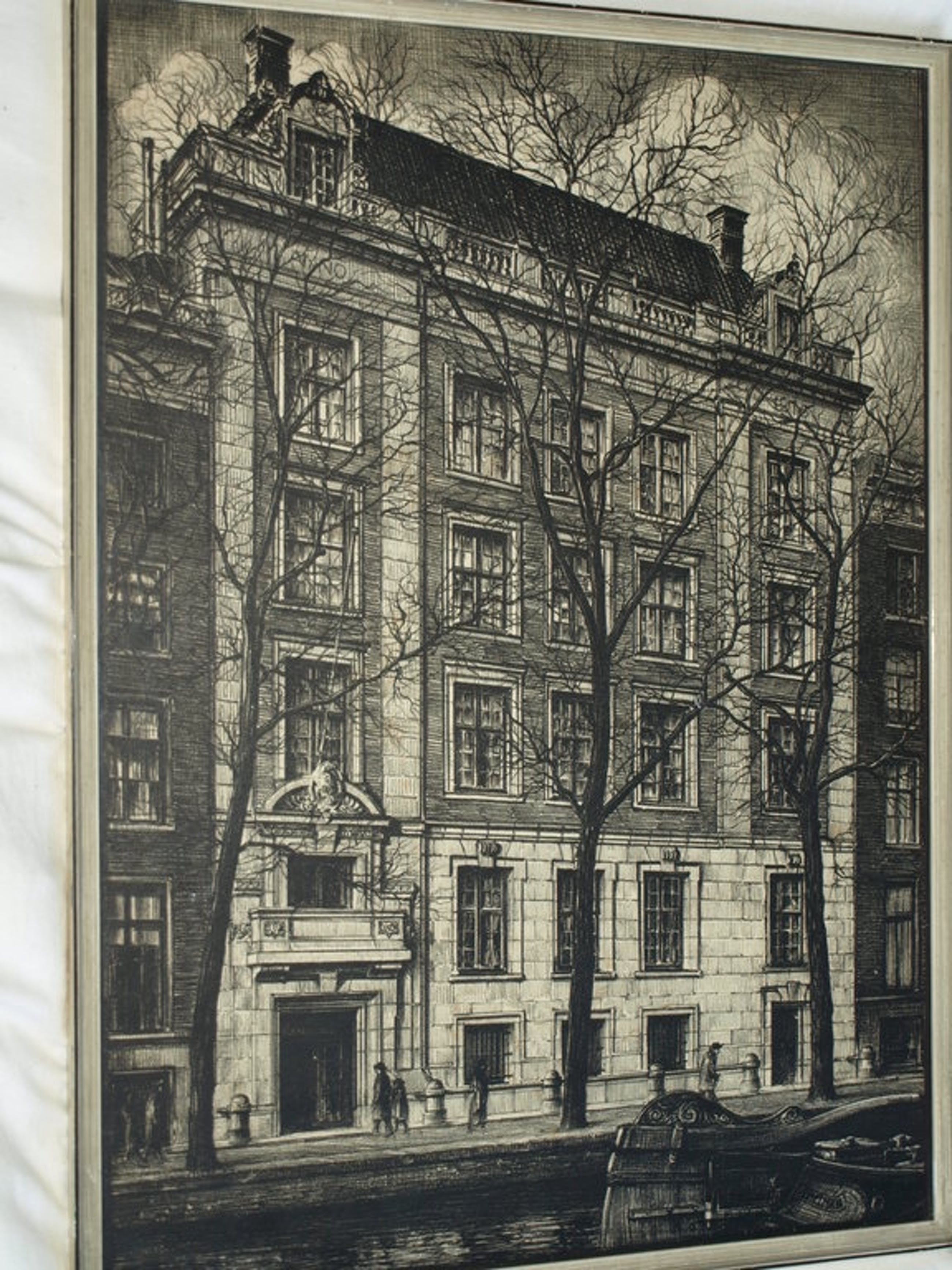 Een litho van de Nederlandse kunstenaar Albert Hemelman, gemaakt in ca 1935 met een voorstelling van een groot pand aan een Amsterdamse gracht.