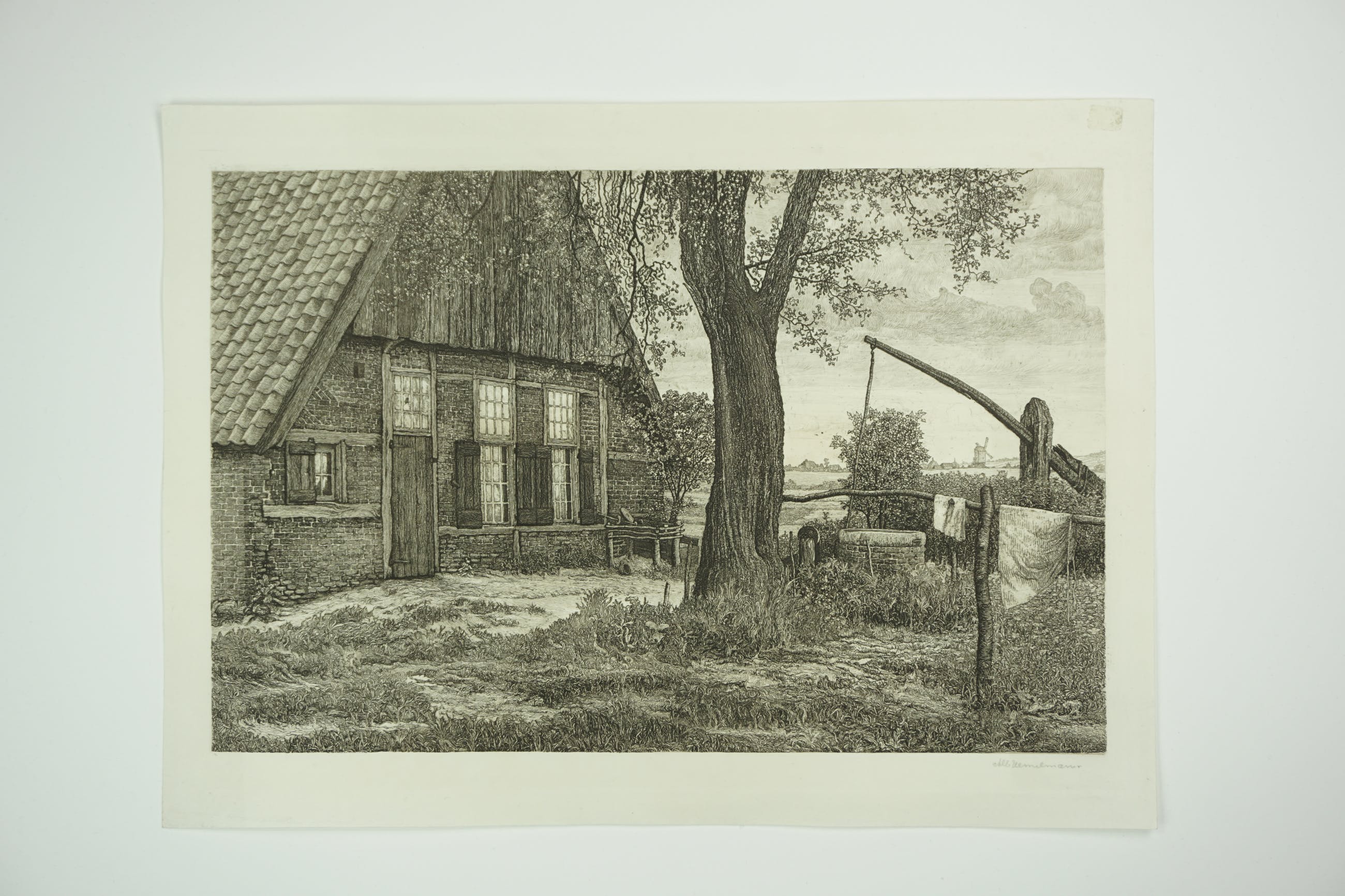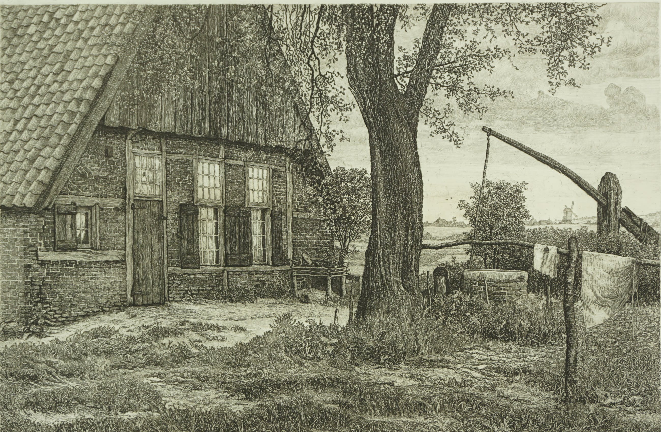 Ets van een boerderij met put gemaakt door Albert Hemelman.