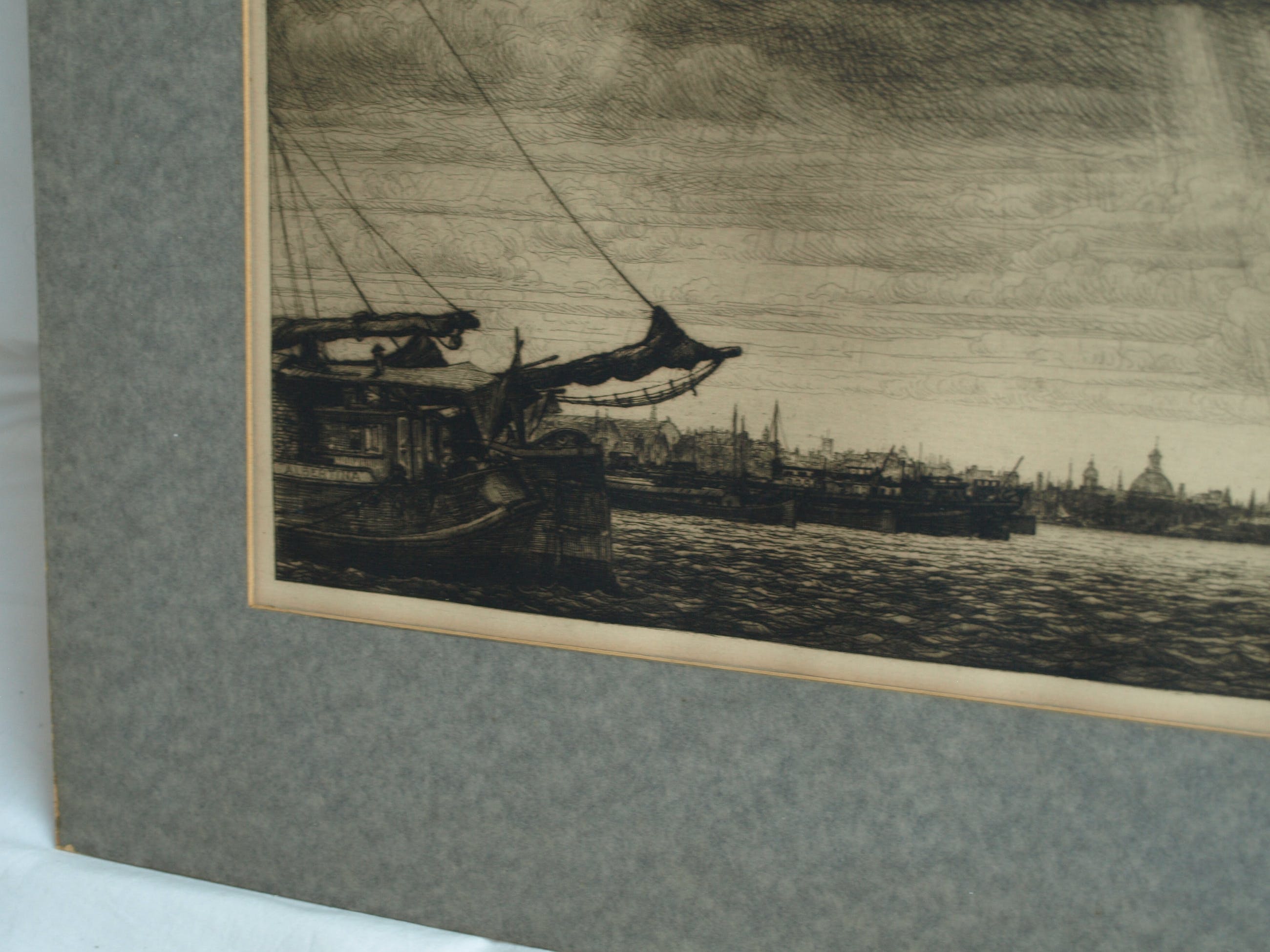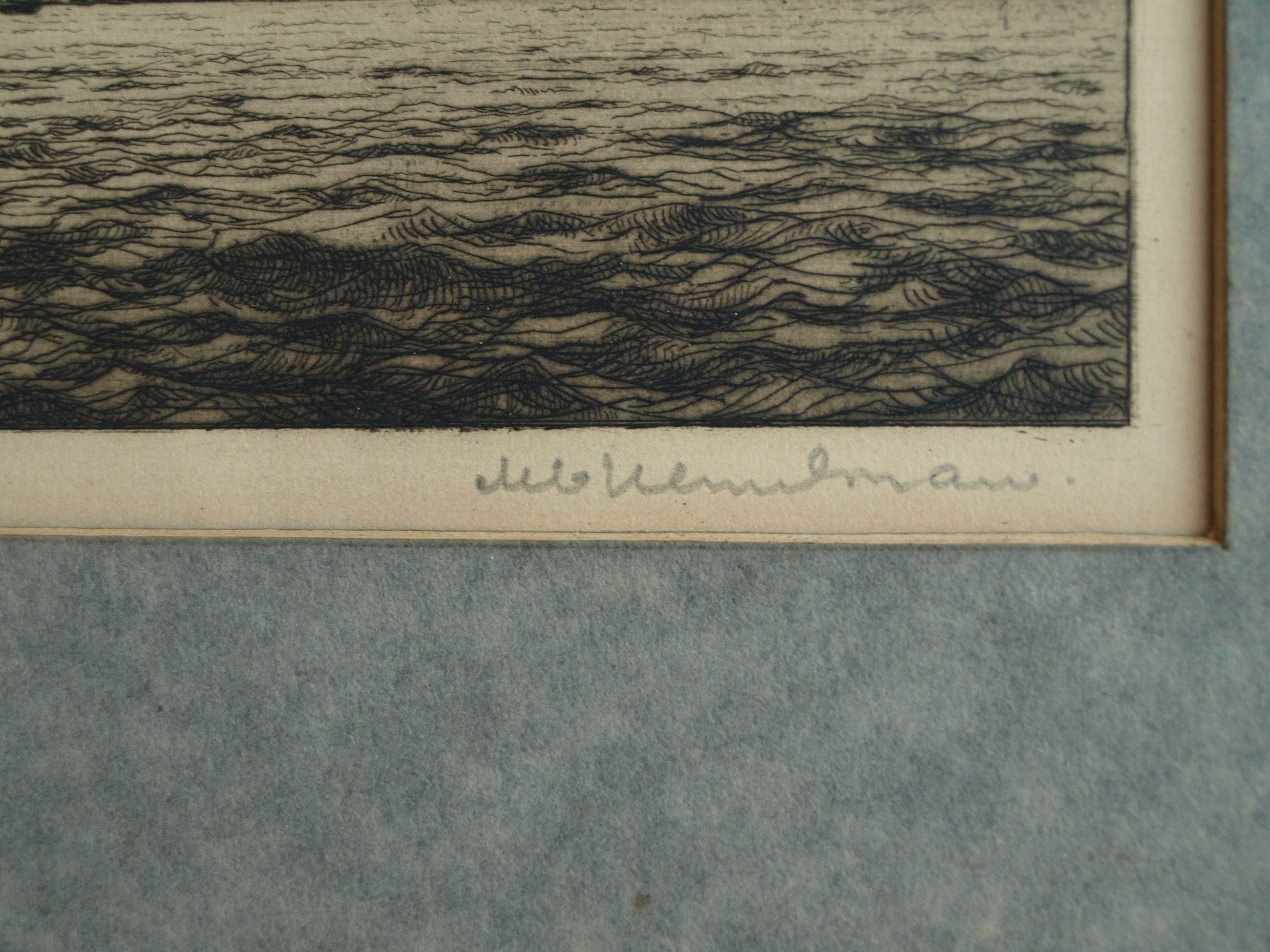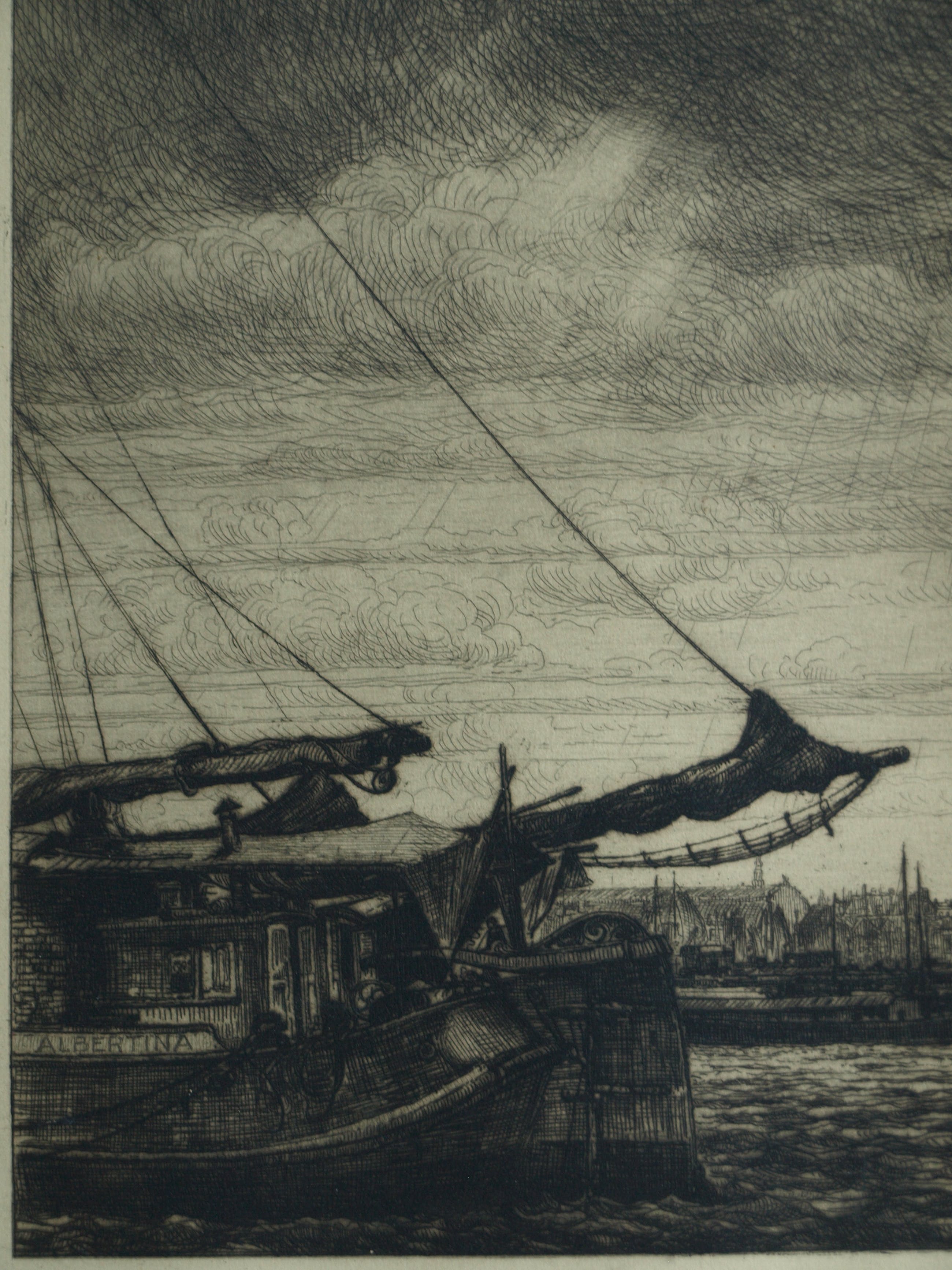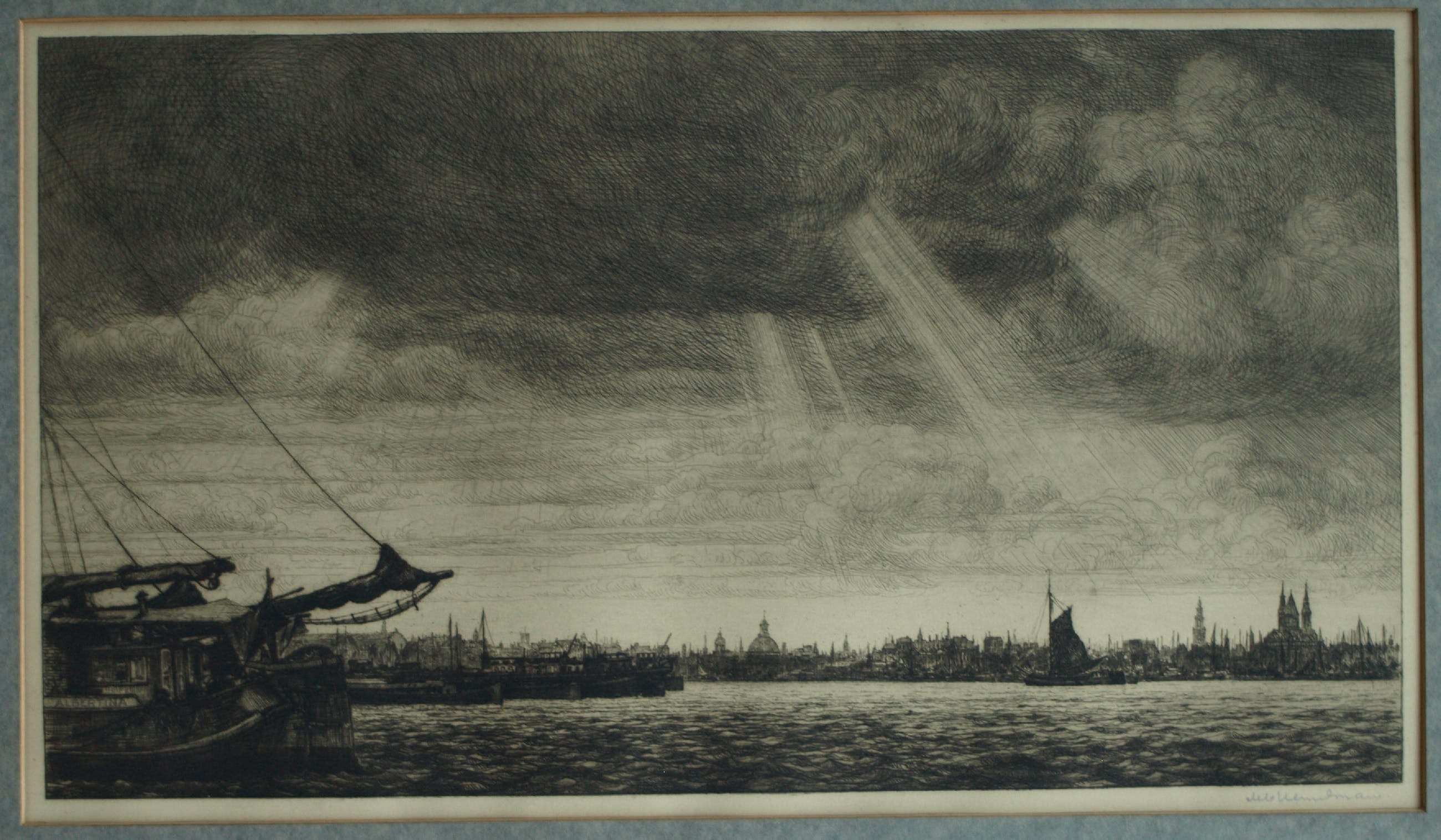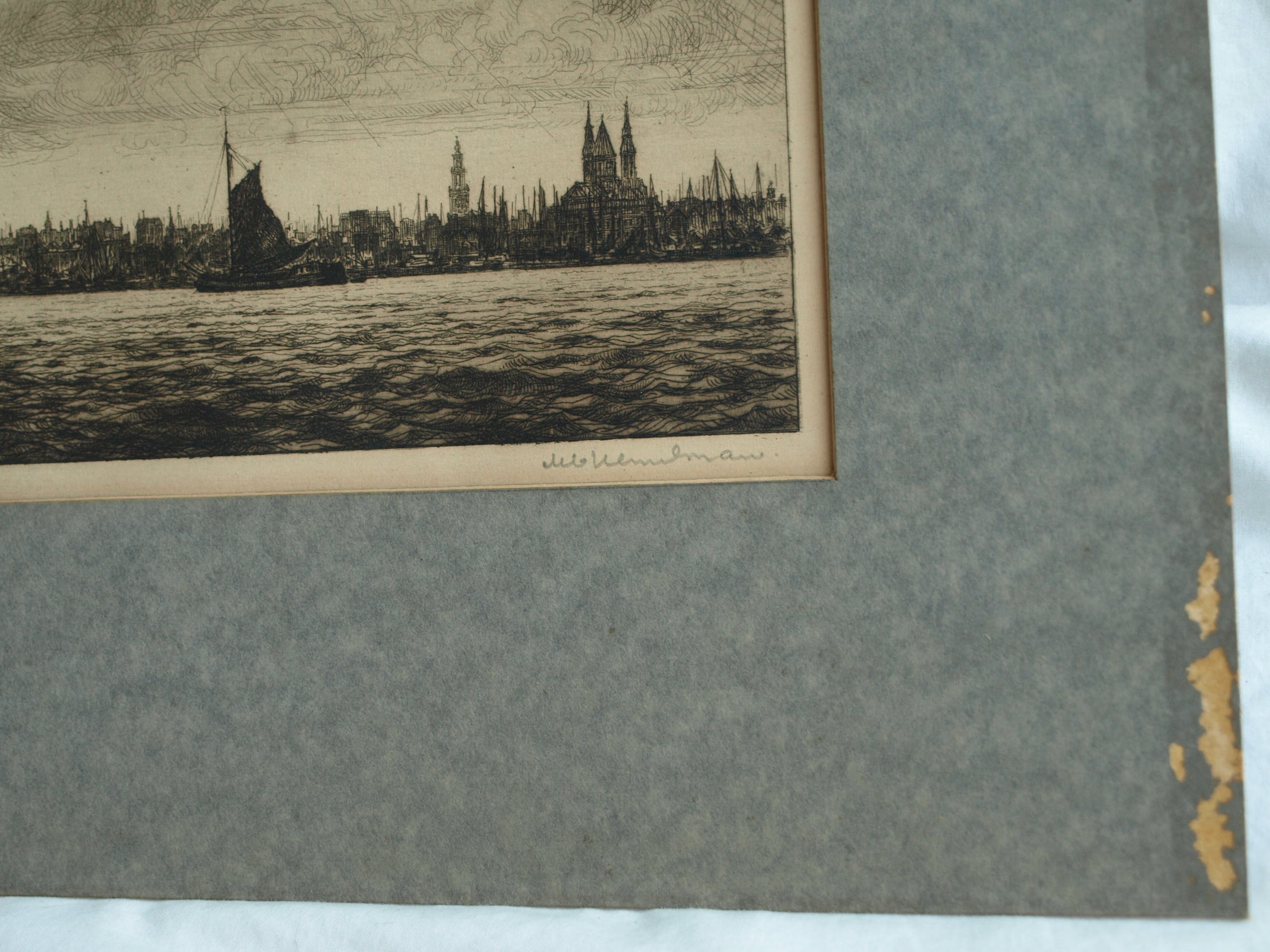 Een ets van de Nederlandse kunstenaar Albert Hemelman (1883-1951), met een voorstelling van Amsterdam, gezien vanaf het IJ.