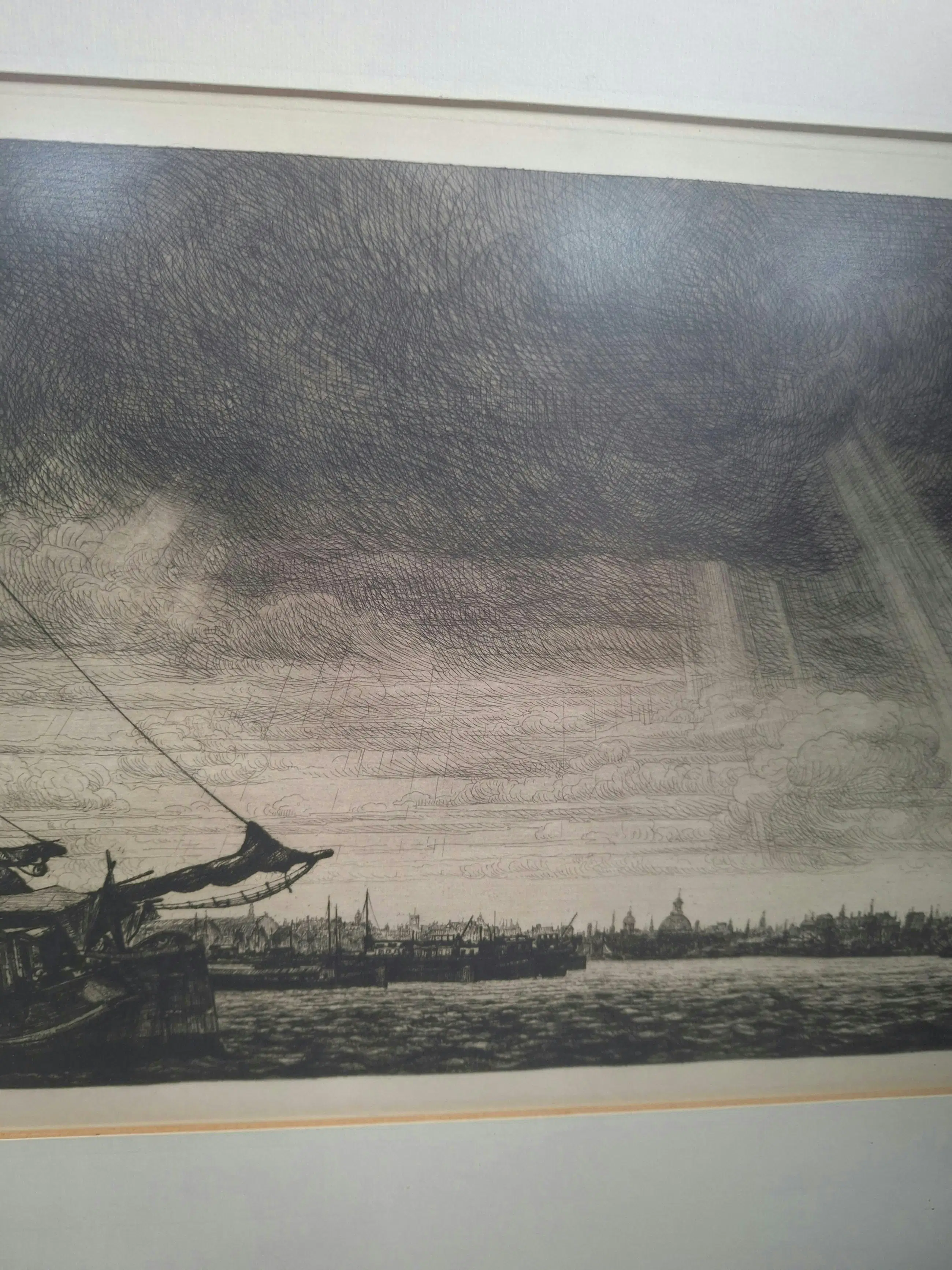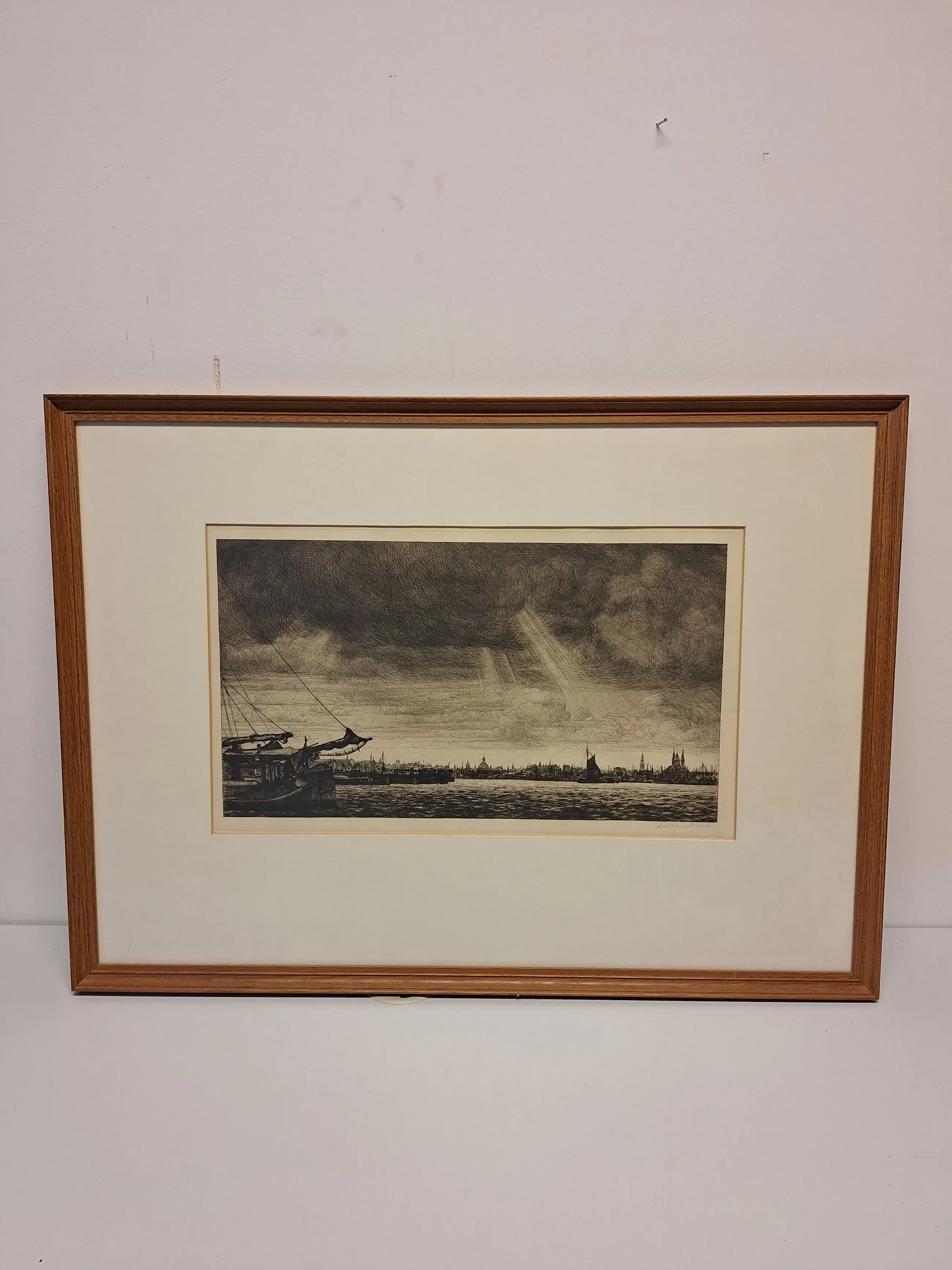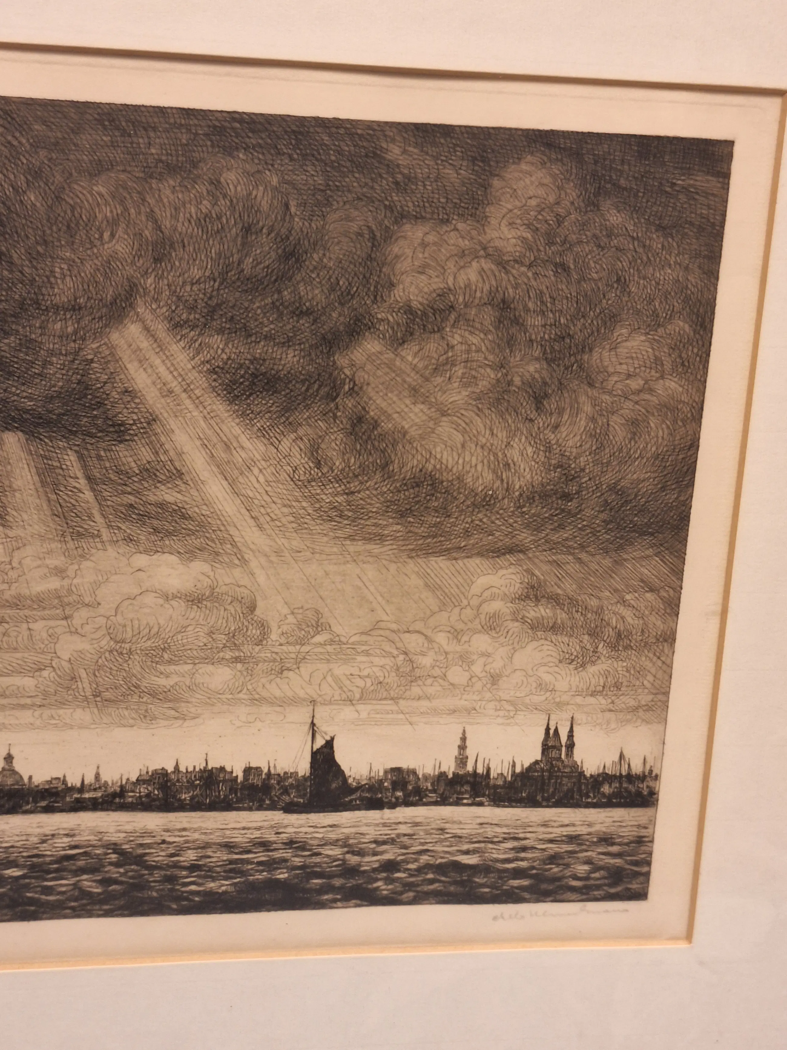 Prachtige ets van Amsterdam vanaf het IJ. Originele lijst. Ooit verkocht via Art Gallery Amsterdam.