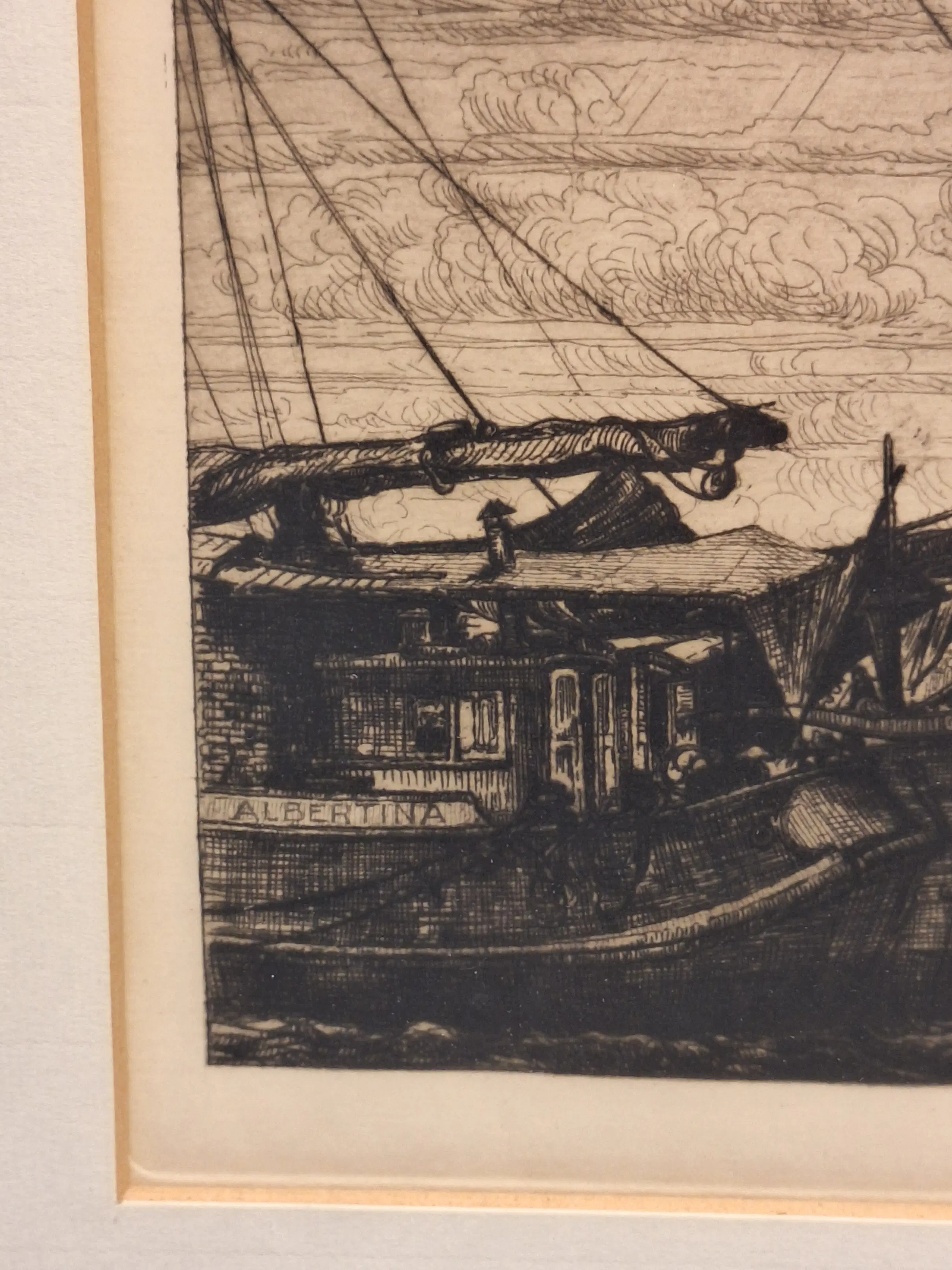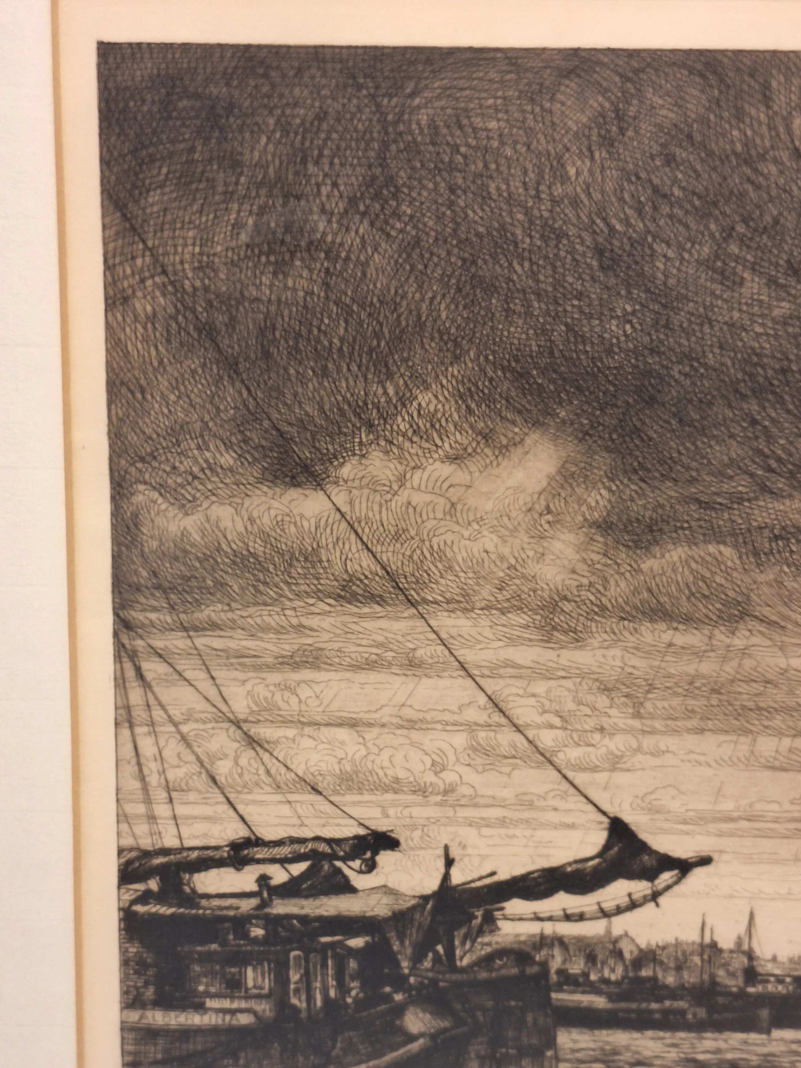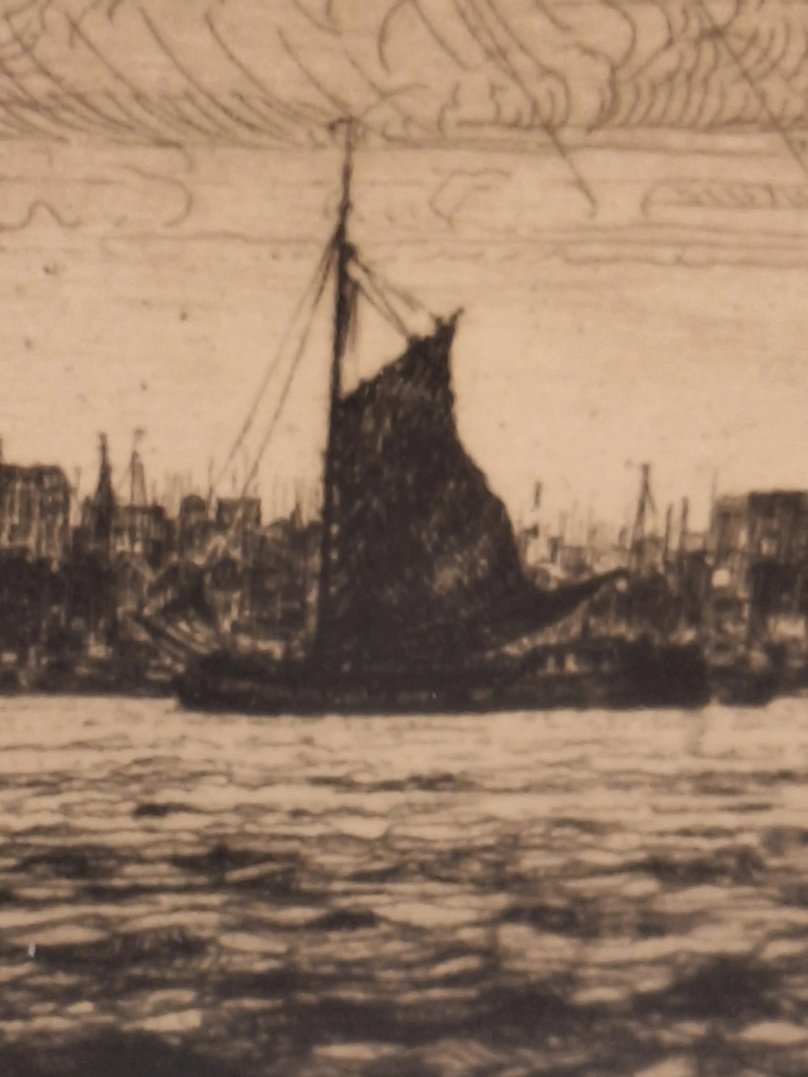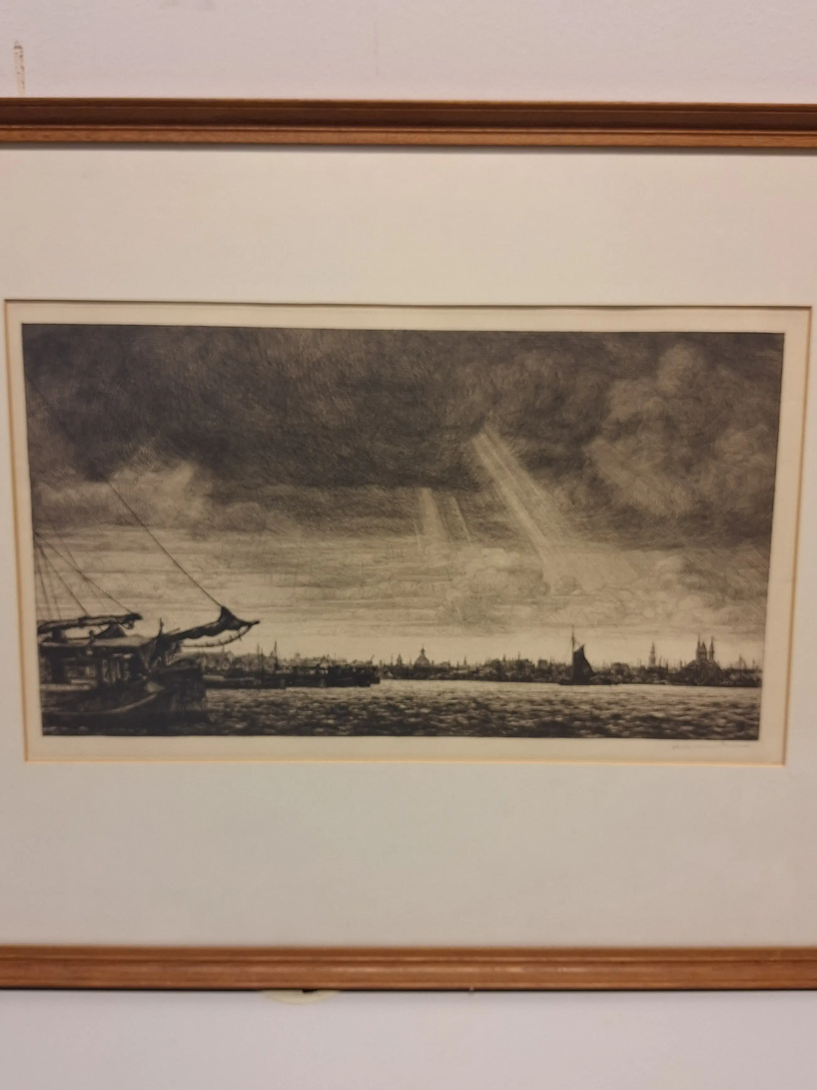 Prachtige ets van Amsterdam vanaf het IJ. Originele lijst. Ooit verkocht via Art Gallery Amsterdam.