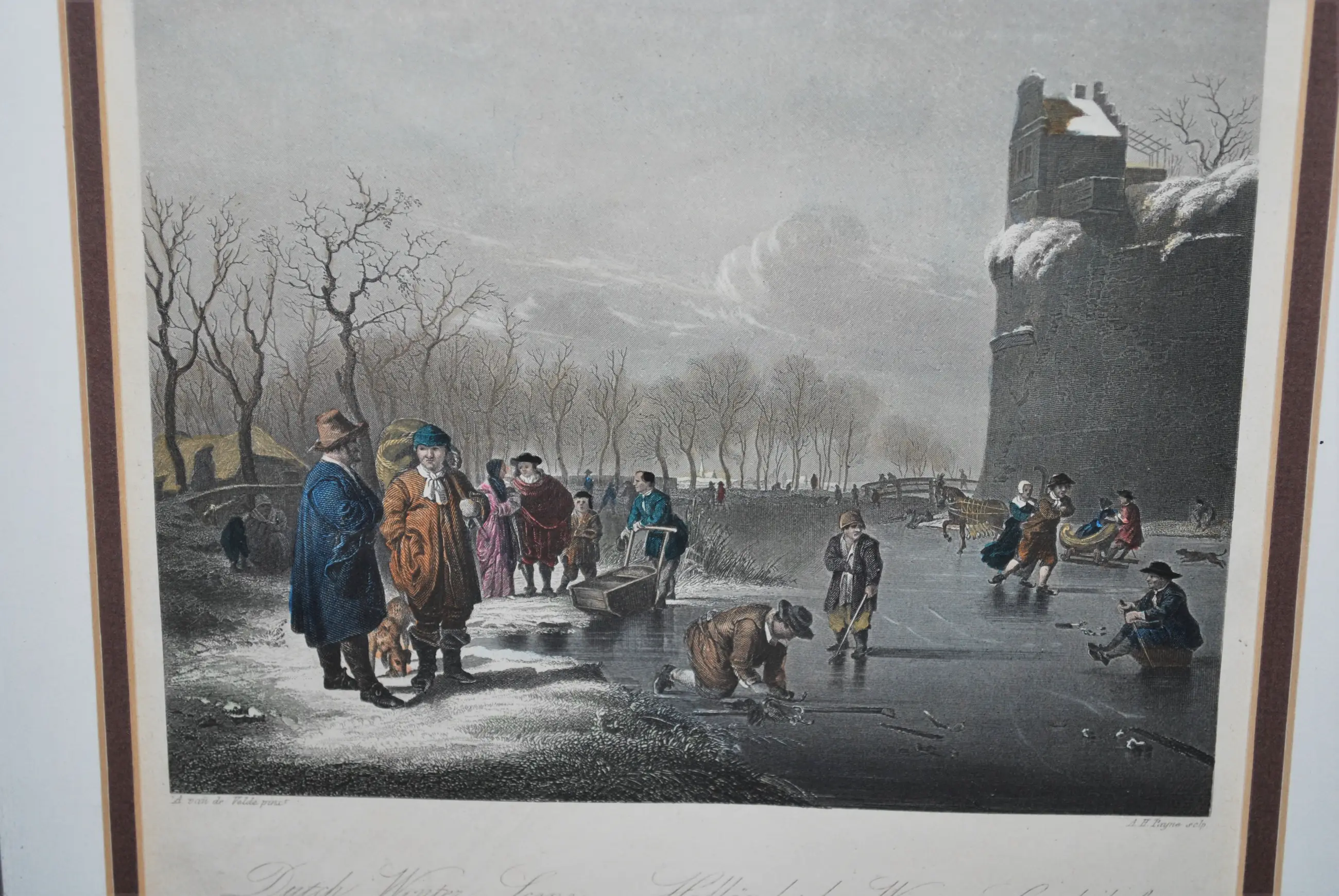 Achter glas ingelijst. De houten lijst heeft lichte schade, 25x25 cm.