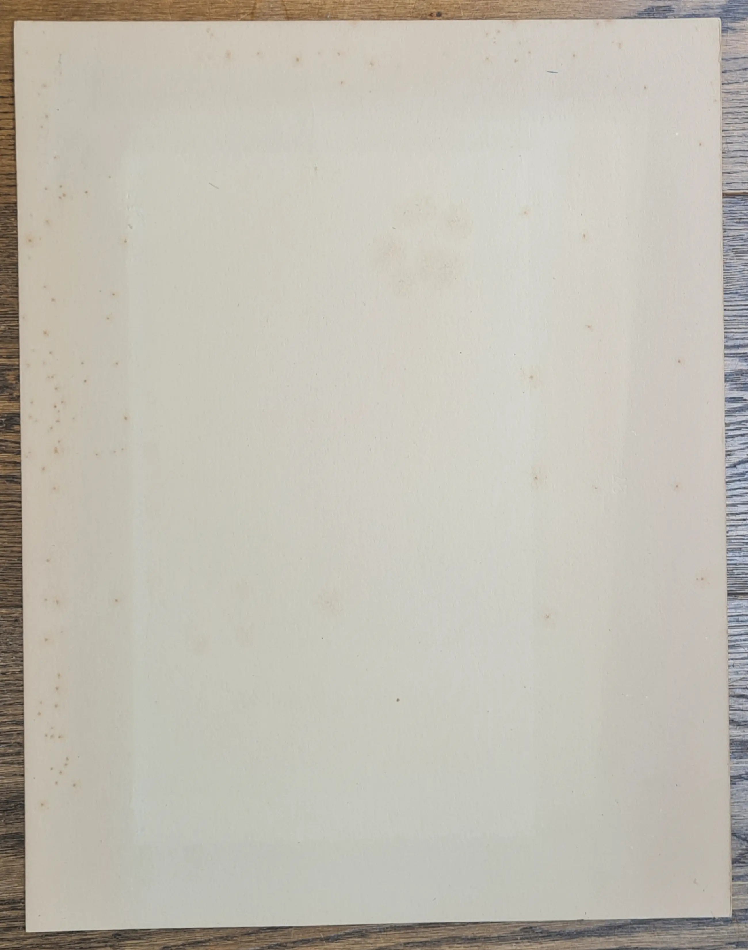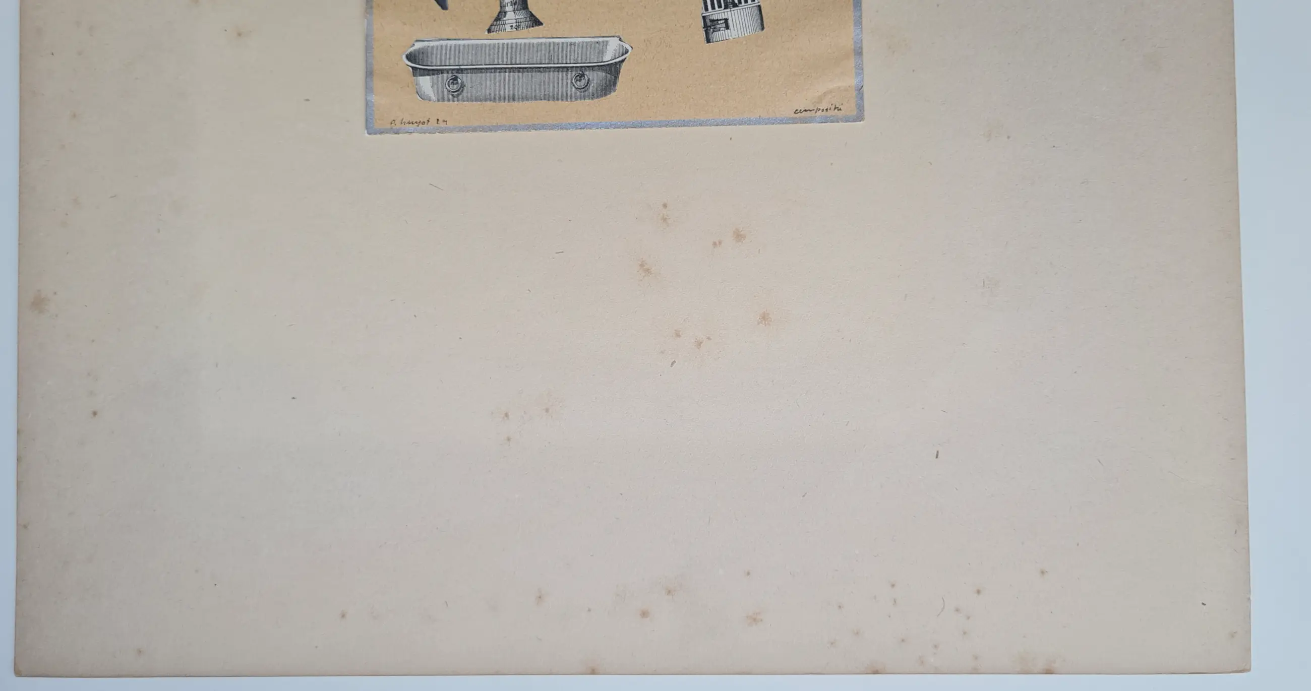 De collage is in de hoeken op een papieren drager gemonteerd, de papieren drager is weer aan de bovenzijde op een andere papieren drager gemonteerd. De papieren drager is roestvlekkig en licht gebruind, zie scans.
