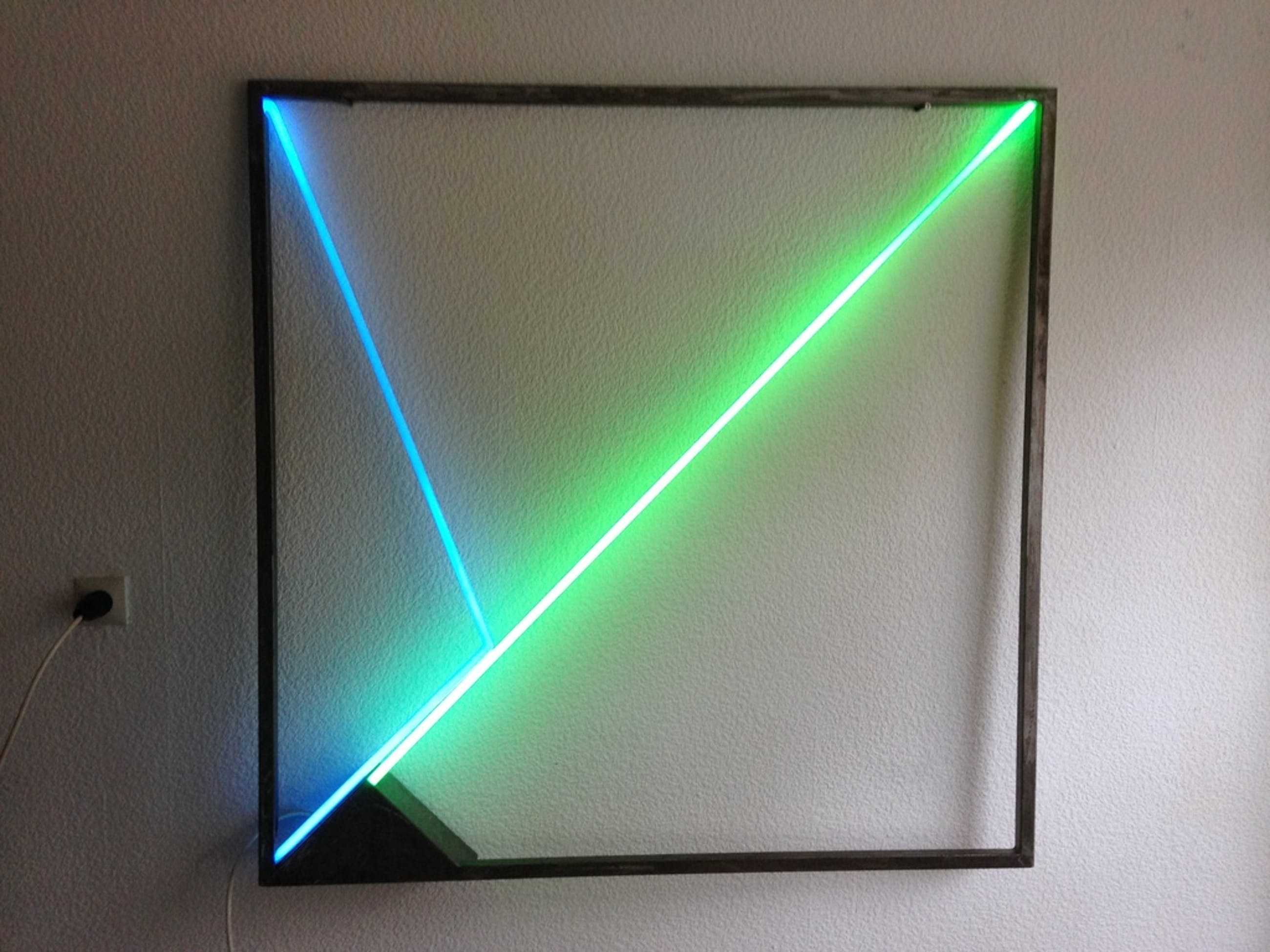 groot neon kunstwerk , subtiel maar toch impossant, een wandobject van de haagse dichter/beeldend kunstenaar albert in't veld afmetingen 125 x 125 cm in goede staat af te halen