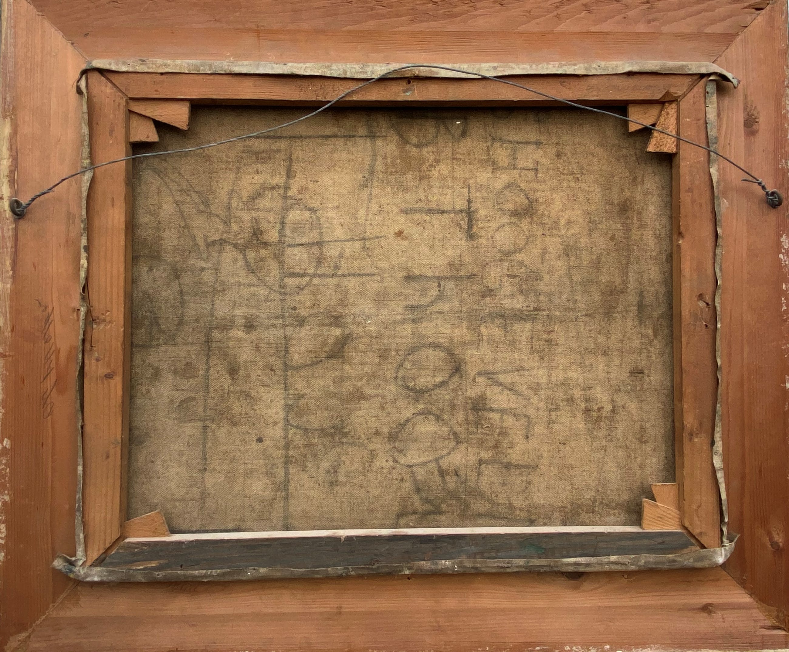 | Lijst in goede conditie, schilderij moet opnieuw opgespannen worden. | |