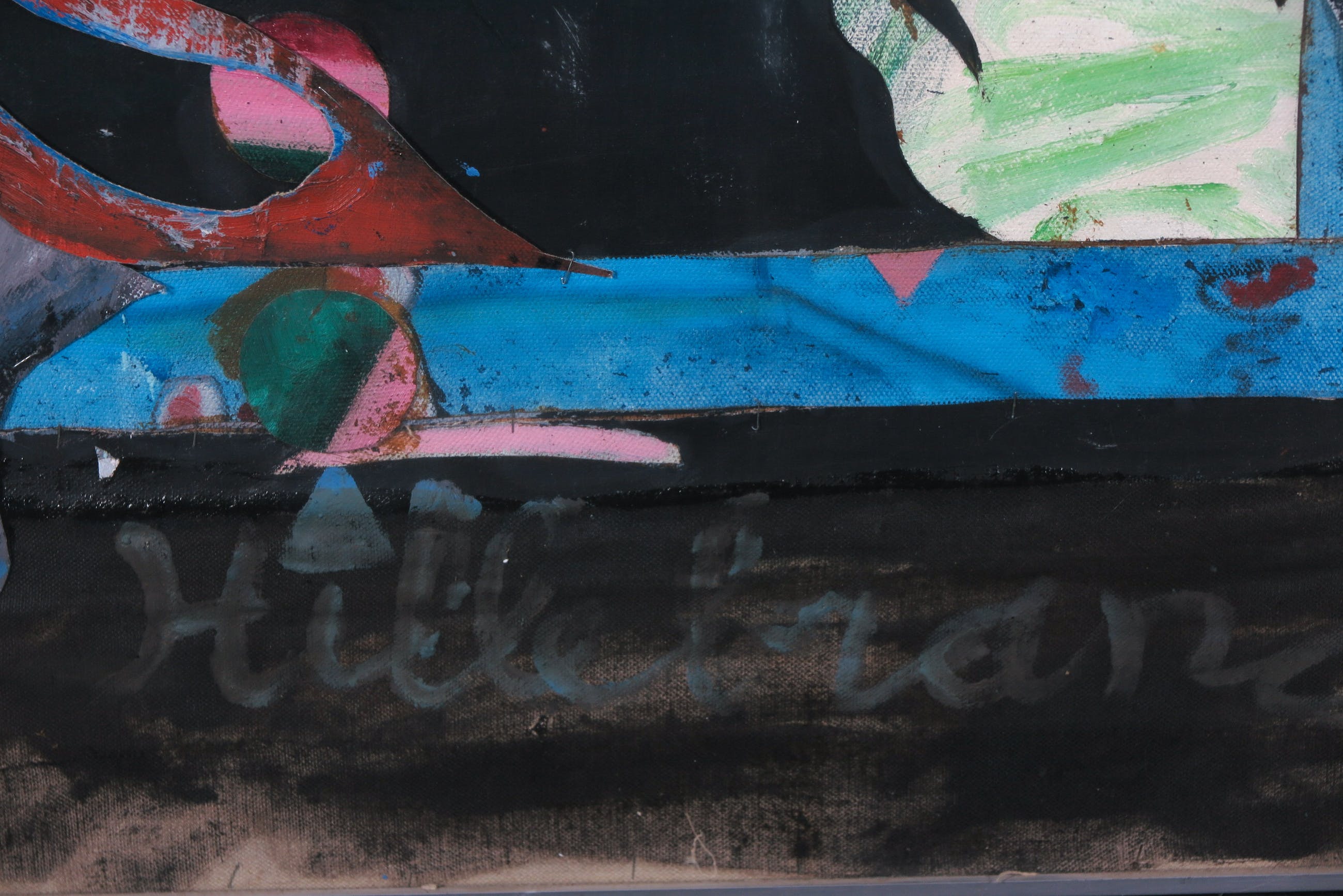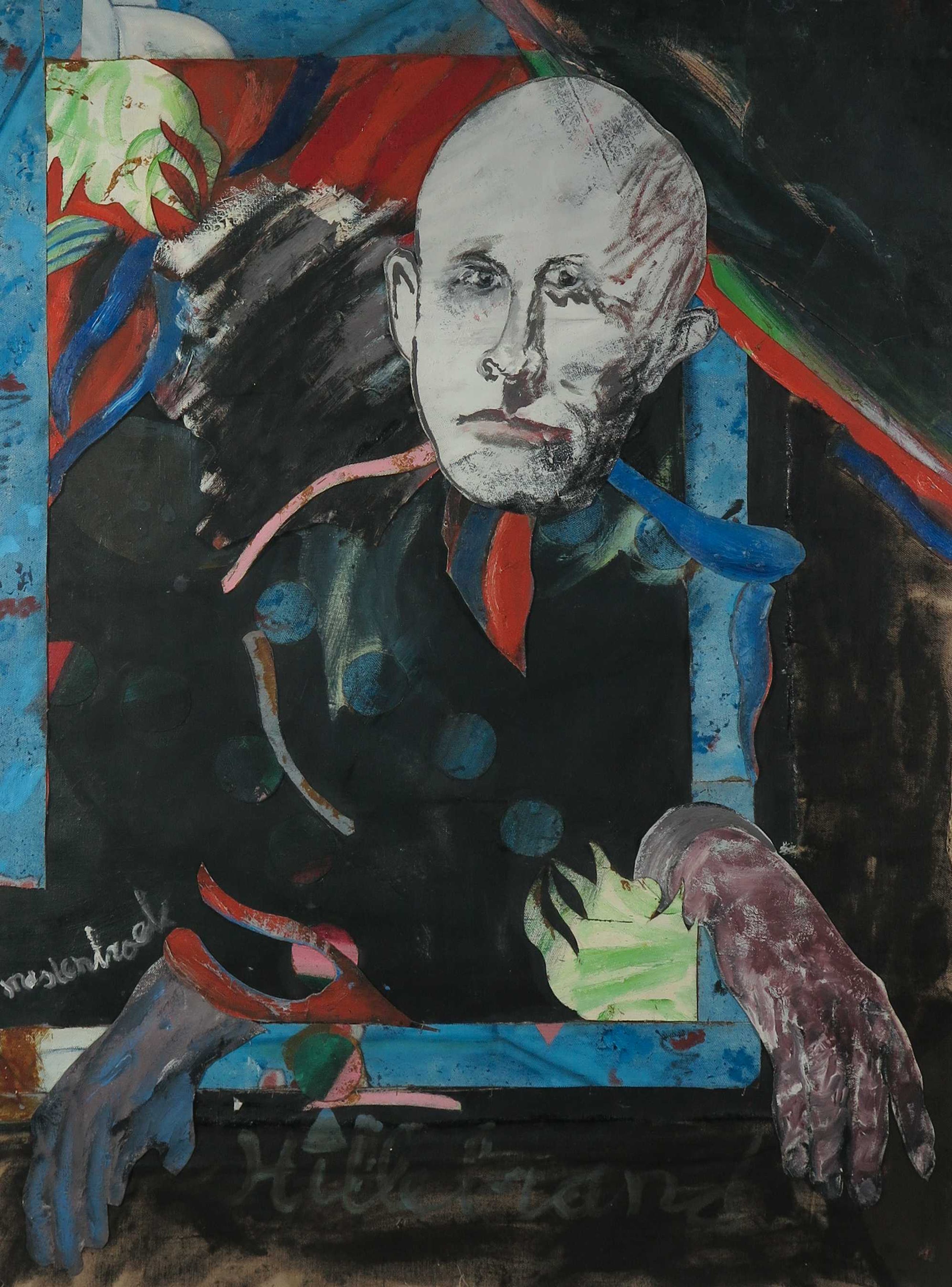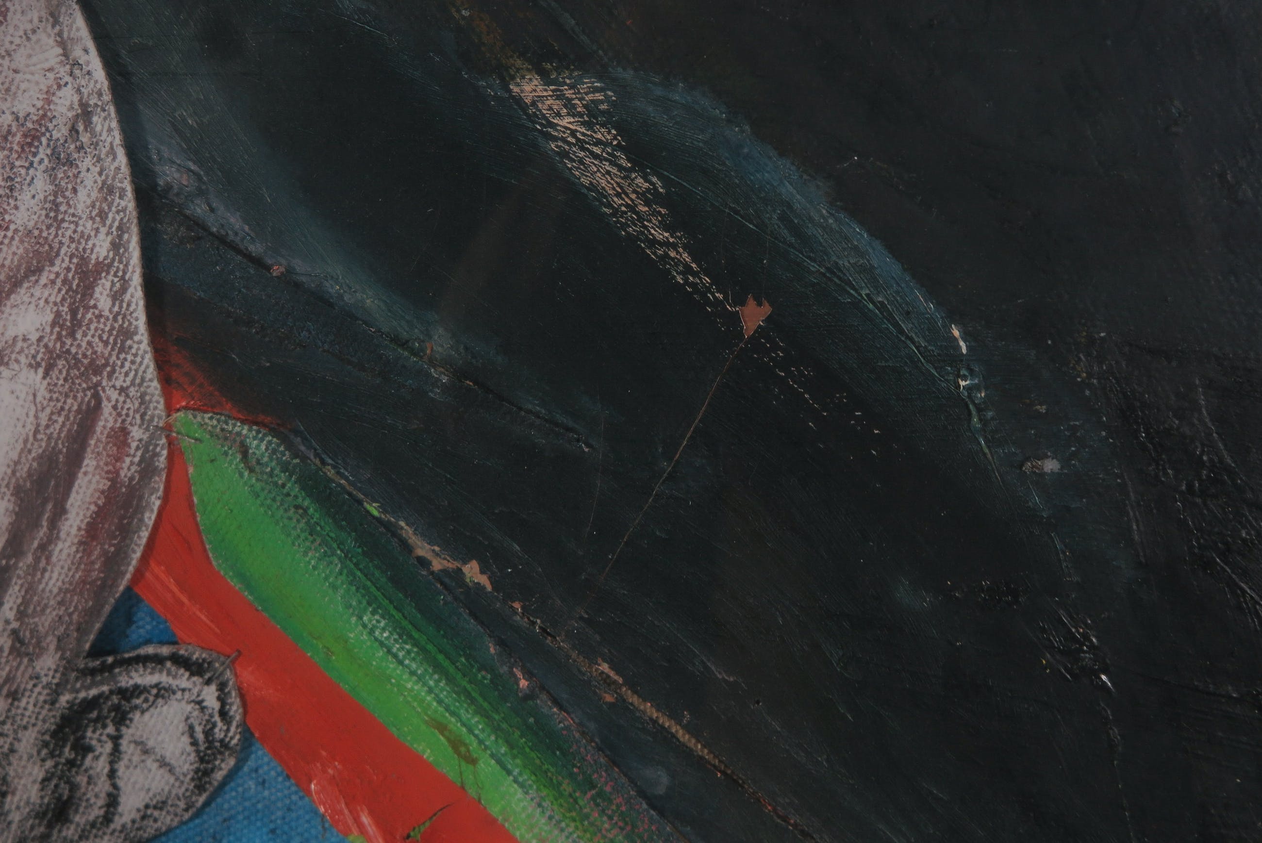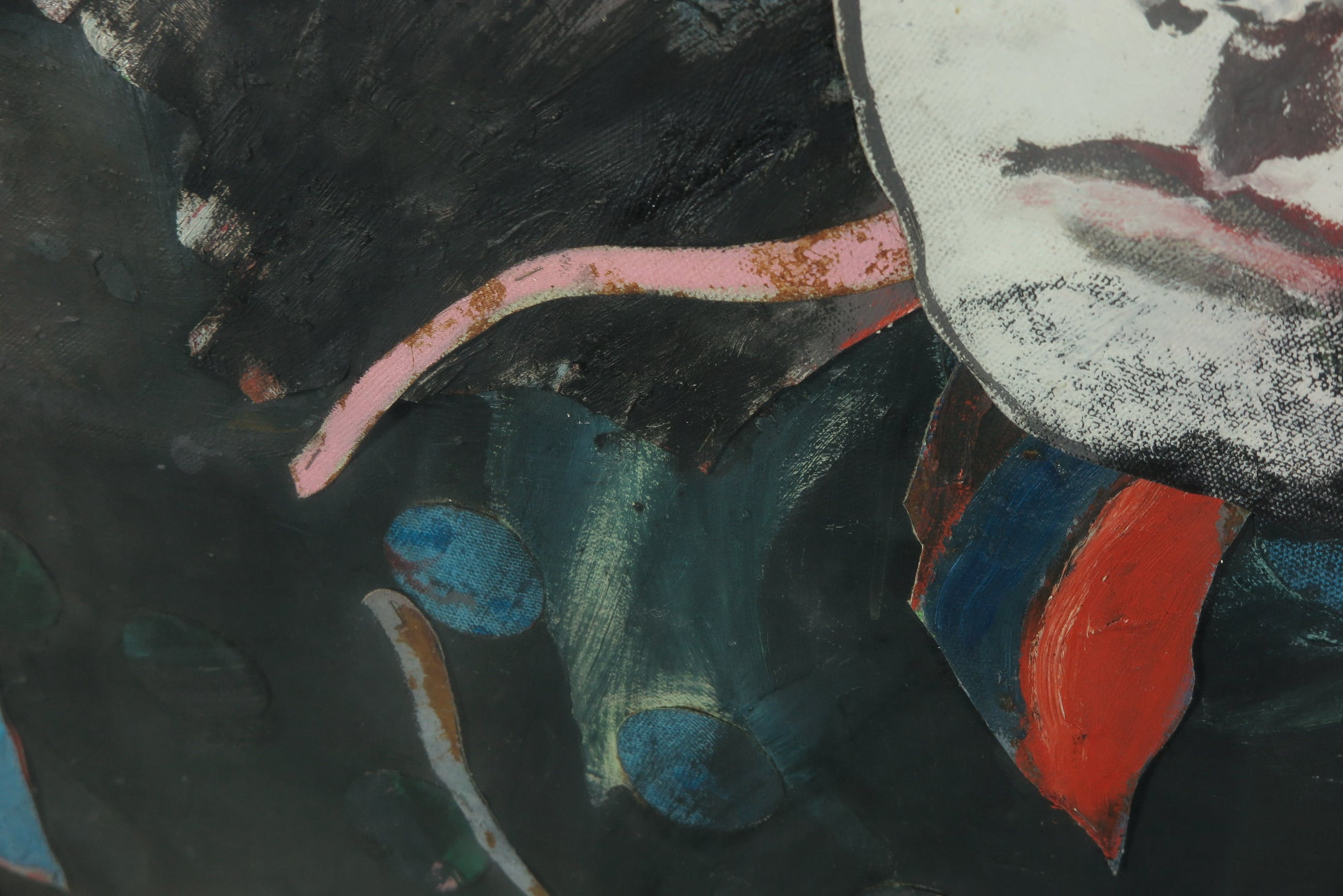 De collage, bestaande uit stukken canvas, is door middel van nietjes aan elkaar gezet. Het werk is wat vuil/stoffig en op een enkele plek wat verfverlies. | |