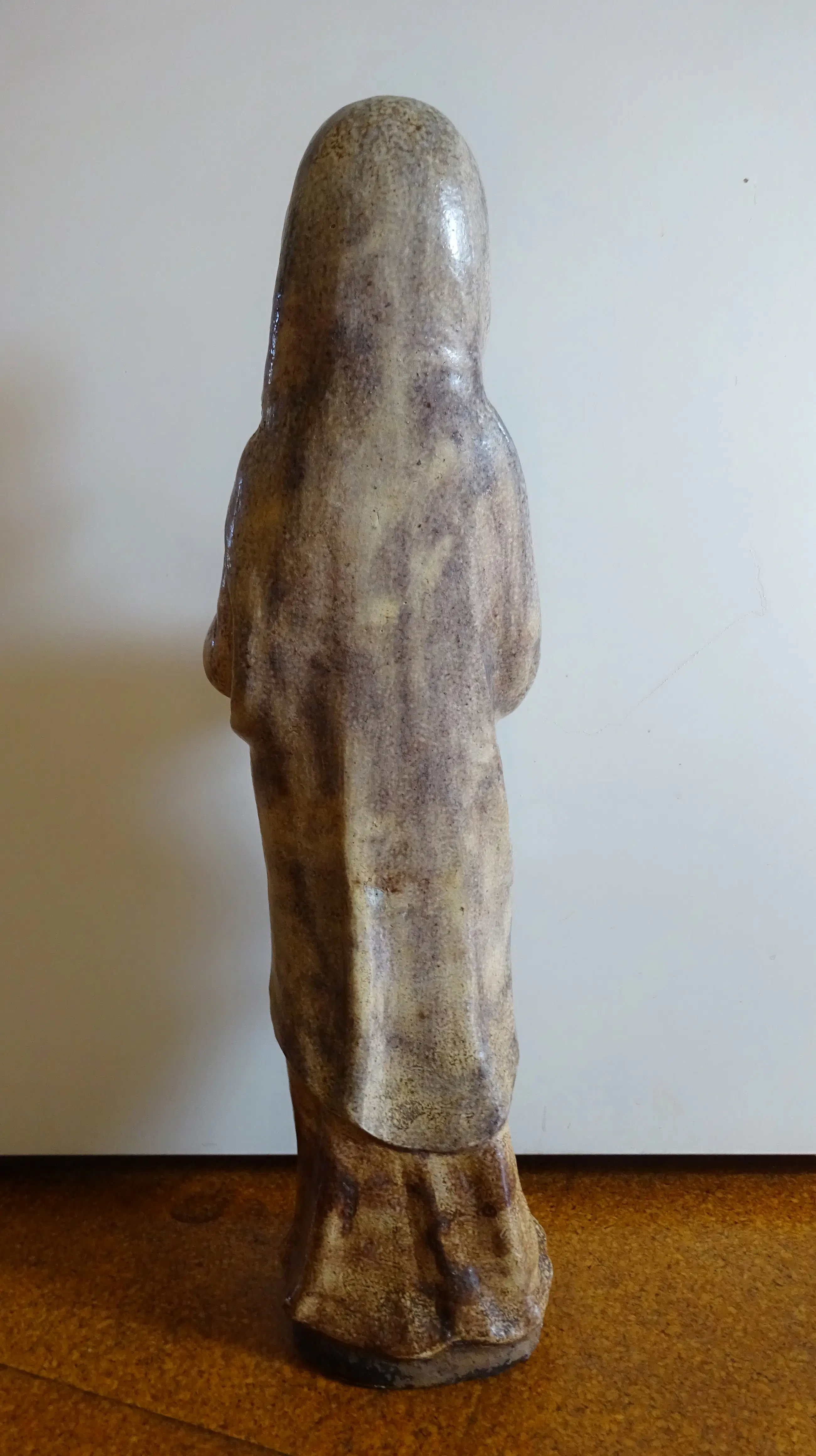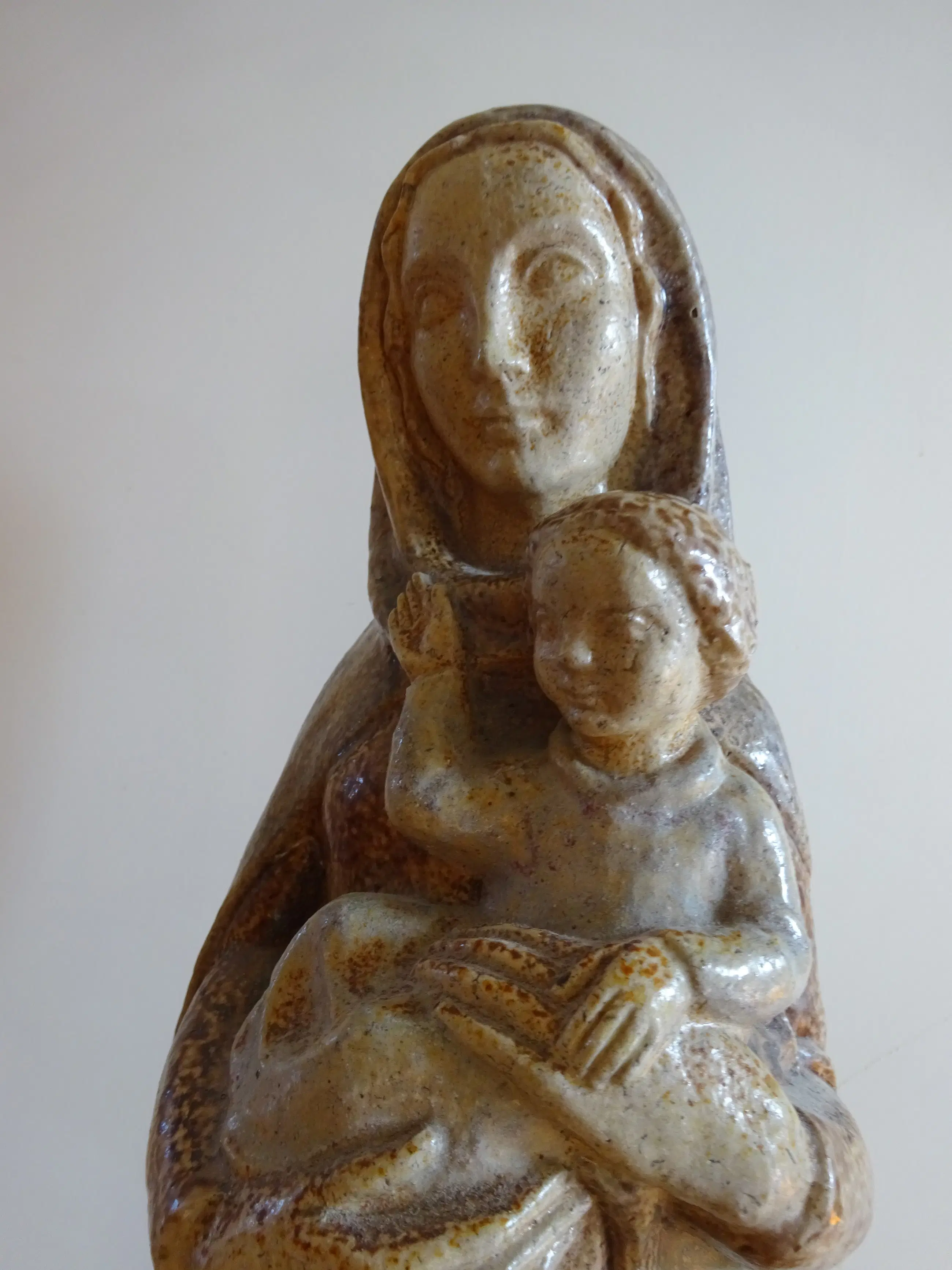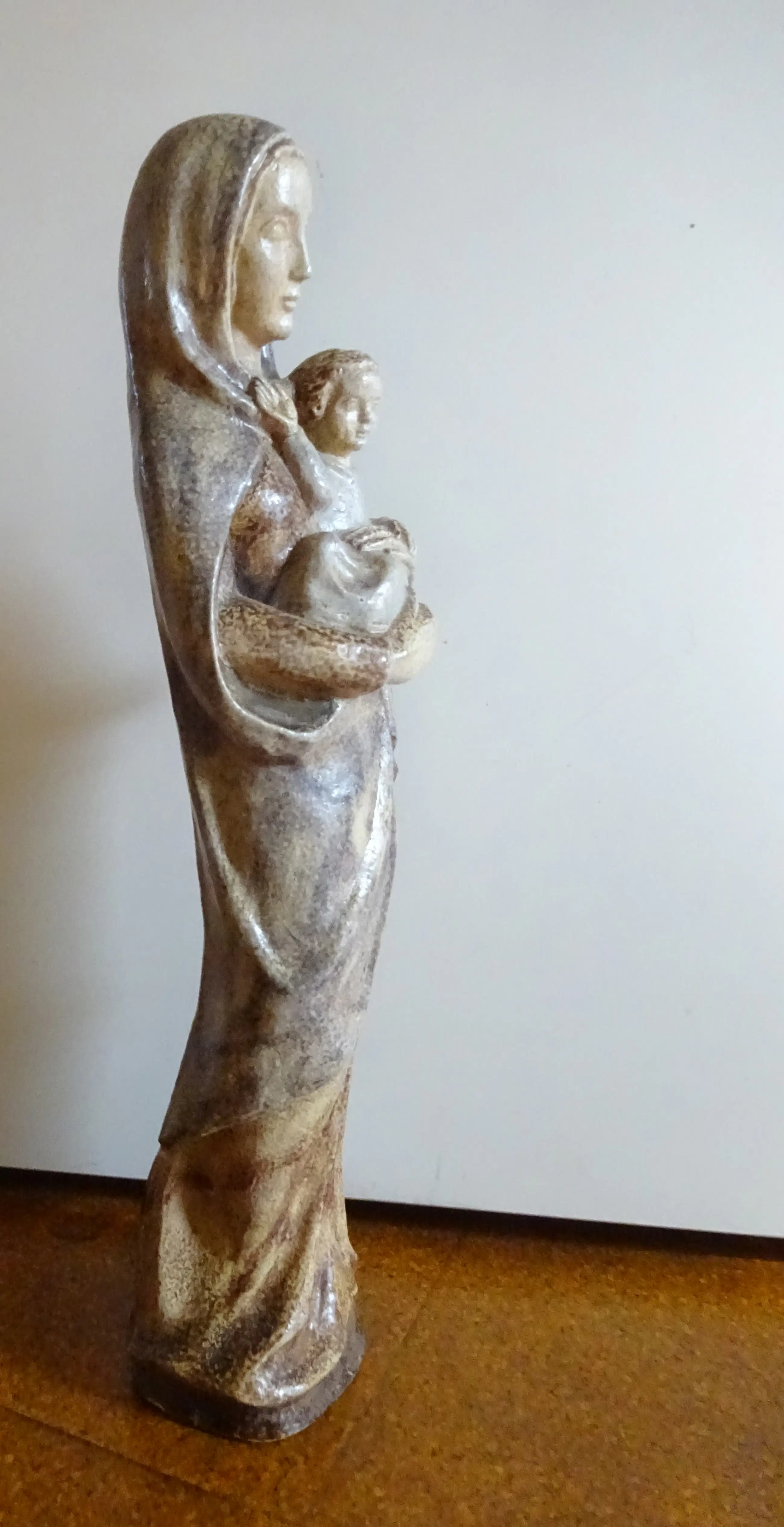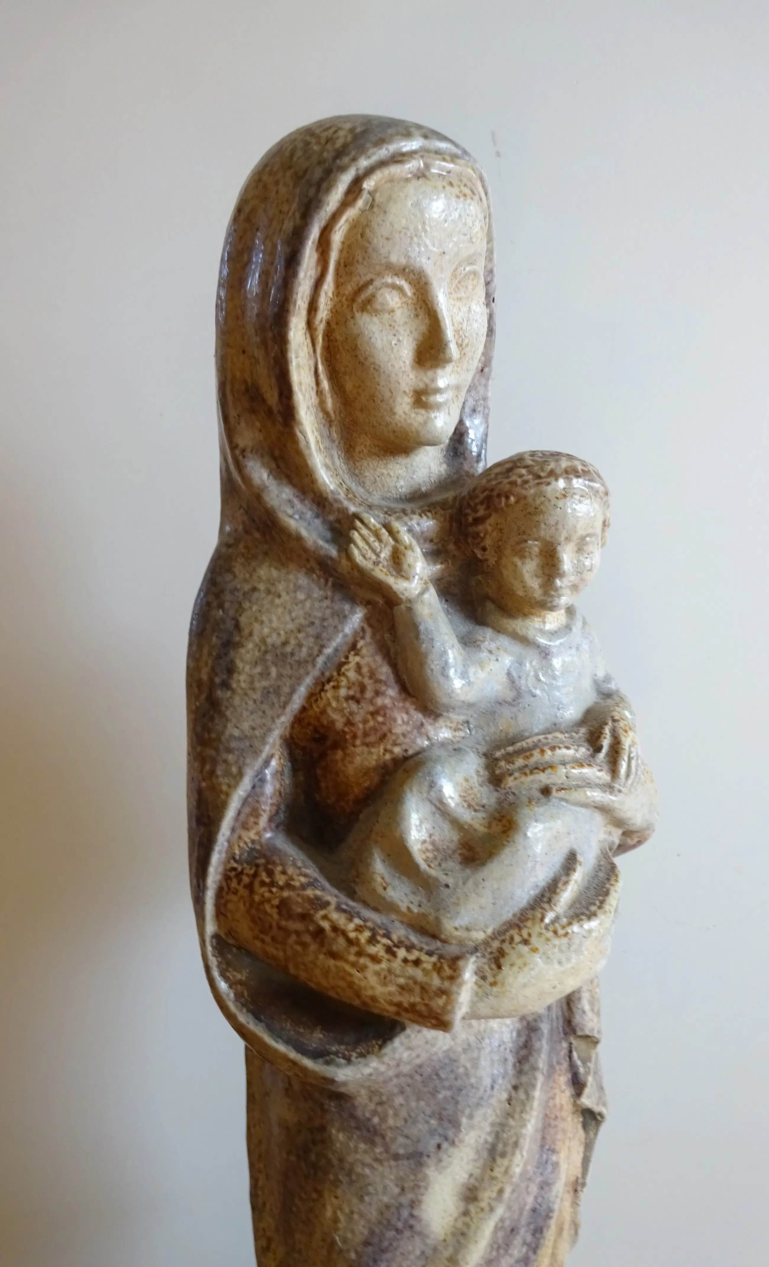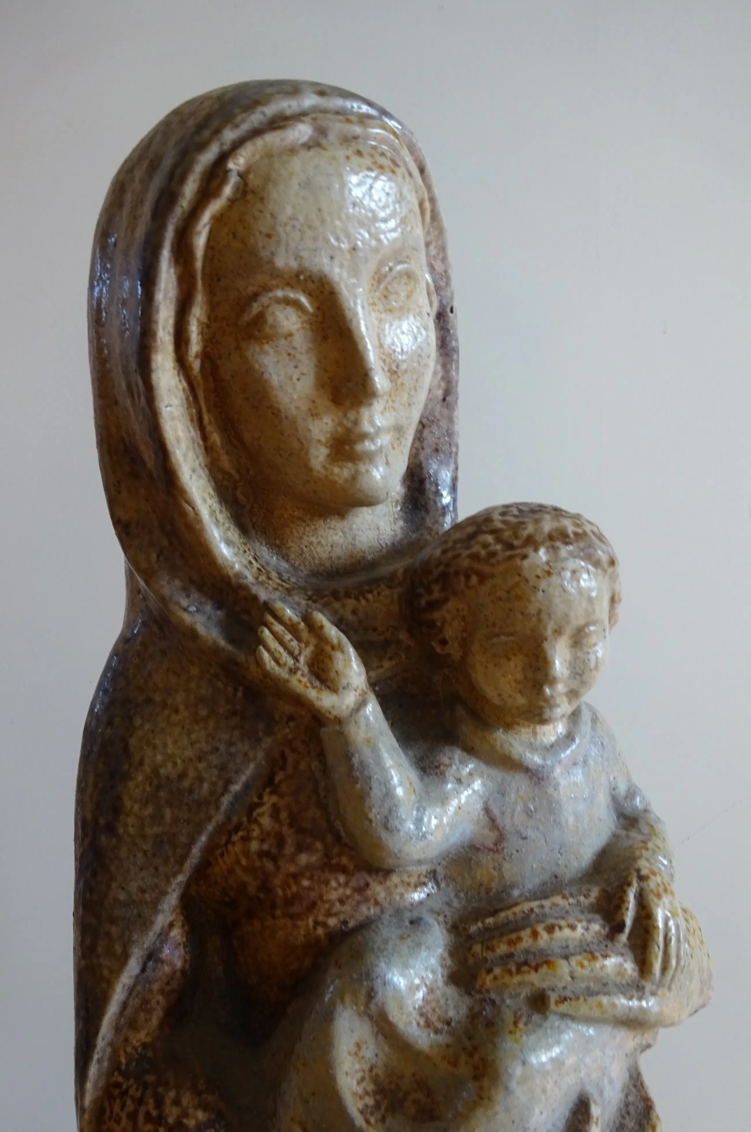 Beeld van Maria met kind Signatuur: Albert Meertens 1904-1971 beeldhouwer Gemerkt: Terraco, Beesel Draak, St Joris Materiaal: steengoed met zoutkristallen glazuur Hoog: 54 cm Breed: ca 14 cm Diep: ca 11 cm Jaar: 1948-1950 Conditie: prachtige staat