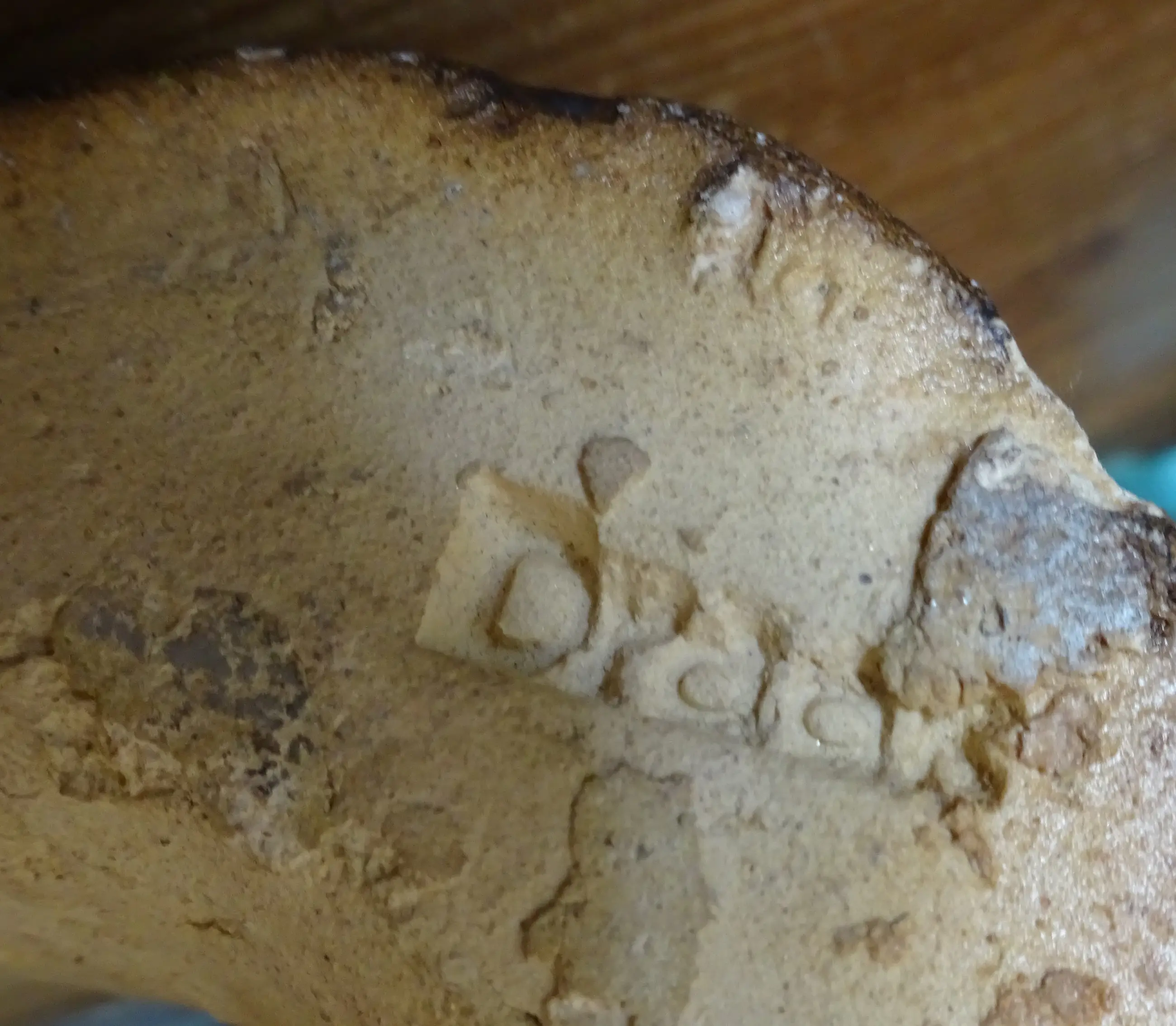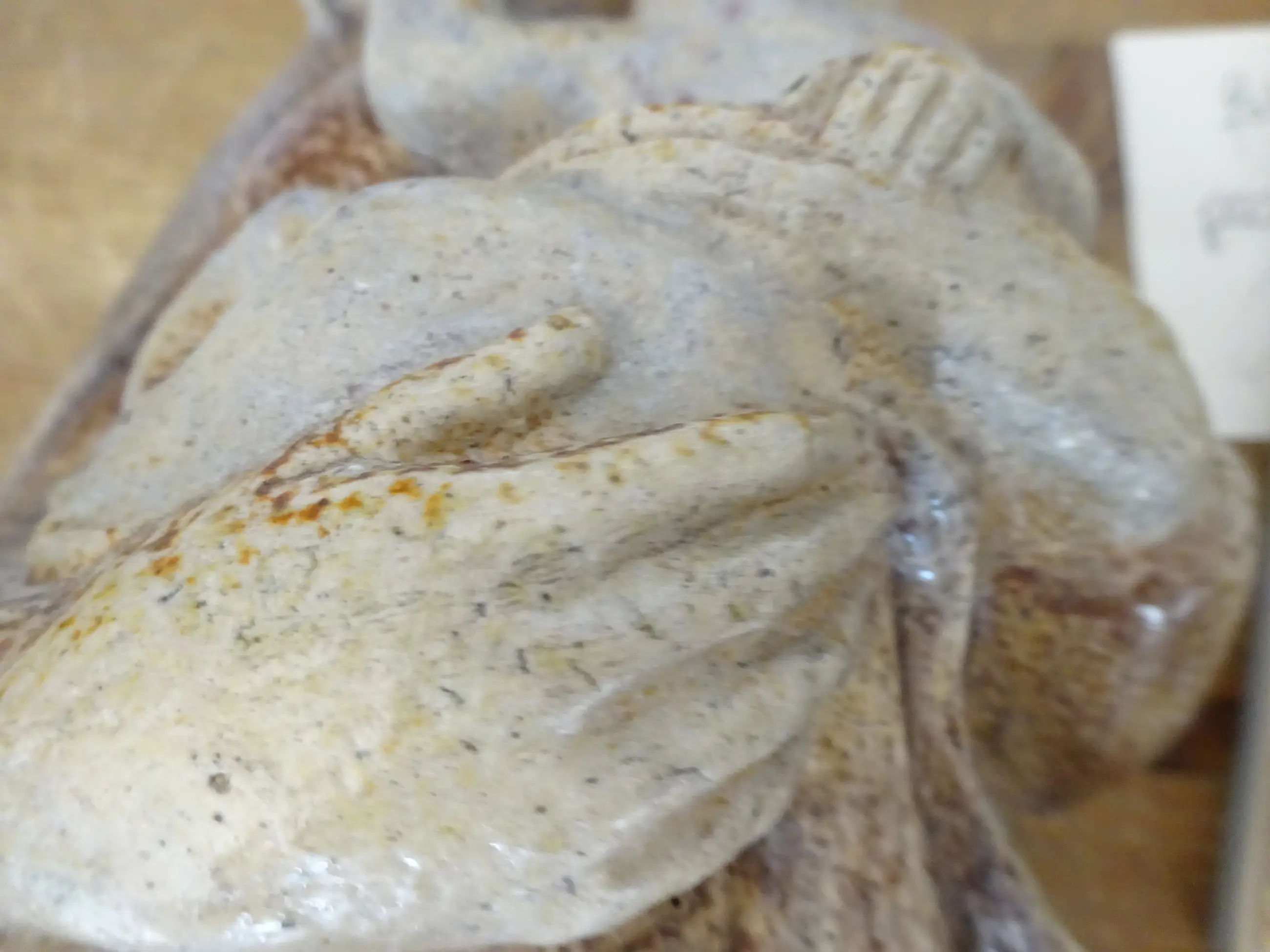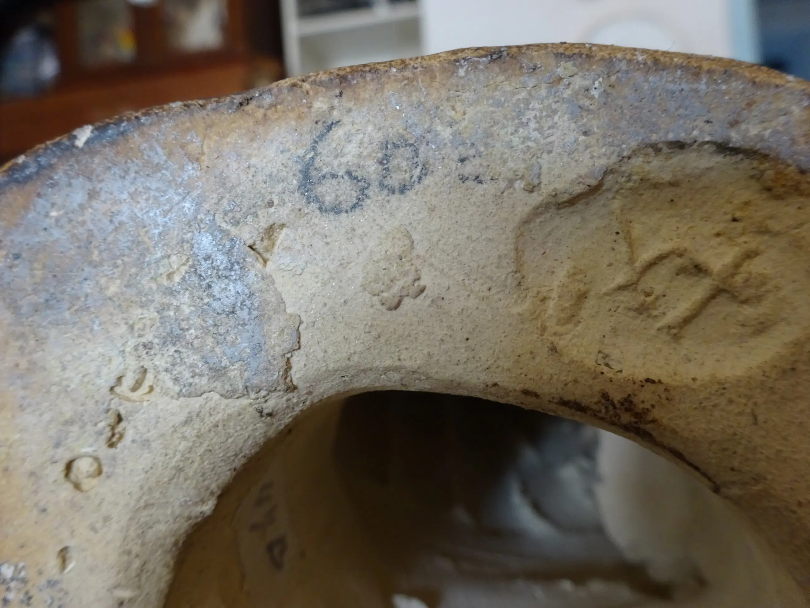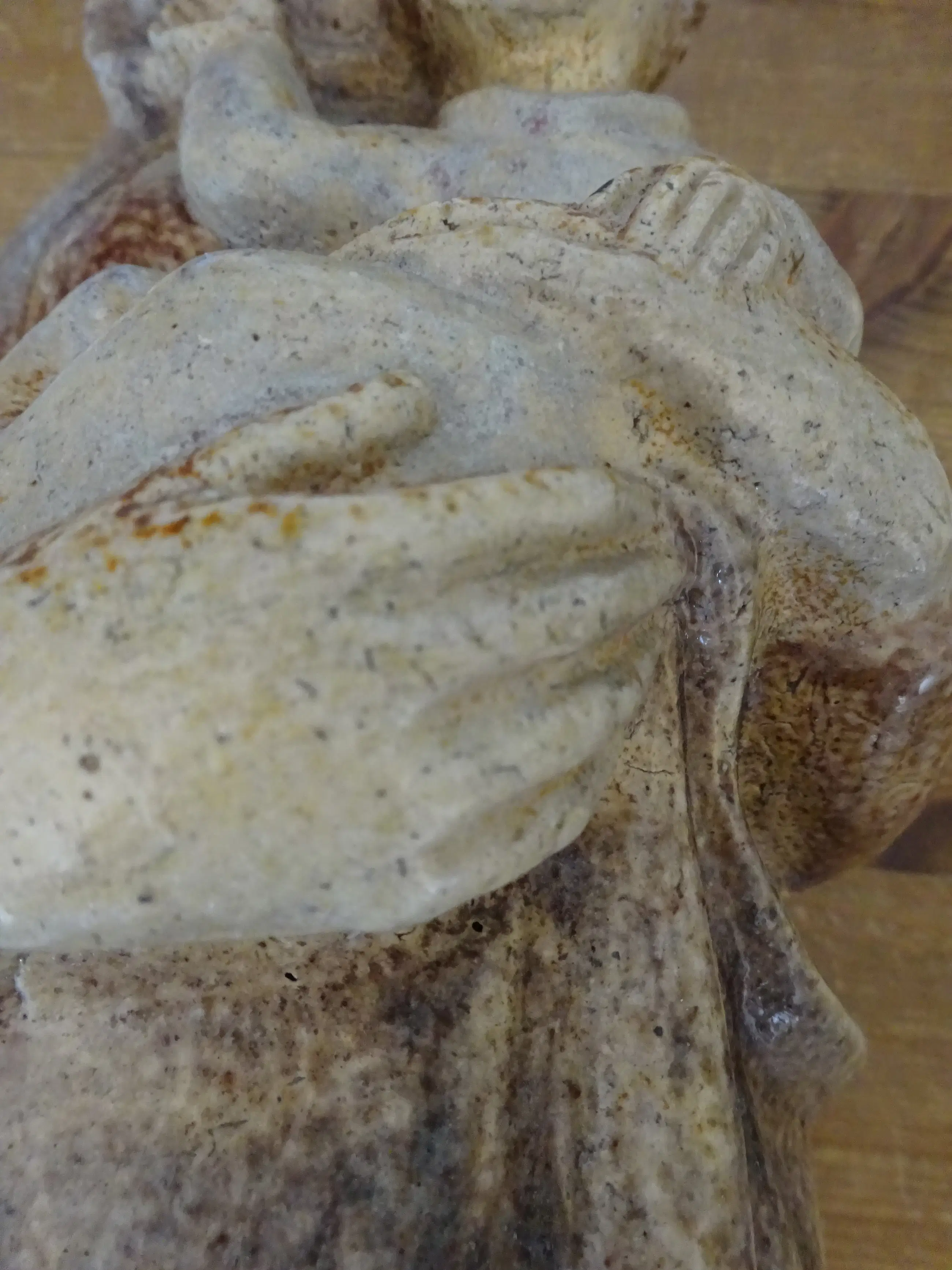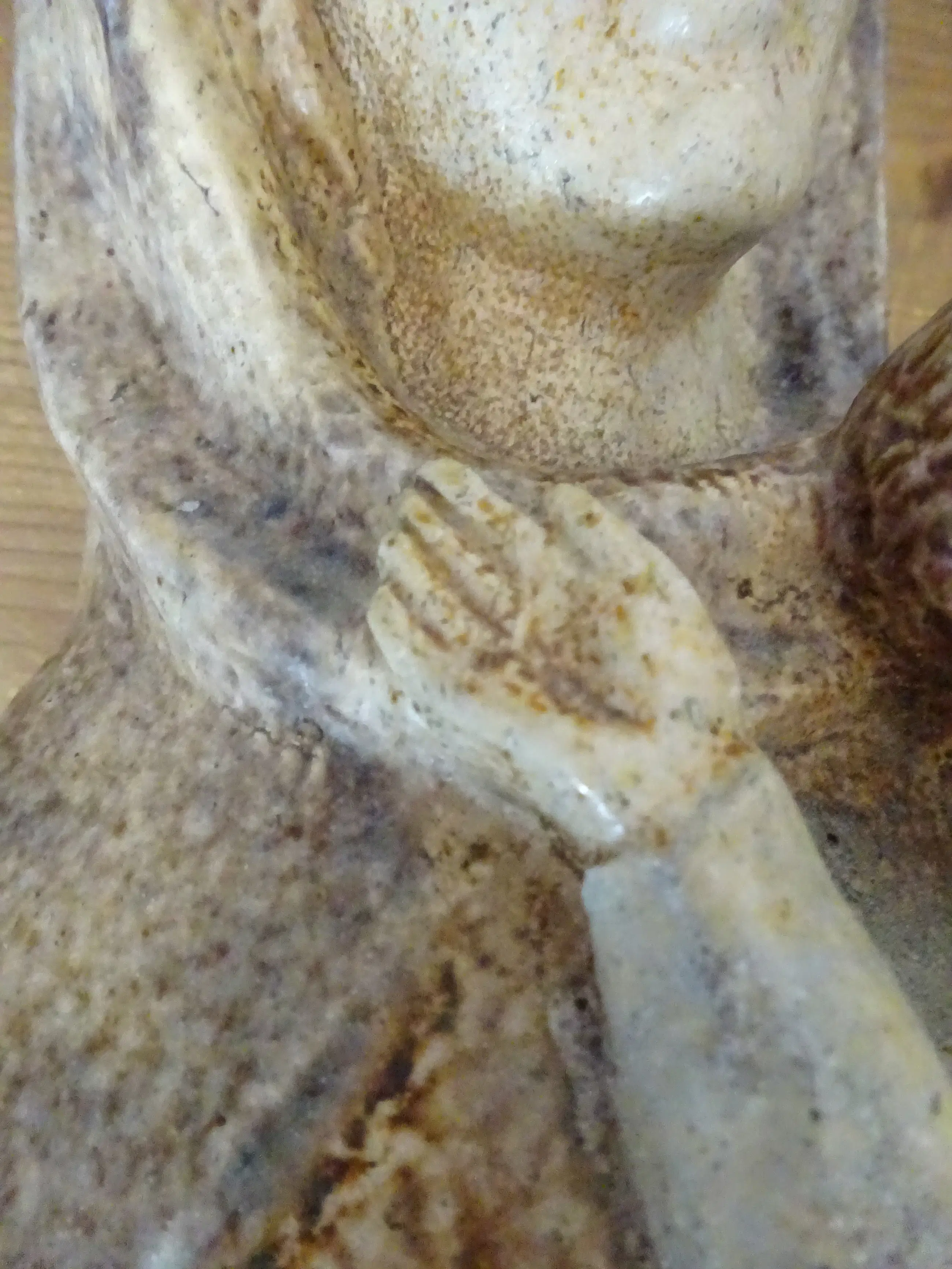 Beeld van Maria met kind Signatuur: Albert Meertens 1904-1971 beeldhouwer Gemerkt: Terraco, Beesel Draak, St Joris Materiaal: steengoed met zoutkristallen glazuur Hoog: 54 cm Breed: ca 14 cm Diep: ca 11 cm Jaar: 1948-1950 Conditie: prachtige staat