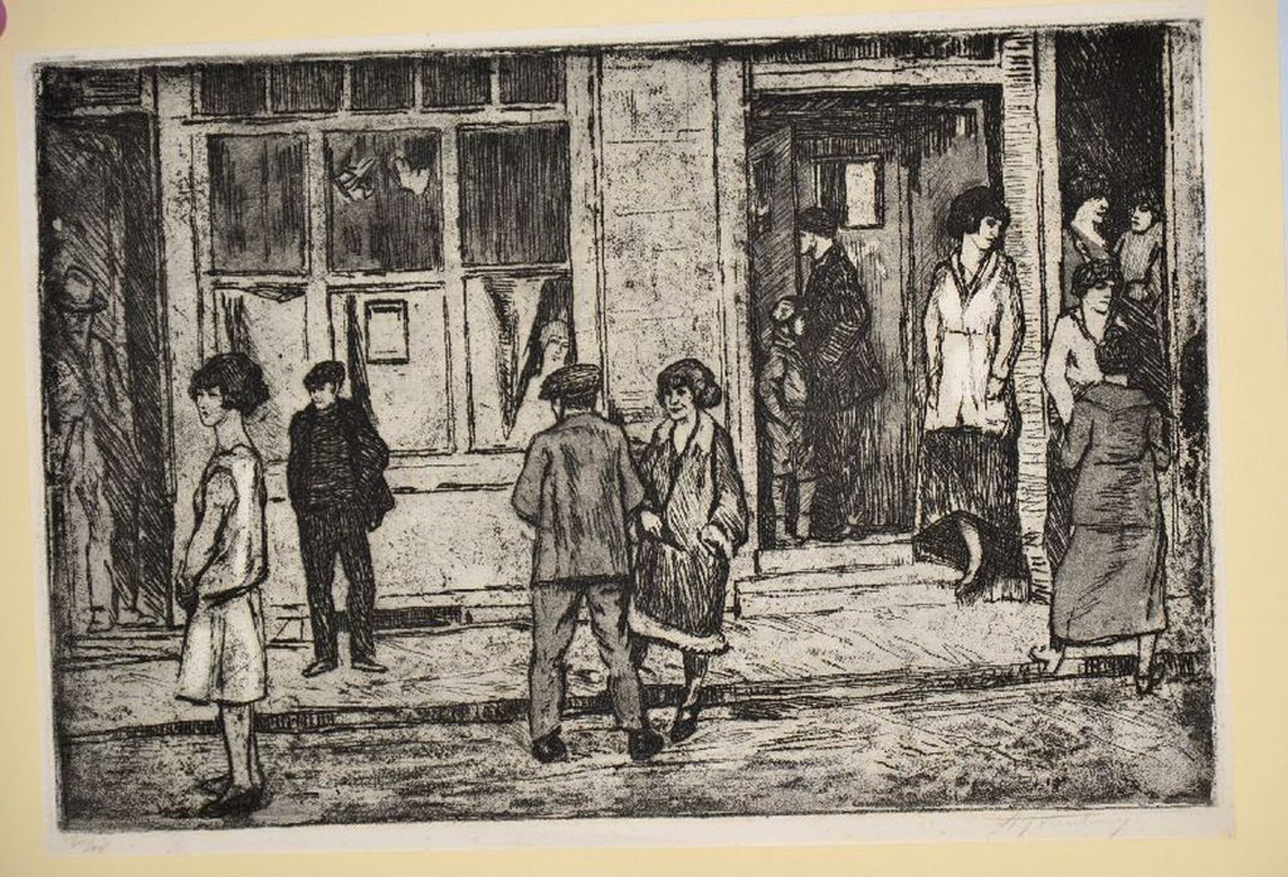 Mooi stadsgezicht (Rossebuurt Rotterdam?) ets / droge naald van Albert Neuhuys. Groot Formaat.
