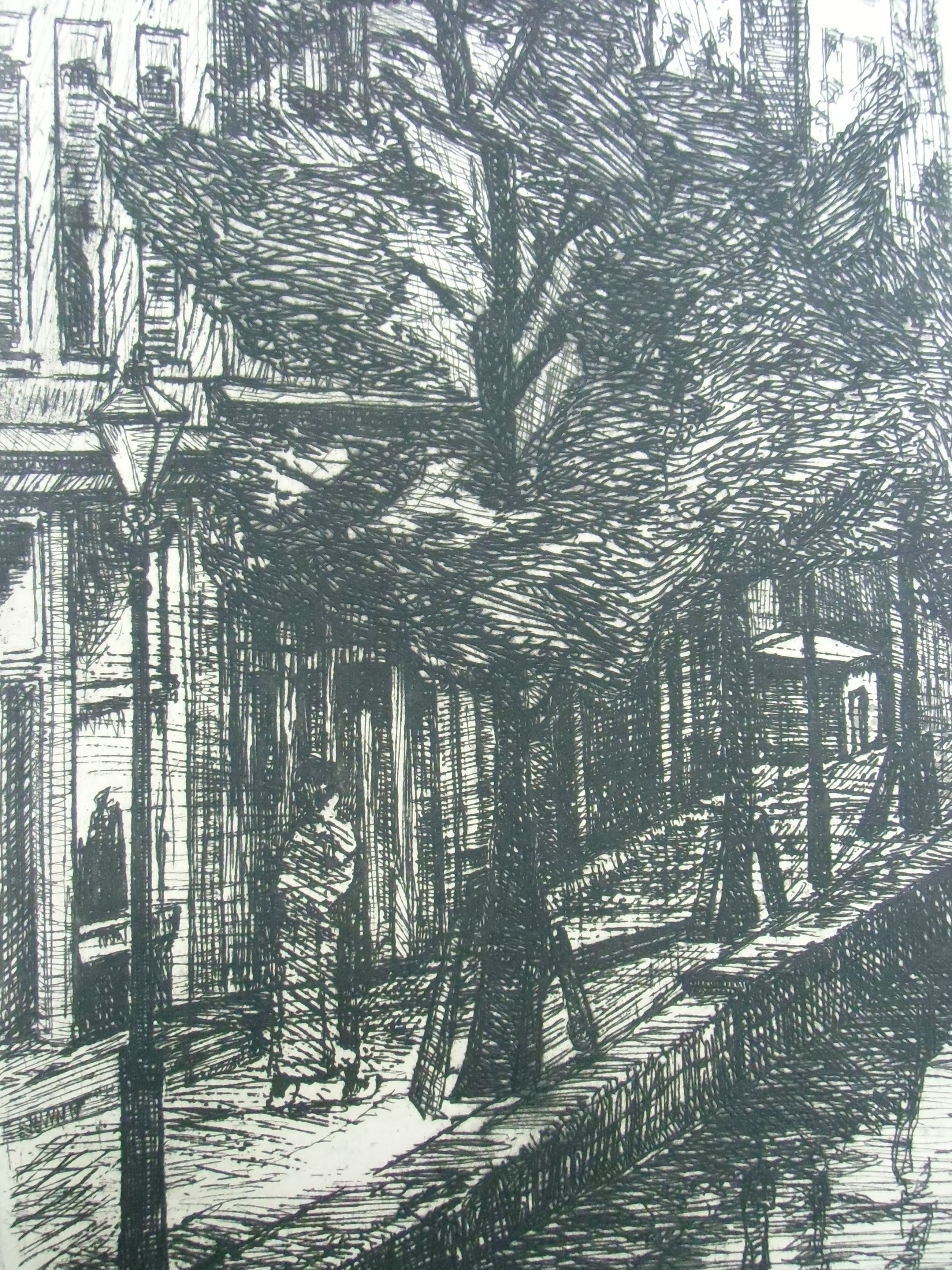 Gedurende de twintiger en dertiger jaren van de vorige eeuw maakte de Rotterdamse graficus Albert Neuhuys zijn bladen met volkstypen, lichte vrouwen en haventaferelen. Deze ets met droge naald dateert uit die periode. Gesigneerd met potlood en reparatie aan de achterzijde van licht papierverlies in de marge r.o. Overigens onberispelijk beeldvlak zowel aan de voor- als de achterzijde. Groot formaat.