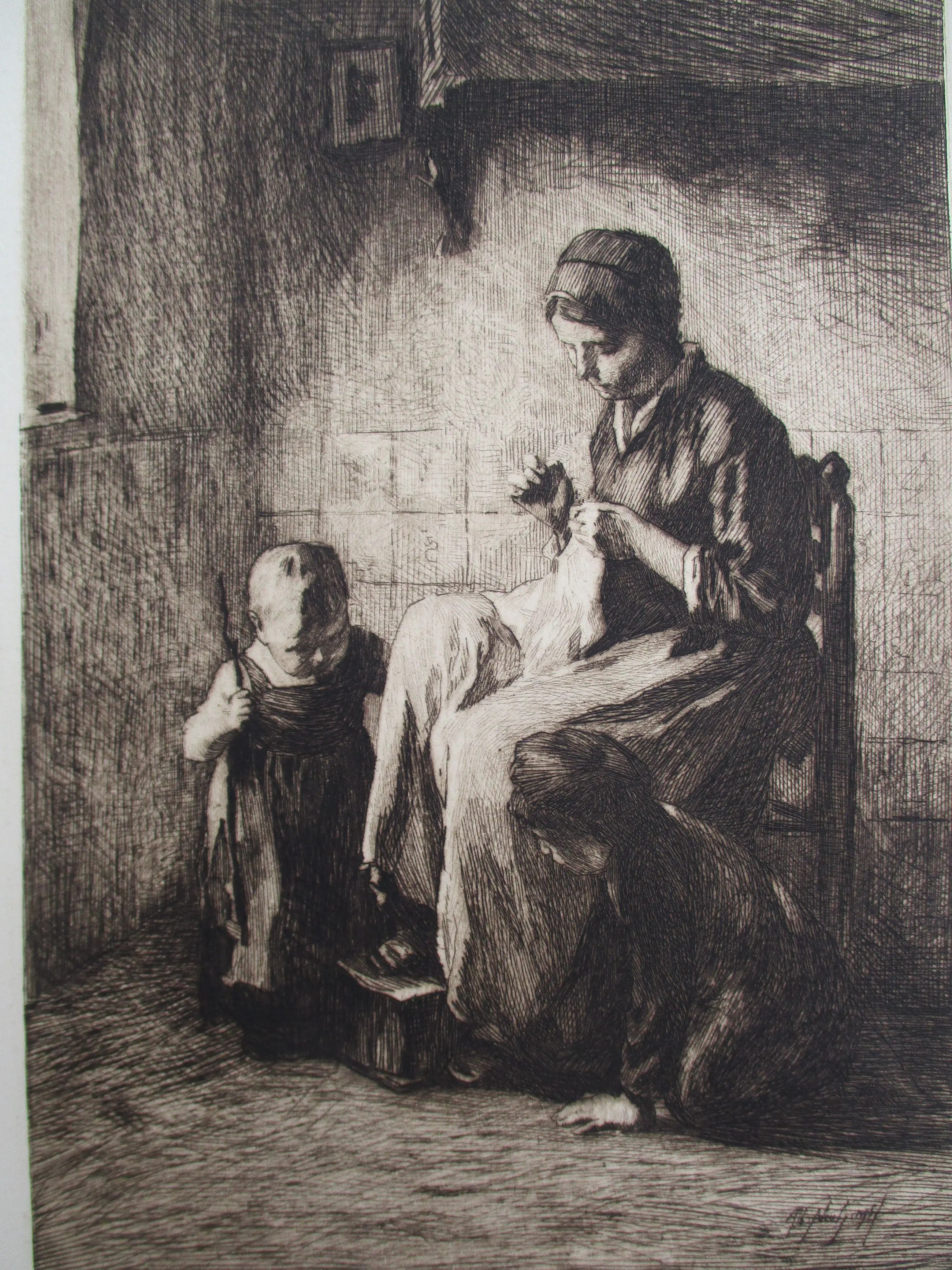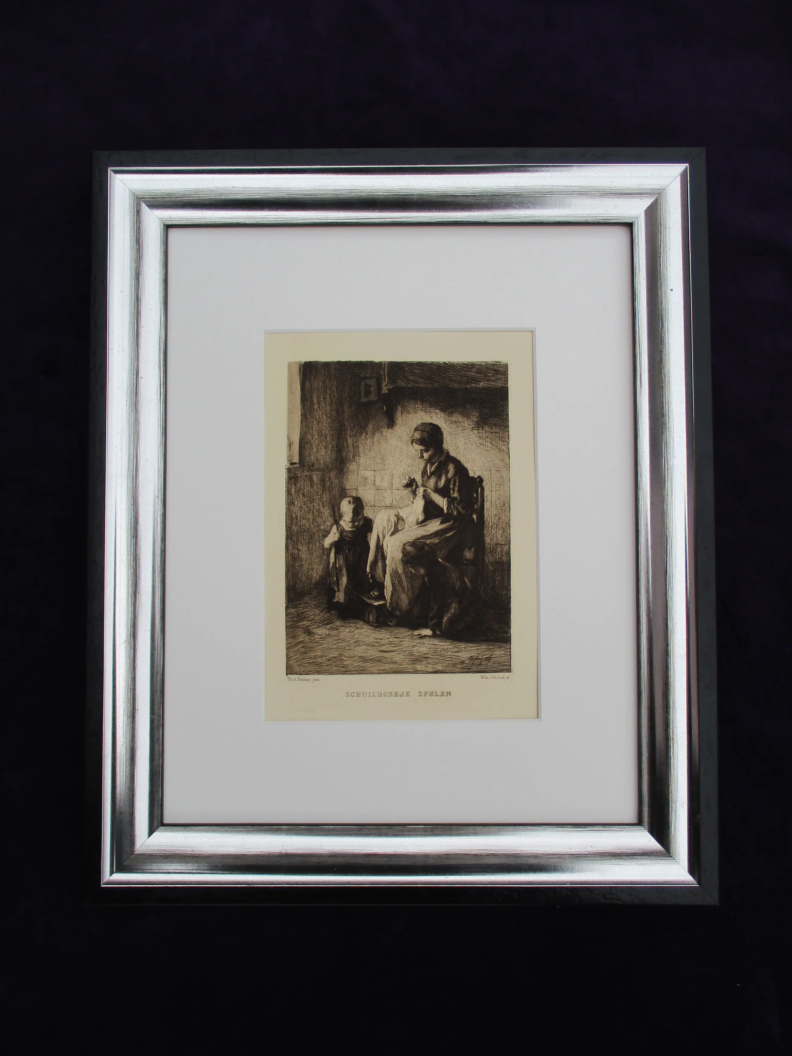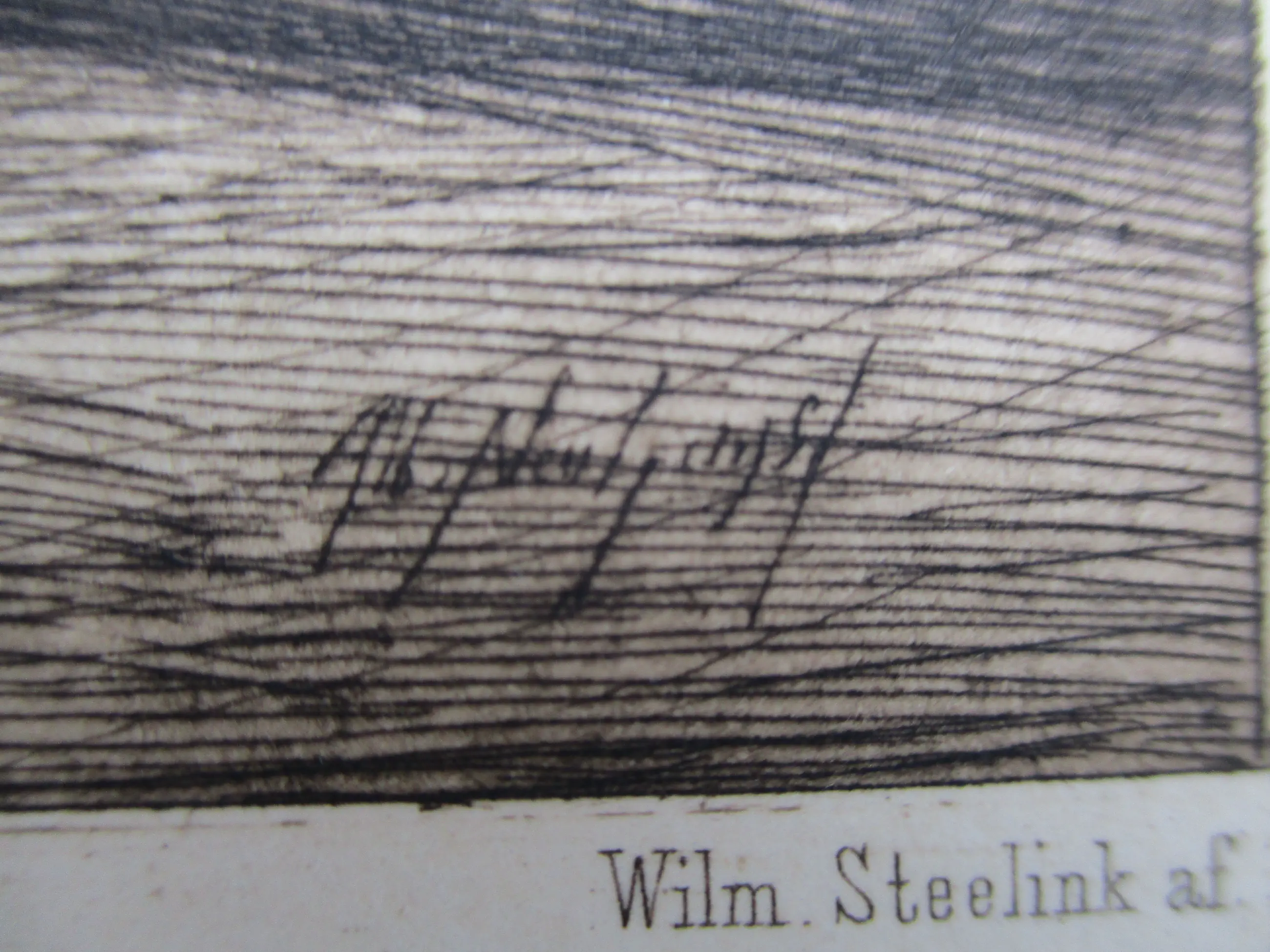 Deze ets naar een schilderij van Willem Steelink is in de plaat gesigneerd. Het werk is ingelijst met passepartout en zit achter glas. De lijst heeft wat lichte gebruikssporen.