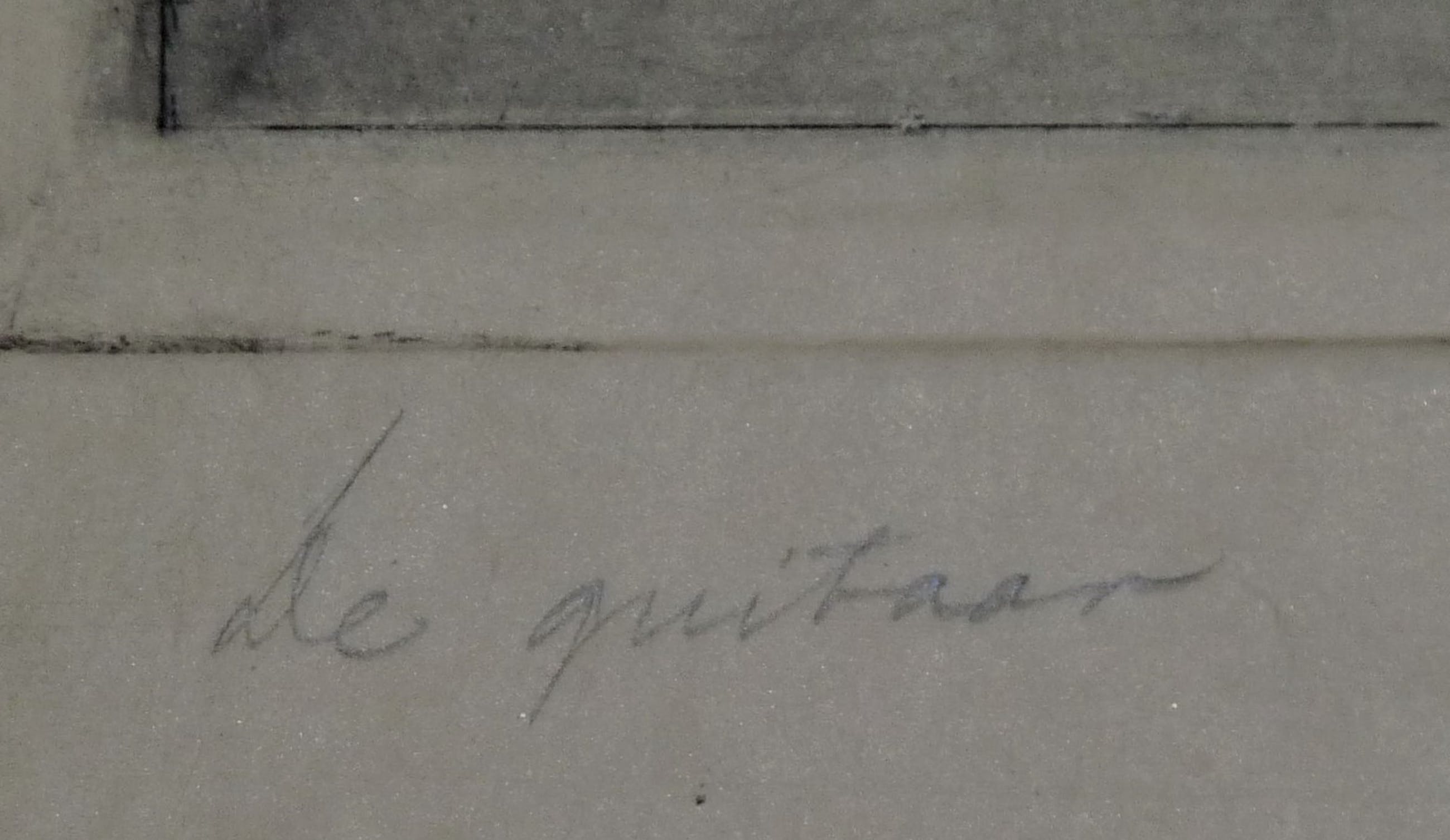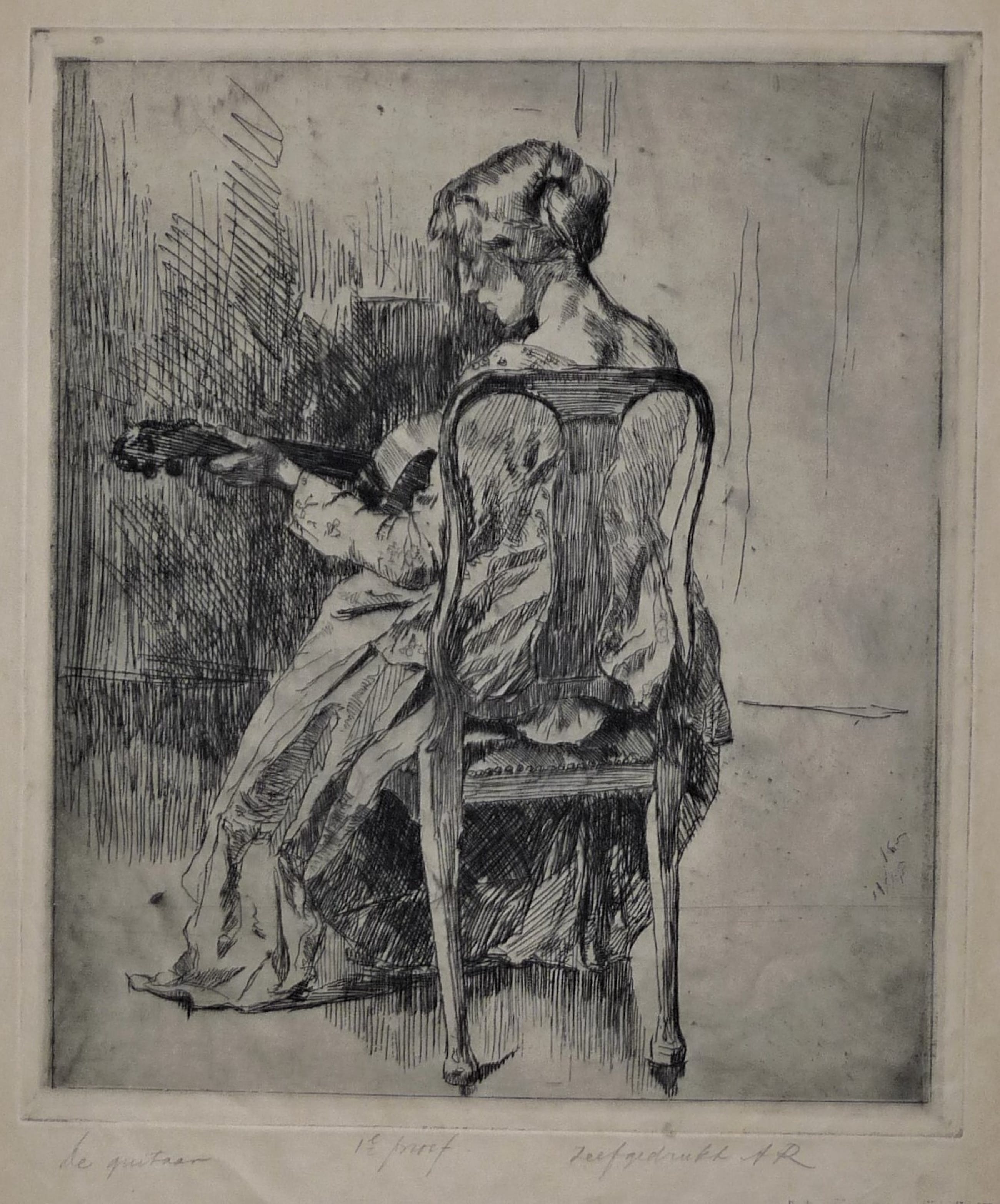* Deze meer zeldzame ets -1e proef, is minder uitgewerkt dan het latere uiteindelijke exemplaar , wat bijv. goed te zien is in de achtergrond rondom de guitaar en onder de stoel. Zie en vergelijk met de andere door mij aangeboden exemplaren van deze prent.
