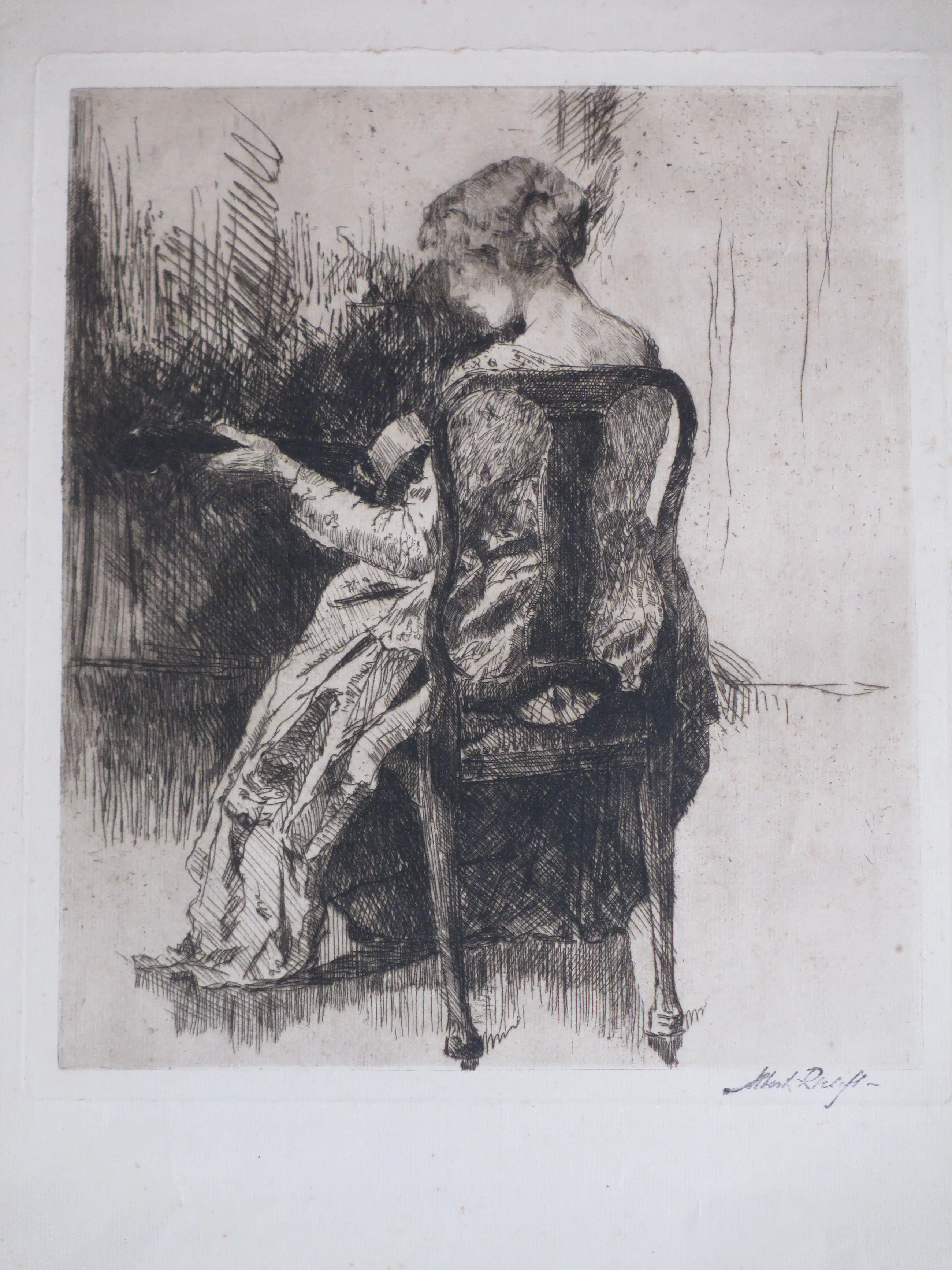 Beroemde ets door Albert Roelofs Voorstelling van een gitaarspelende vrouw op een stoel Losbladig, beeldmaat 33x27, bladmaat 46x36 Gesigneerd met stempelsignatuur r.o.: 'Albert Roelofs' Authenticiteit volledig gegarandeerd