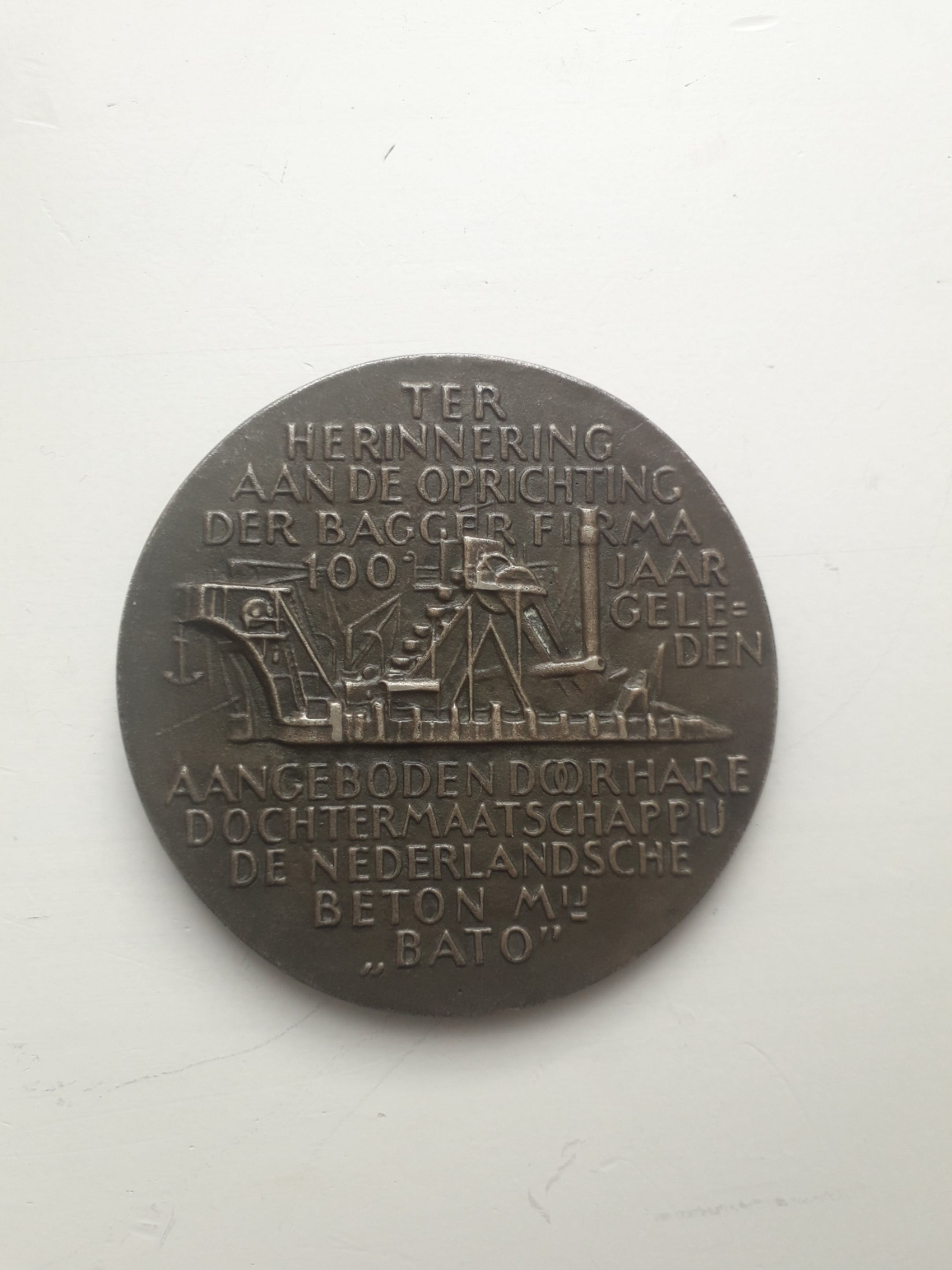 Keerzijde: Tekst in "Ter herinnering aan de oprichting der bagger firma 100 jaar geleden. Aangeboden door hare dochtermaatschappij de Nederlandsche beton Mij ,,BATO". Tekst is om het reliëf van het baggerschip geplaats.