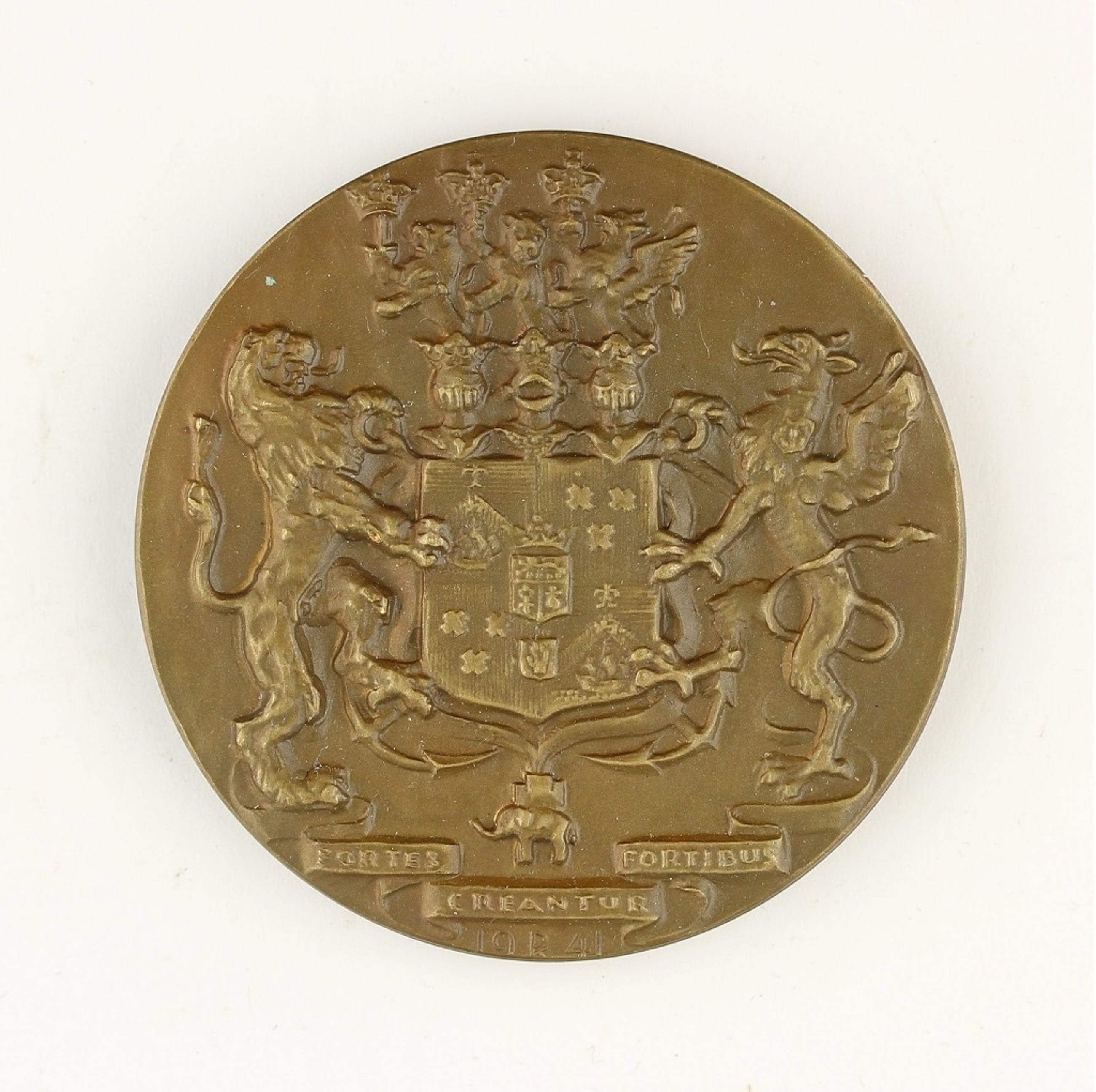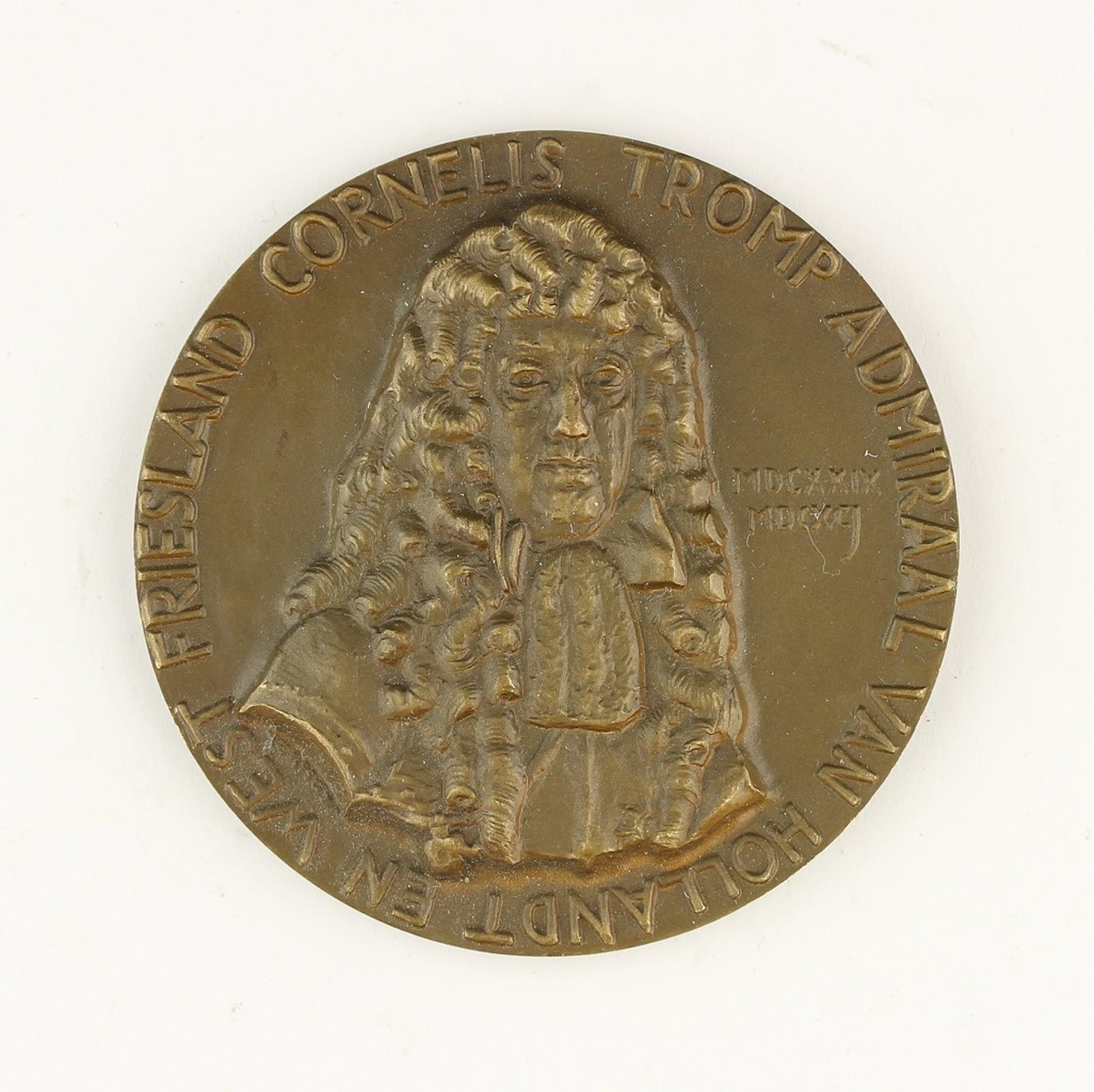 Het is voor ons lastig voor te stellen dat in deze dracht een oorlogsvloot bestierd werd: Cornelis Tromp (1629-1691), zoon van Maarten Harpertsz. Tromp, met een pijpgekrulde pruik tot ver over zijn schouders, halsstrik en kanten bef, harnas en eretekens bungelend op zijn borst. Een sensitief gemodelleerd portret van de zeeheld van de hand van Termote naar de gravure van Johan van Munnikhuysen van het schilderij van David van der Plaes in het Rijksmuseum. Een prachtige, dun geslagen, sterk decoratieve penning waar het borststuk flink uit het fond naar voren komt, met een ruime, maar niet overheersende aandacht voor het kleine detail. Het fond is licht beweeglijk en de letters zijn zonder schreef. Dit laatste maakt dat deze penning niet inwisselbaar is voor een zeventiende-eeuwse penning. De keerzijde had, zo lijkt het even, van Wenckebach kunnen zijn, maar hij is meer geboetseerd en heeft niet die brede vlakken. Een leeuw en een griffioen torsen een ingewikkeld wapenschild waaronder de wapenspreuk van Tromp te lezen is: 'Tortes creantur fortibus'. De sterken worden uit de sterken geboren. Tromp is dus overtuigd van het belang van zichzelf en zijn familie. In de periode van uitgave was een onderwerp als dit zonder gevaar of bezwaar: het ging tenslotte om een nationale held die al 250 jaar dood was. #Louk Tilanus, Handzame Sculptuur