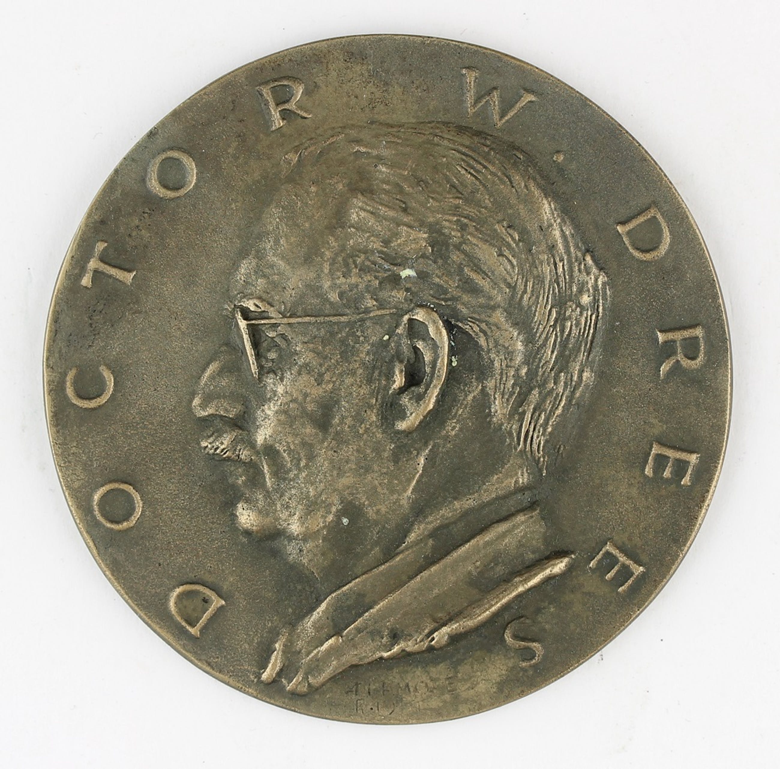 Afgezien van de koningin Wilhelminapenning (1938) is er geen penning die de Vereniging van een tijdgenoot heeft uitgegeven waarvan de naam nu nog een zo aansprekende werking heeft als die van Drees. De bescheiden en taaie SDAP-er, Dr h.c. Willem Drees (1886-1988) was van 1945-1946 lid vann het kabinet Schermerhorn-Drees, van 1946-1948 van het kabinet Beel-Drees, en van 1948-1958 minister-president van een brede-basis kabinet. Van Puijenbroek schrijft dat Von Weiler de niet als artistiek geïnteresseerd bekend staande Drees wist over te halen te poseren. Het pleit voor een beeldhouwer die naam heeft gemaakt met grote ruitermonumenten voor Willibrord, Karel de Grote, Martinus en Corbulo ook in het kleine overtuigend is. Het is een rustig portret van een niet meer jonge man, hij heeft een kleine snor en een dungerande bril; de blik is gericht op de verte. Vooral het voorhoofd is met een kleine verdieping goed plastisch uitgekomen. De belettering is wijd. De keerzijde toont twee regels uit een gedicht van de socialistische dichteres Henriette Roland Holst. Het bestuur had zijne Excellentie uitgenodigd de regels zelf te kiezen. #Louk Tilanus, Handzame Sculptuur