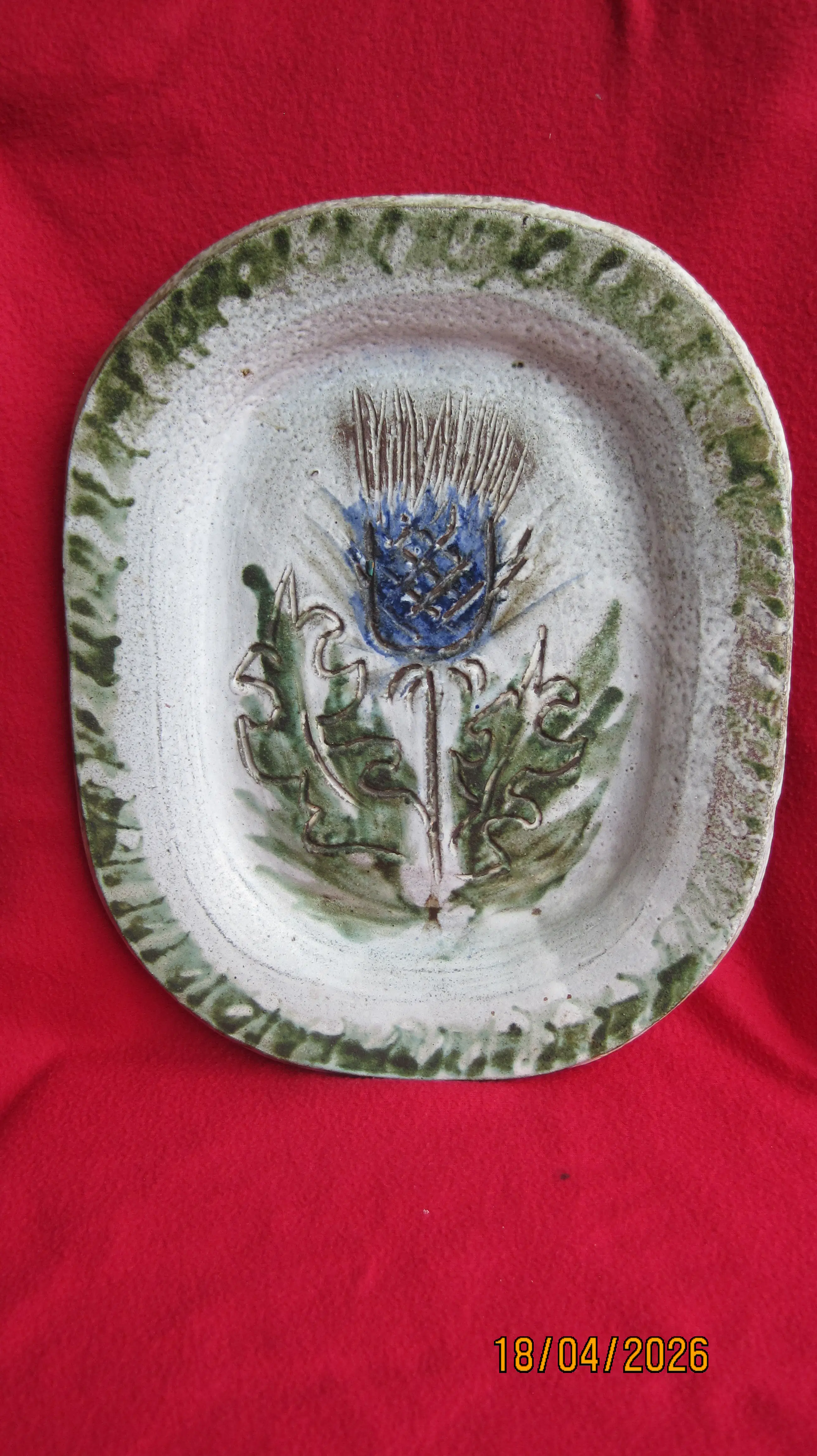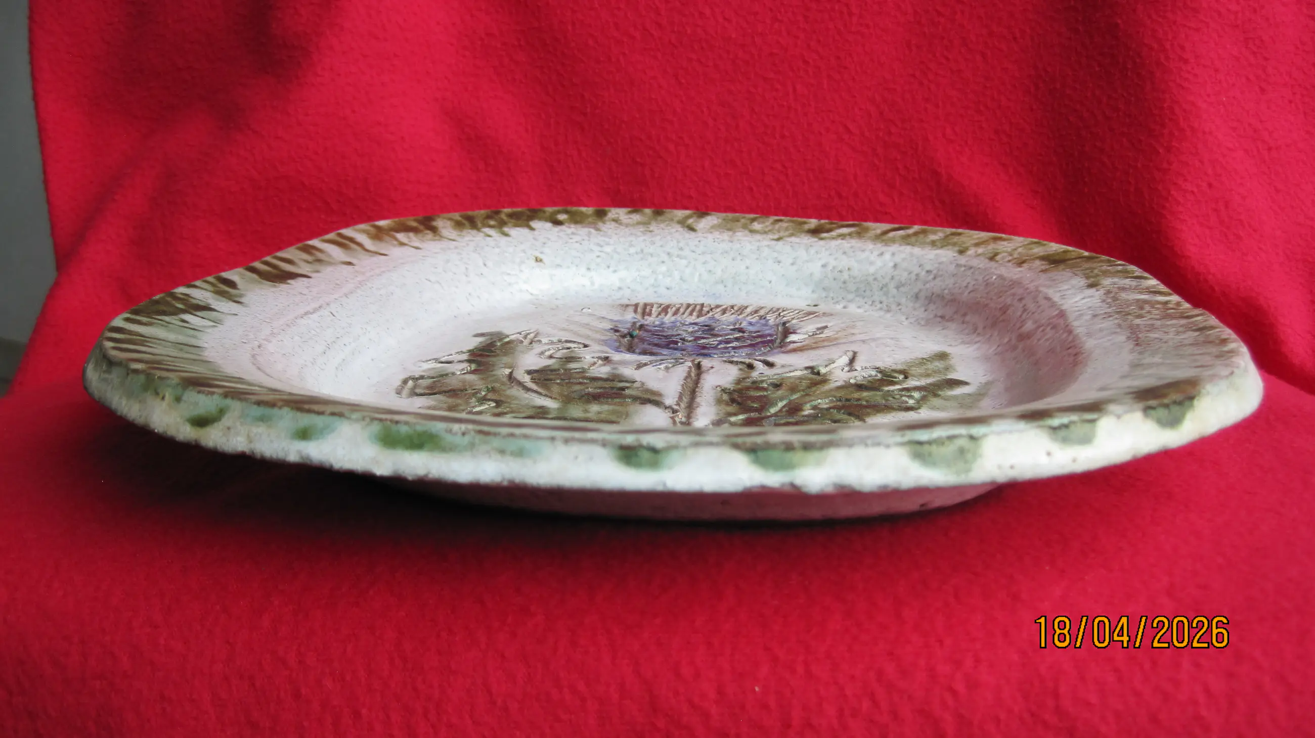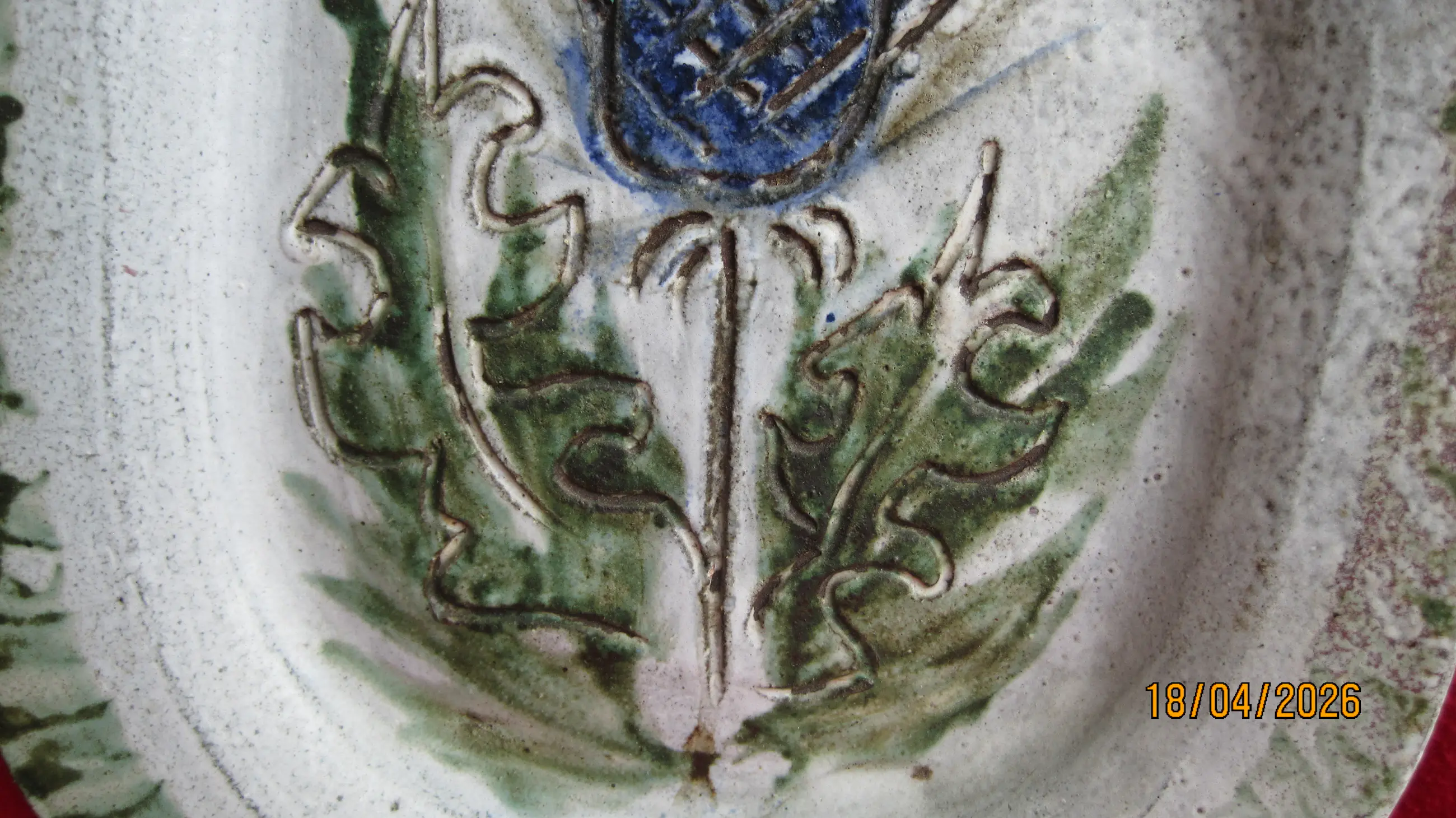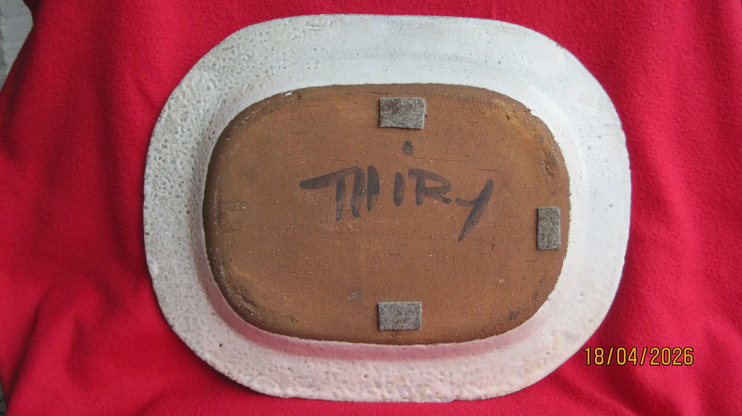 Het distelmotief is typisch voor Thiry's stijl in de jaren '60 en '70. Het combineert zijn voorliefde voor de natuur met de sgraffito-techniek (waarbij het decor in de klei is gekrast). De contrasten tussen de ruwe chamotteklei en de vaak kleurrijke glazuuraccenten maken deze stukken erg decoratief. De schaal verkeert in een zeer goede staat en is op de onderkant gesigneerd.