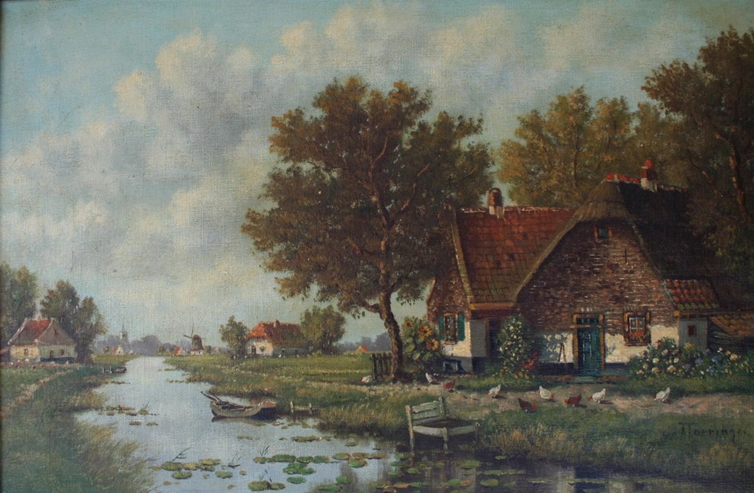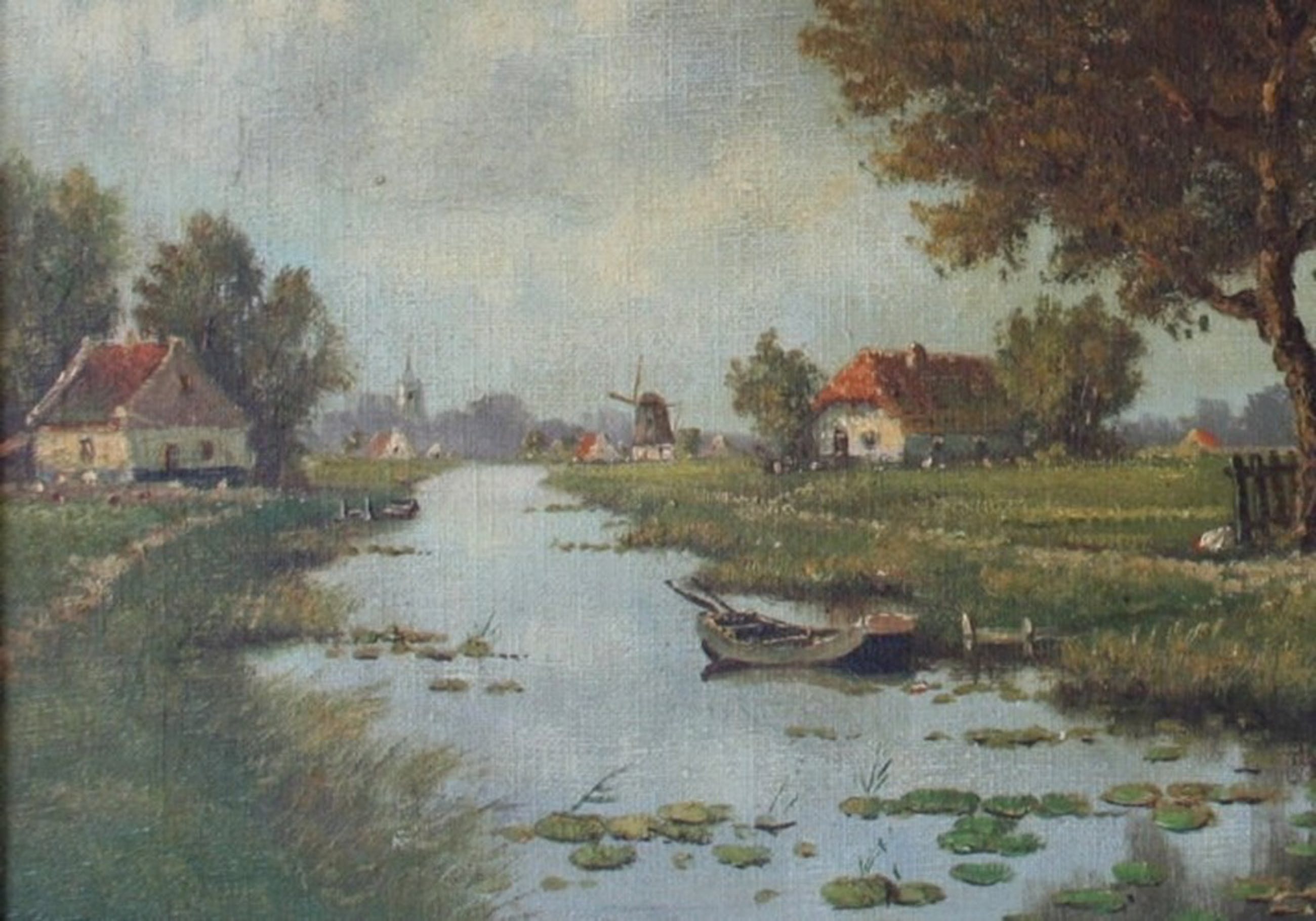 Albert Torringa - olieverf op doek - poldertafereel met huizen langs het water. Gesigneerd. Schilderij in een houten lijst.