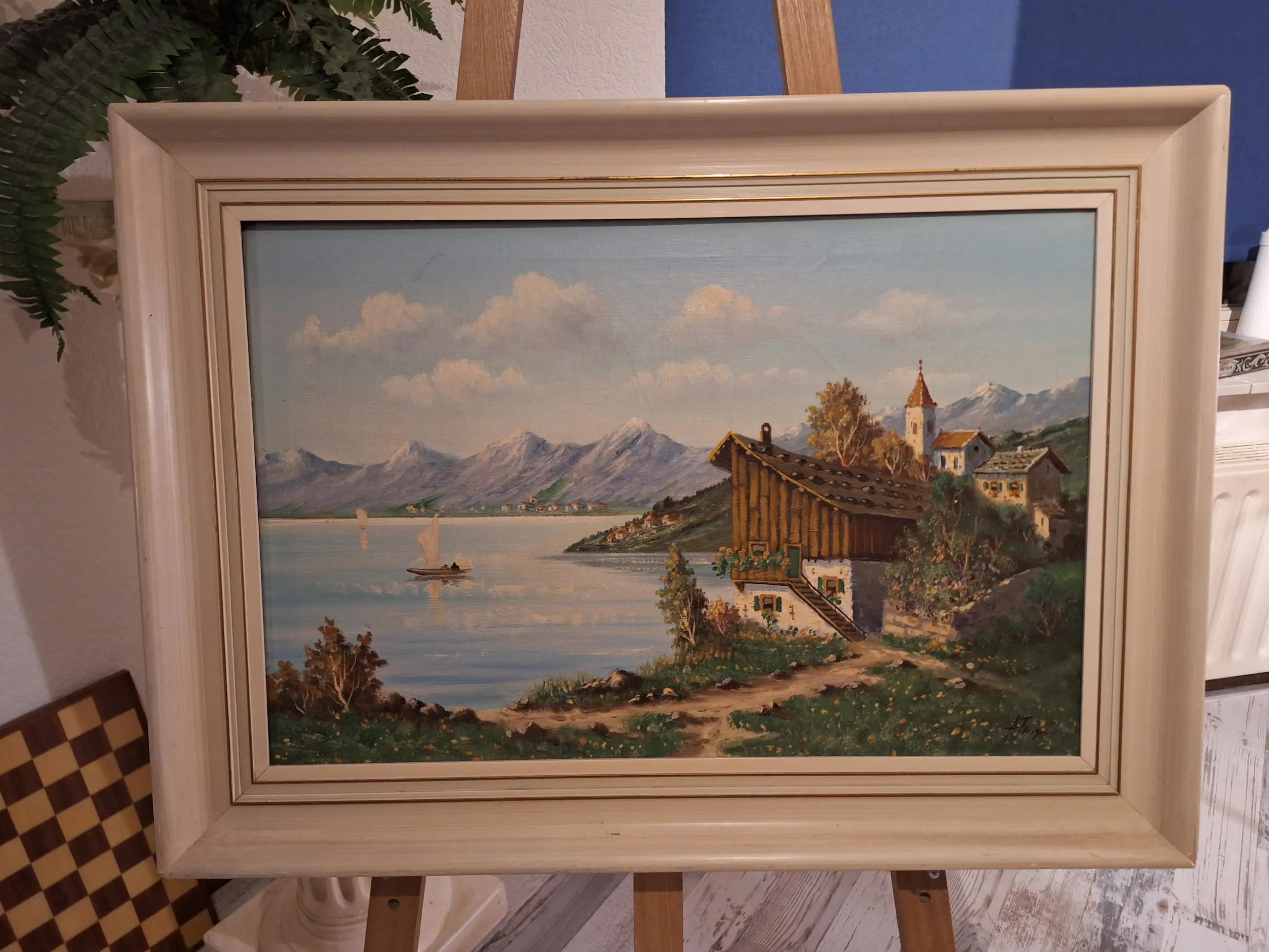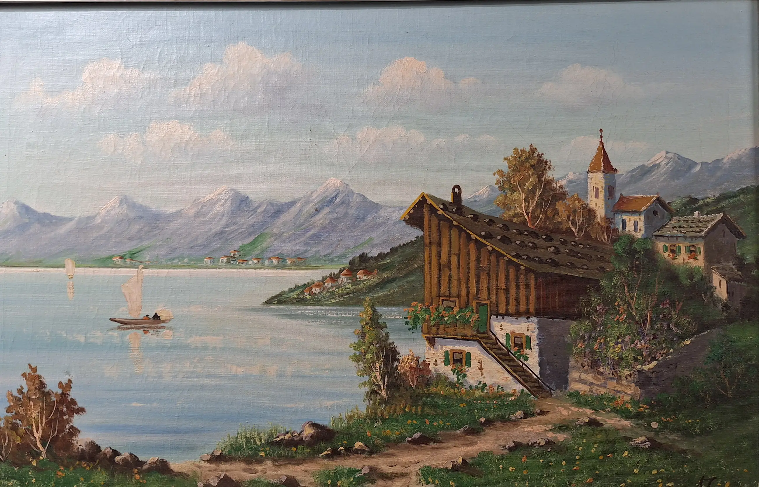 Albert Torringa de schilder uit Haarlem overleden te Bloemendaal was stukadoor en heeft zich het schilderen eigen gemaakt. Dit werk is mooi en royaal opgezet in mooie kleuren zicht op het meer van Geneve met dorp op de voorgrond en dorpjes in de verte Albert schilderde vele vergezichten en stadsgezichten en heeft een RKD vermelding de bijbel voor de kunstenaar Het werk is gezien de leeftijd in redelijke staat doek maat 40 x 60 cm met lijst 73 x 53 cm